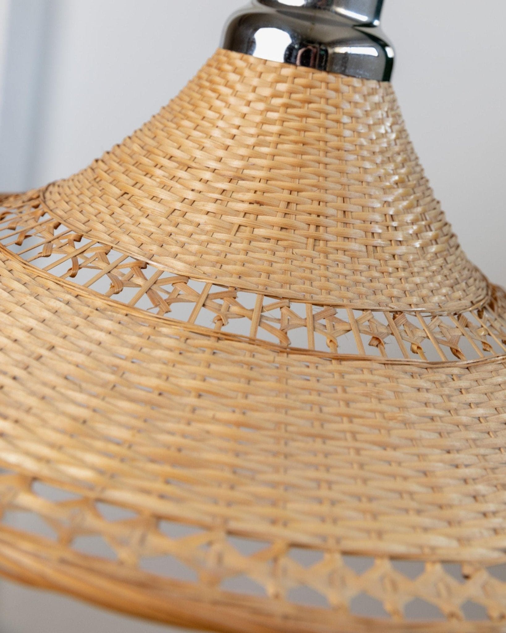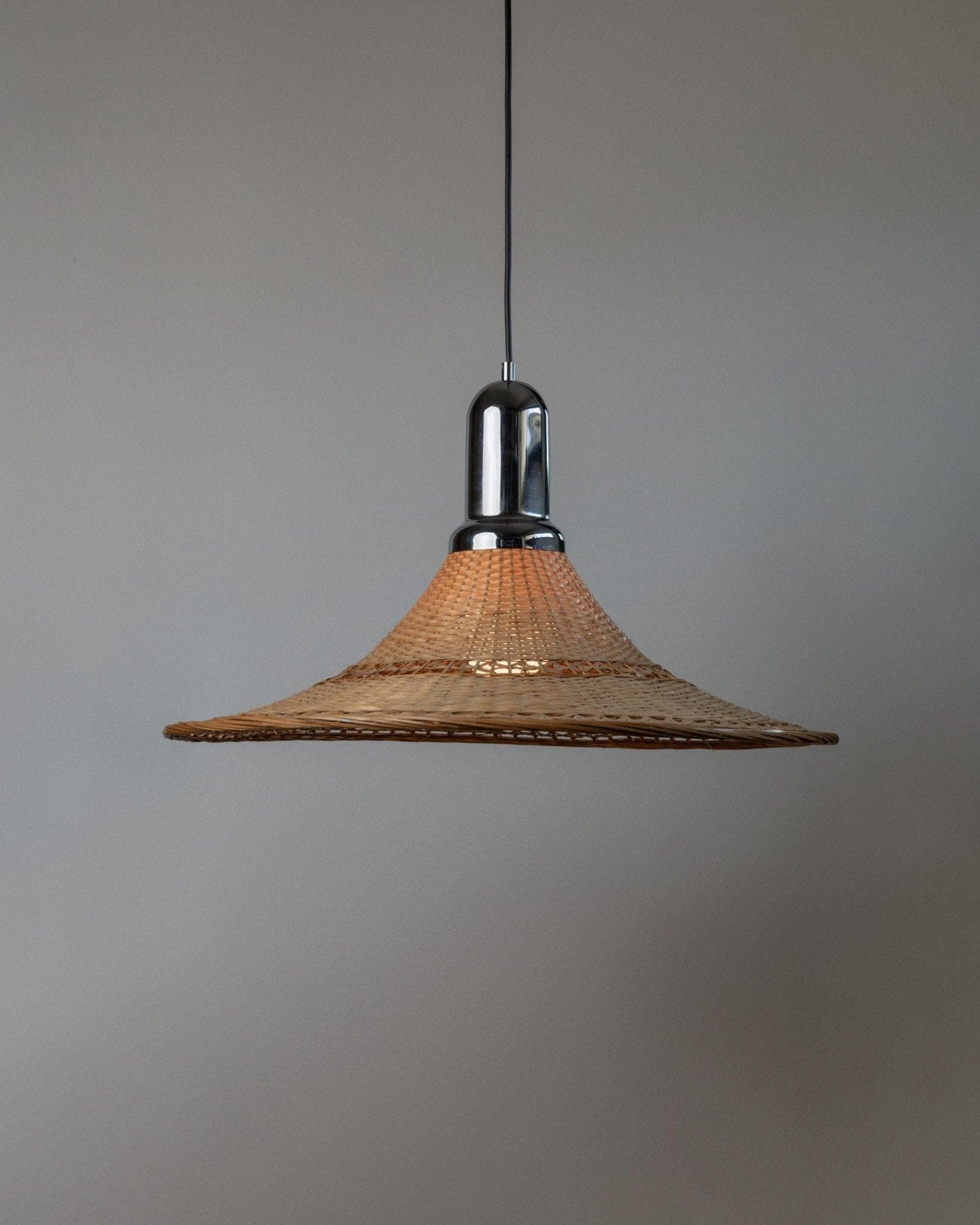 Découvrez le charme des années 1970 avec cette superbe lampe panier vintage au design Space Age Mid-Century Modern italien. L'alliance d'un panier finement tressé et d'un chrome brillant confère à cette lampe une élégance exceptionnelle, la transformant en pièce maîtresse de toute pièce. Sa forme tulipe assure une diffusion harmonieuse de la lumière et crée une ambiance chaleureuse et accueillante, idéale pour la cuisine ou la salle à manger. Cette lampe est non seulement une déclaration d'élégance, mais aussi un véritable témoignage de l'histoire du design, d'une qualité exceptionnelle.