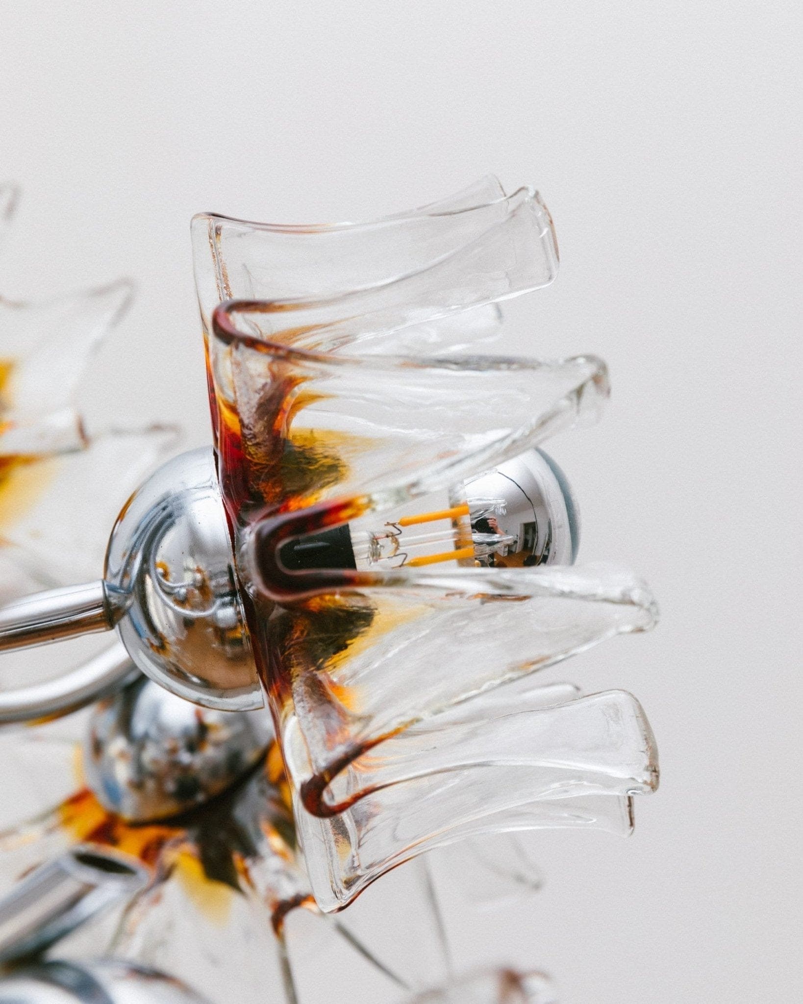 Revivez la magie des années 1970 avec ce superbe lustre vintage signé Carlo Nason pour Mazzega. Son design emblématique allie l'esthétique Space Age au glamour du style Hollywood Regency, faisant de cette pièce un véritable accroche-regard dans n'importe quelle pièce. Les 11 fleurs en verre de Murano fabriquées à la main, aux tons transparents et brun-orangé, créent des reflets de lumière fascinants et une atmosphère chaleureuse et accueillante. L'alliance du chrome et du verre de haute qualité dégage une qualité exceptionnelle et une élégance intemporelle.