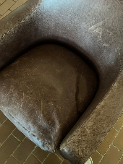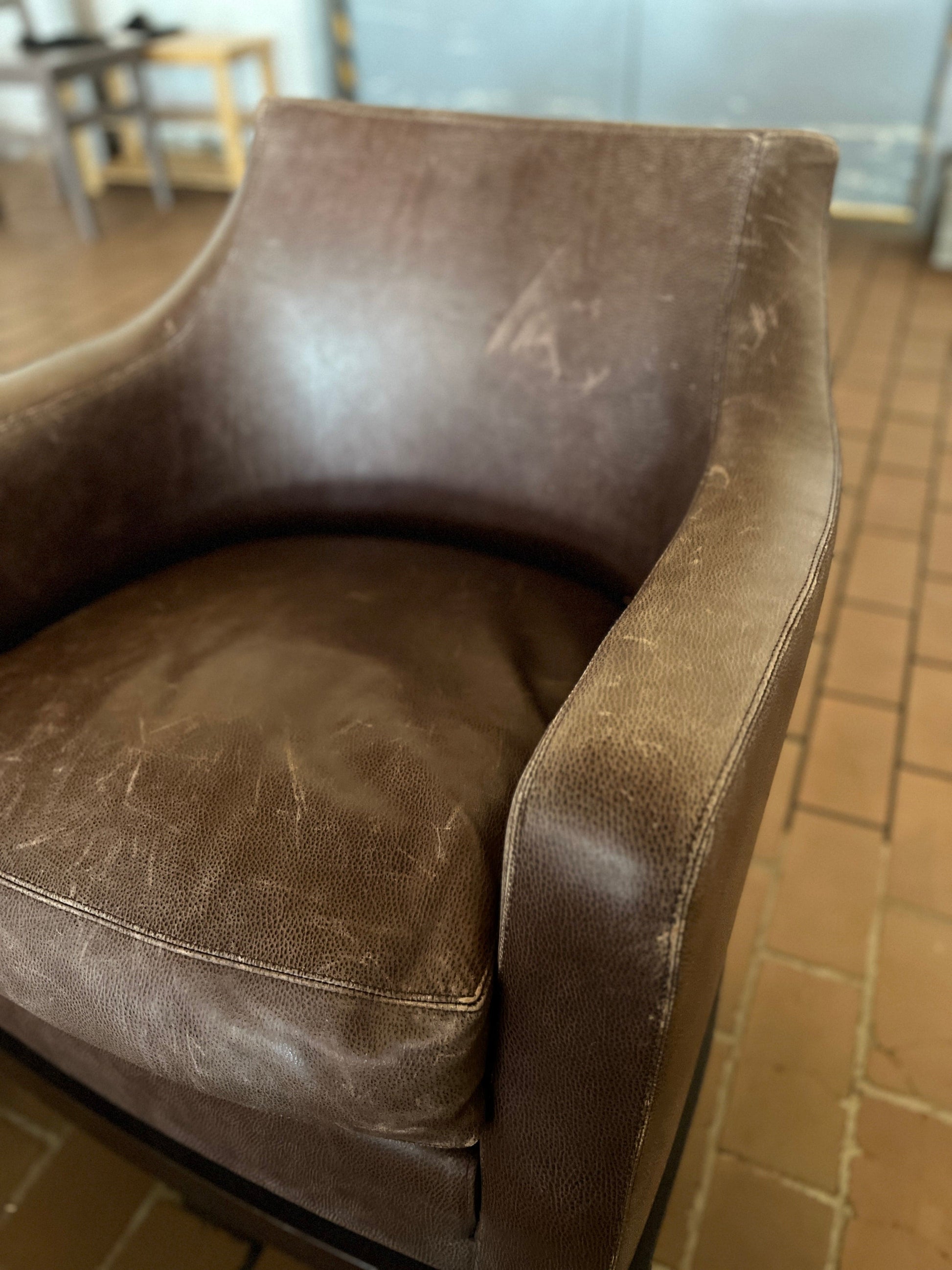 Un fauteuil vintage en cuir à la présence discrète. Ses courbes douces et ses proportions harmonieuses évoquent le charme du milieu du siècle, subtilement teinté d'influences futuristes. Le cuir brun apporte chaleur et profondeur à la pièce. Sa forme invite à la détente sans encombrer l'espace. Matériaux authentiques, construction robuste, design intemporel. En tant que fauteuil de lecture, dans le salon ou pièce maîtresse, il s'intègre harmonieusement tout en affirmant sa présence. Un fauteuil pour ceux qui apprécient la substance et la clarté. Son design fait référence aux classiques sans tomber dans la nostalgie. Une affirmation discrète qui apporte chaleur et structure à son environnement.