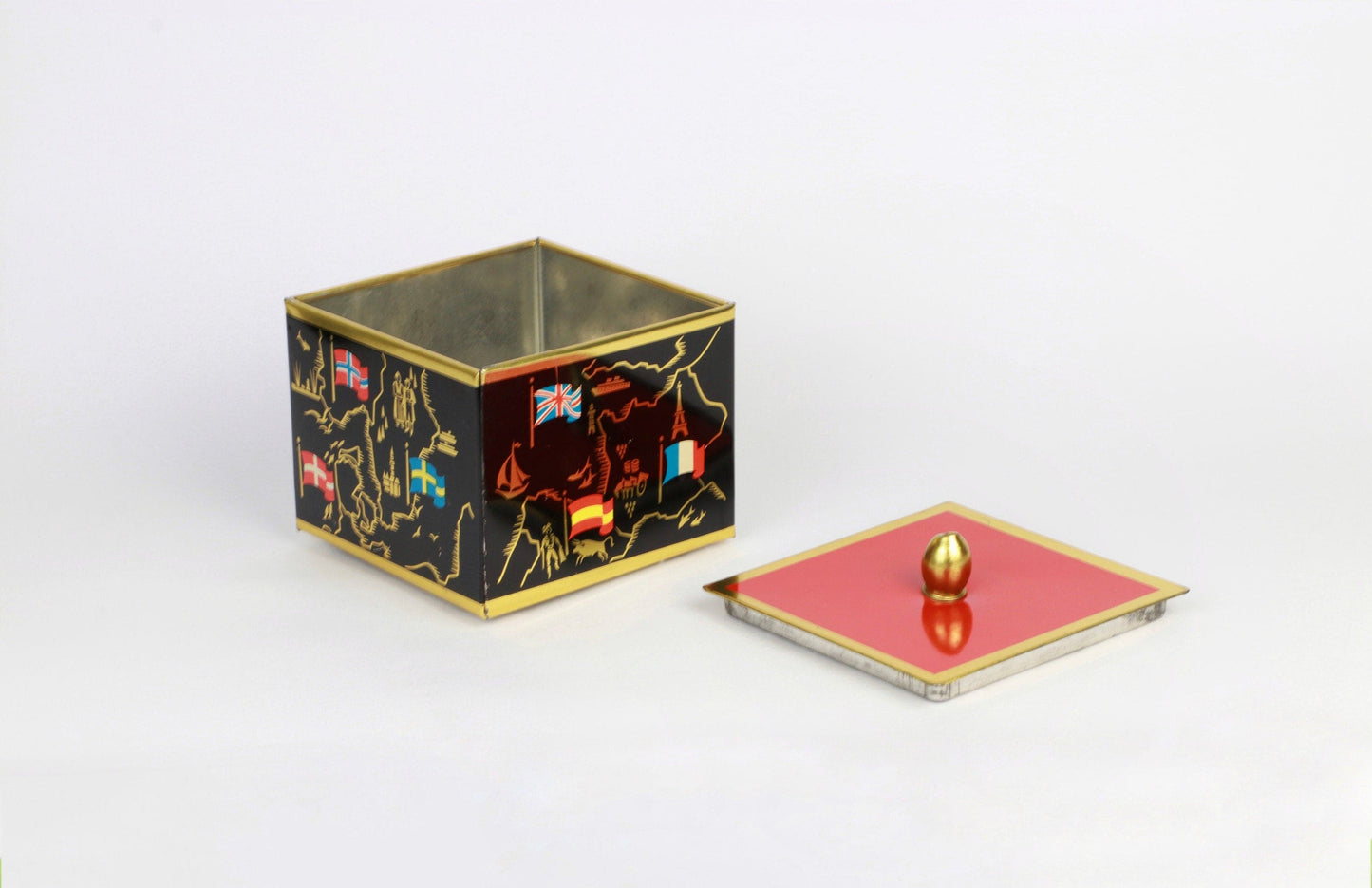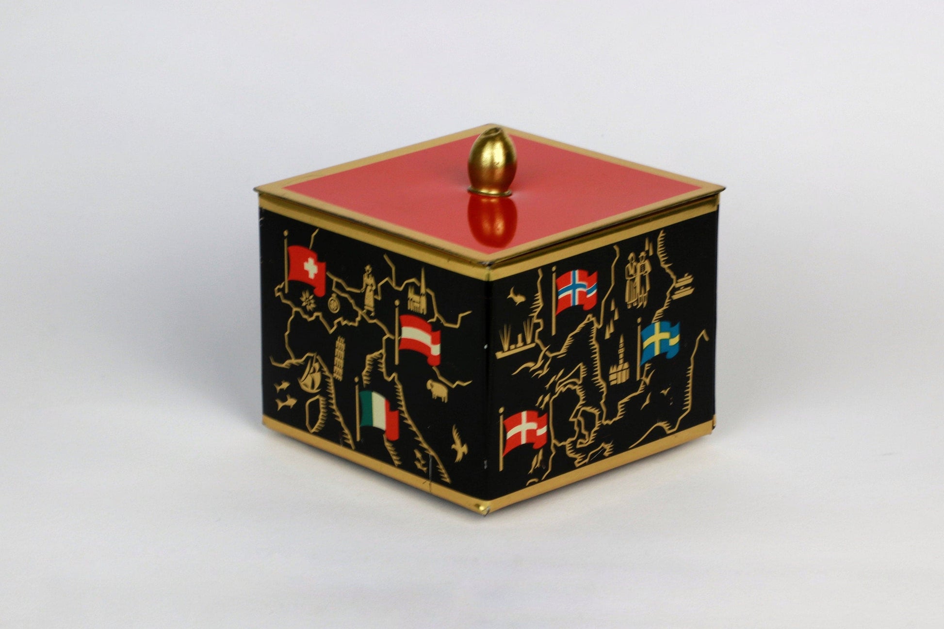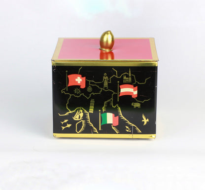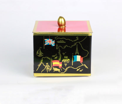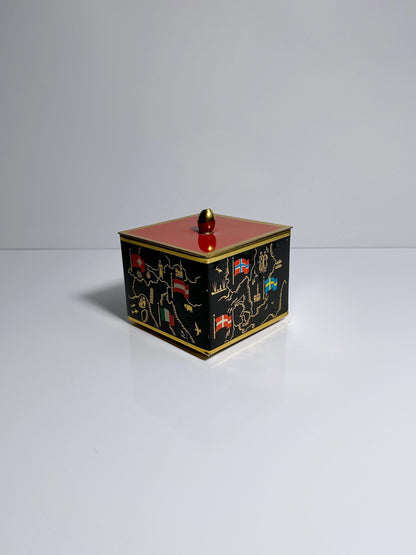 Bonbonnière en métal vintage du milieu du siècle noir orange rouge drapeaux européens dorés