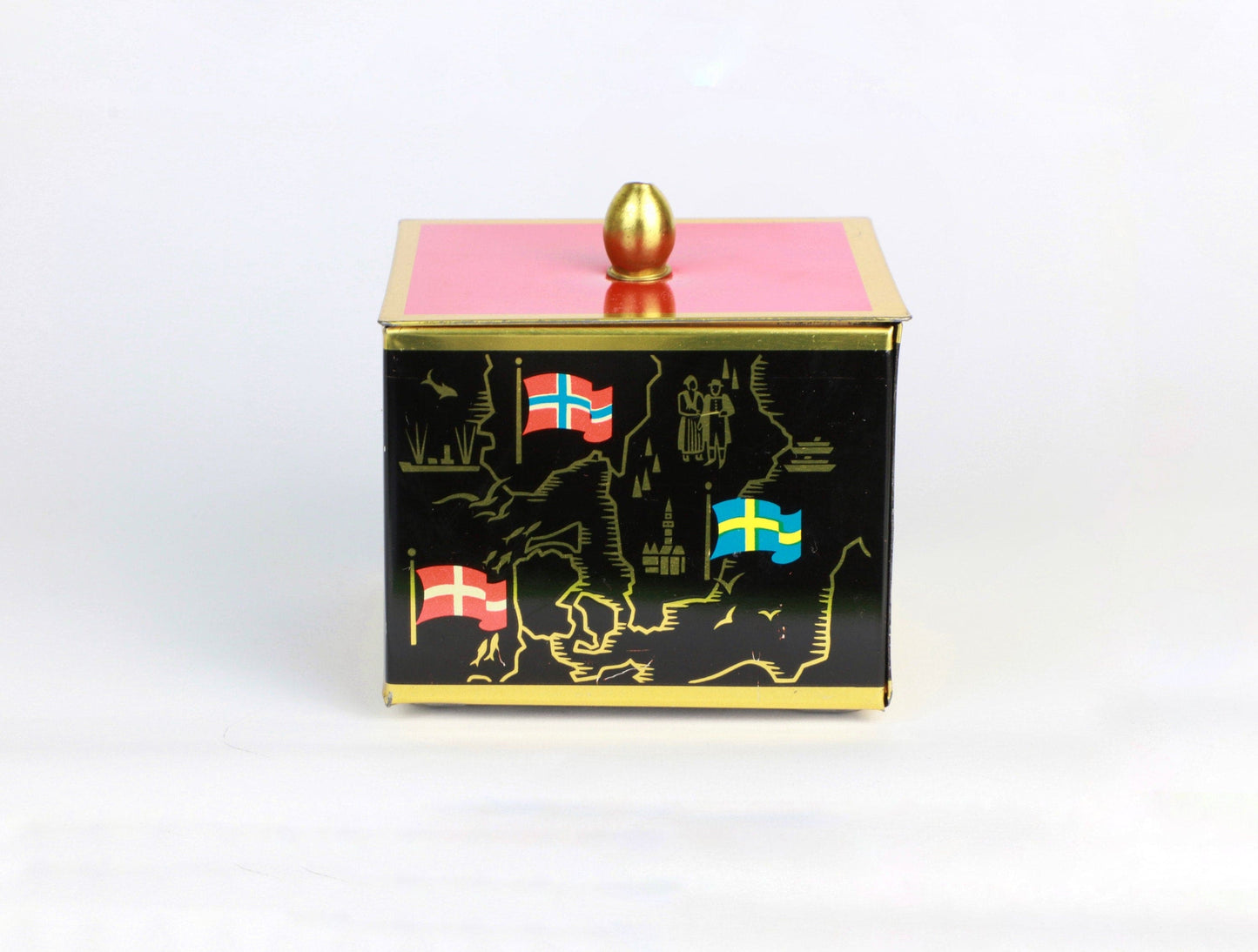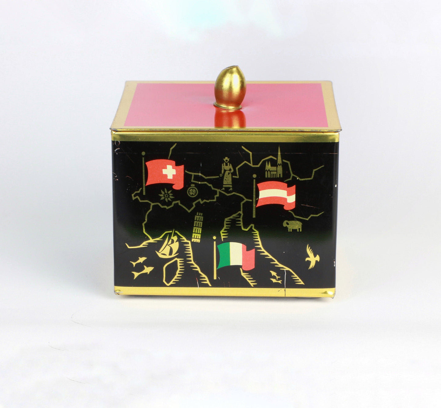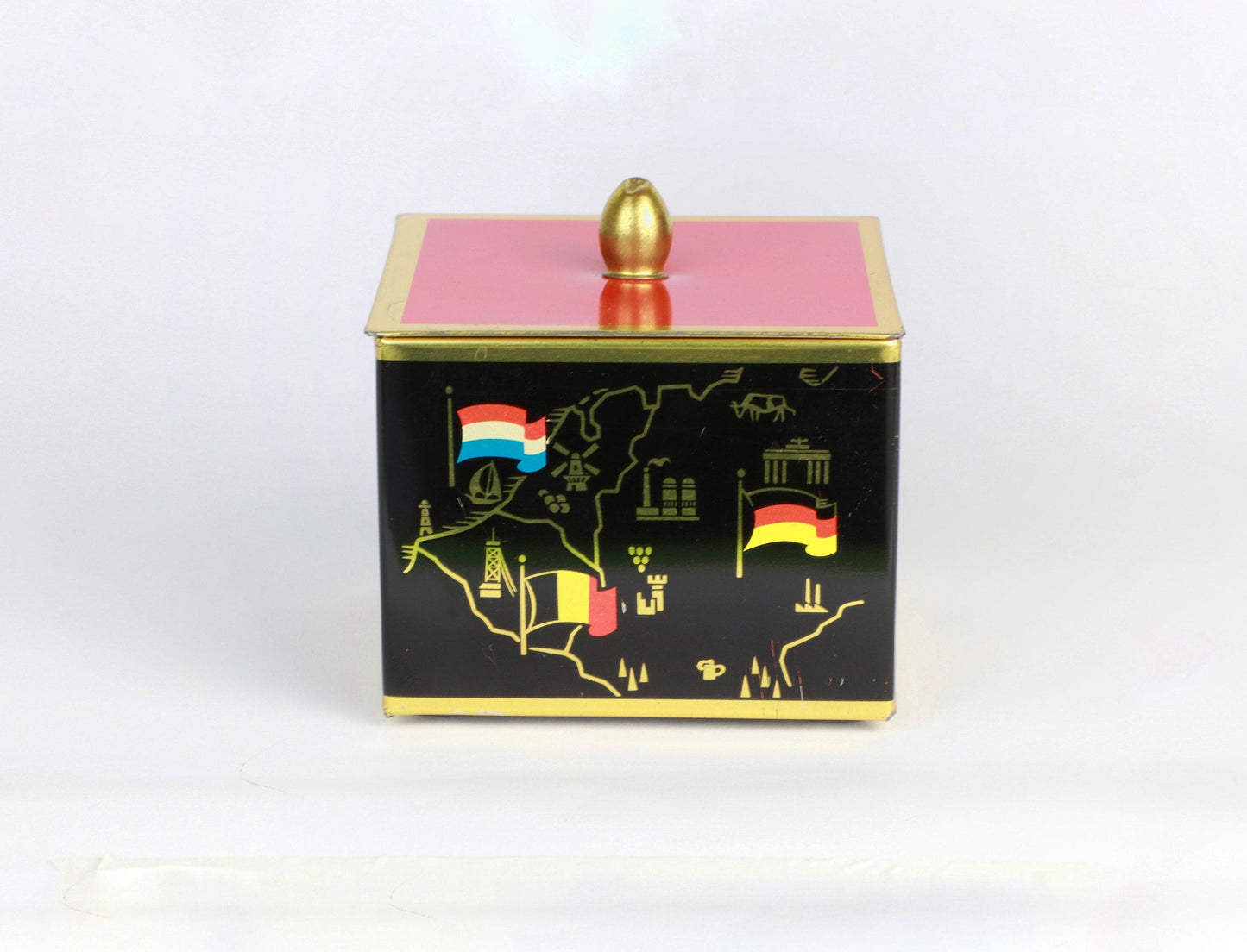 Bonbonnière en métal vintage du milieu du siècle noir orange rouge drapeaux européens dorés