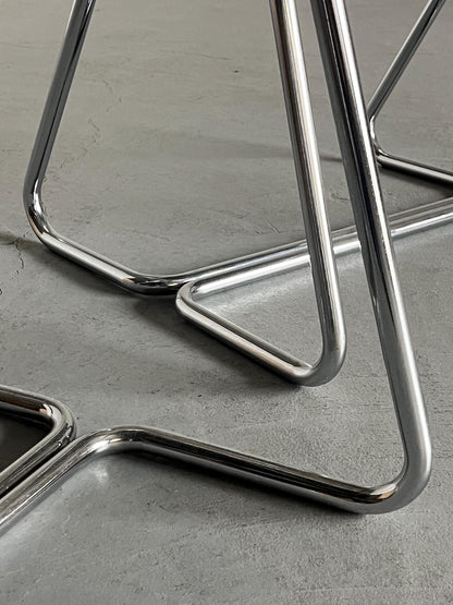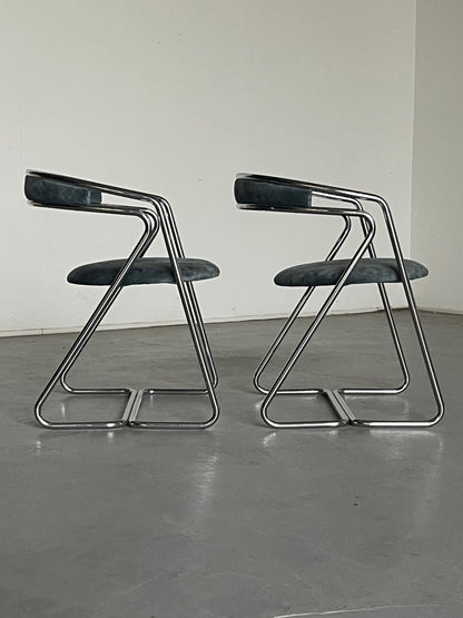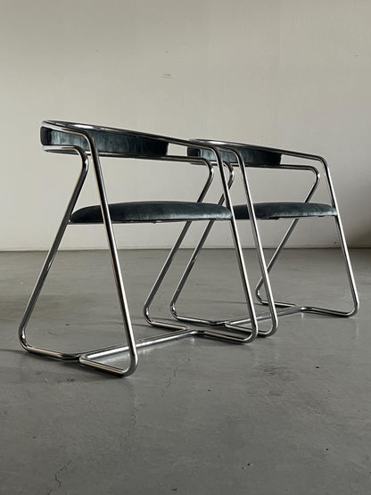 Découvrez le charme des années 1970 avec ce fauteuil vintage moderne du milieu du siècle. Cette élégante chaise, l'une des quatre, a été fabriquée en Italie et impressionne par son design intemporel. La chaise a été recouverte d'un tissu velouté d'un bleu-gris délicat, lui donnant une touche luxueuse. La structure incurvée en acier chromé confère à la chaise une esthétique à la fois moderne et classique.