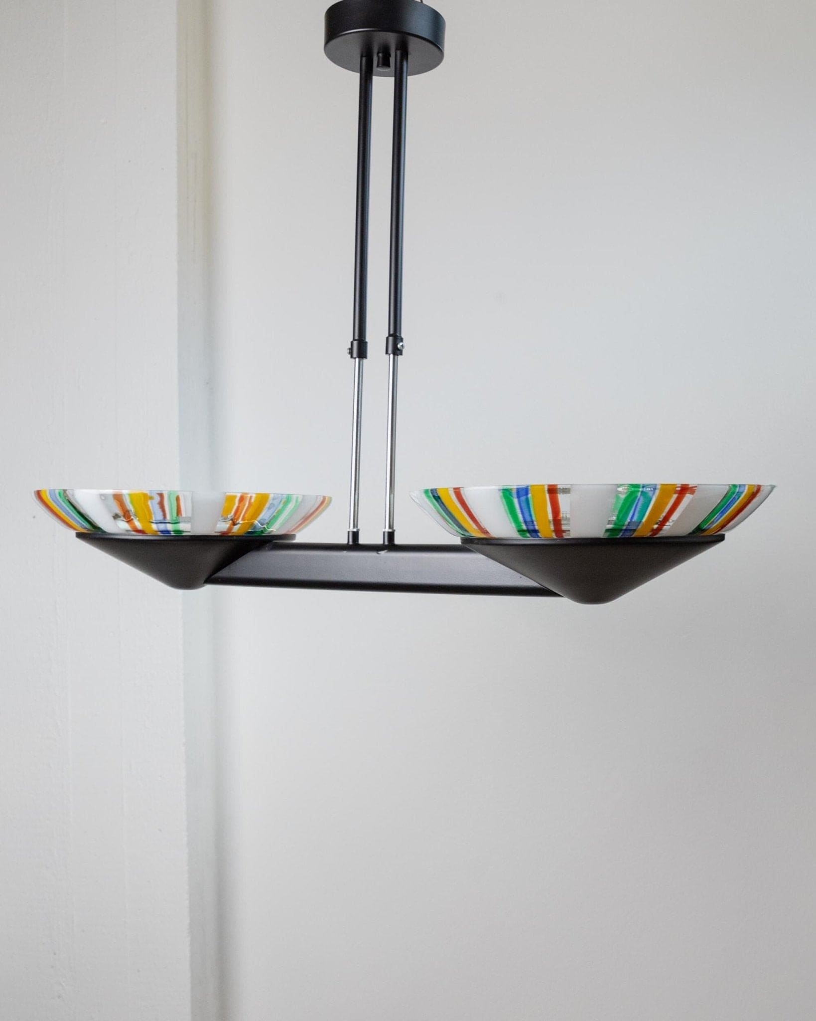 Découvrez un véritable joyau du design Space Age avec ce lustre vintage XXL en verre de Murano de style Memphis des années 1980. L'association d'une structure en métal noir minimaliste et de deux grands abat-jour en verre de Murano aux rayures colorées fait de ce luminaire une pièce maîtresse saisissante. La tension géométrique entre la structure graphique et la douce lumière du verre crée un équilibre fascinant et attire tous les regards. Idéal comme point focal dans une salle à manger, un studio ou un intérieur moderne, ce lustre allie fonctionnalité et design sculptural au plus haut niveau.