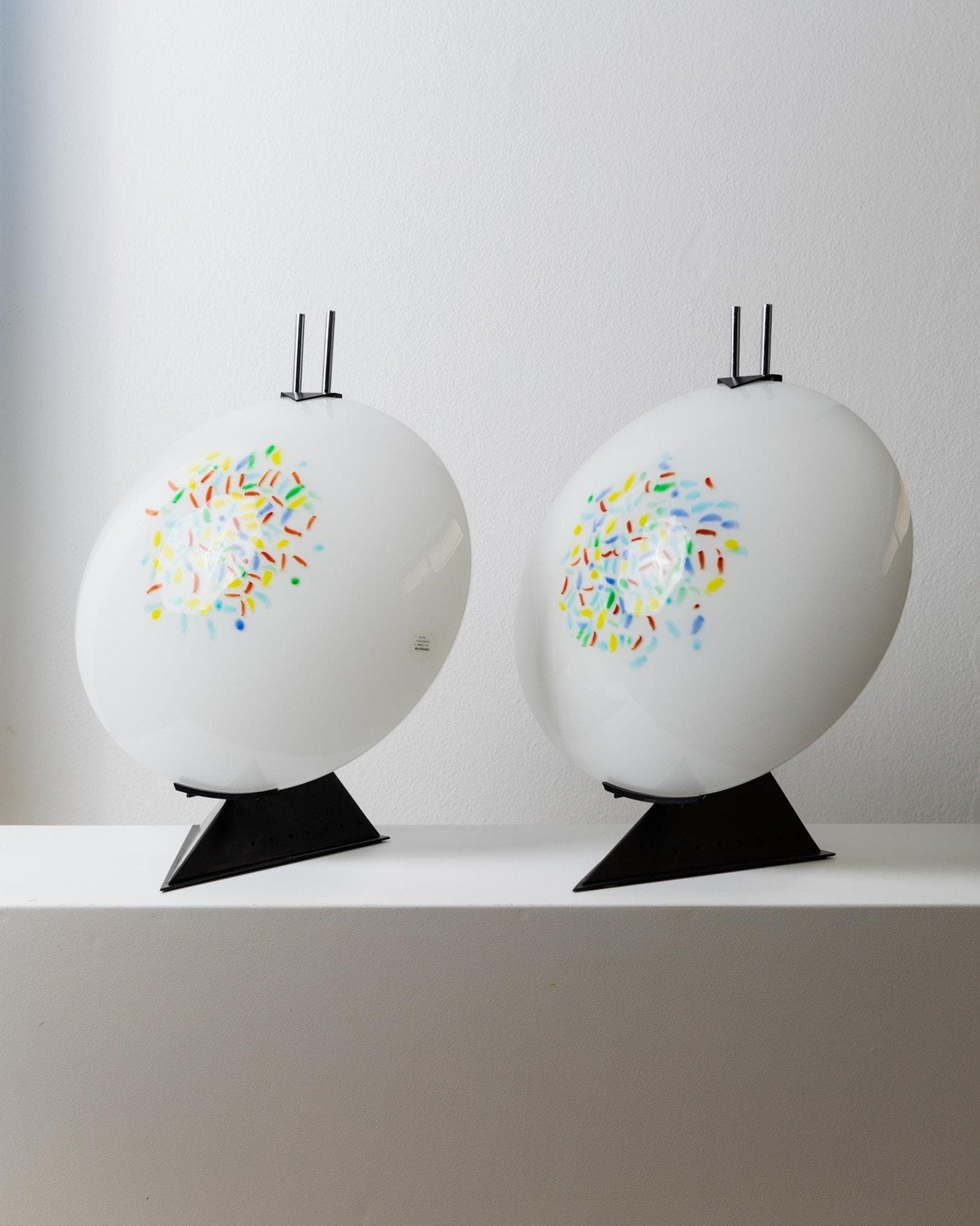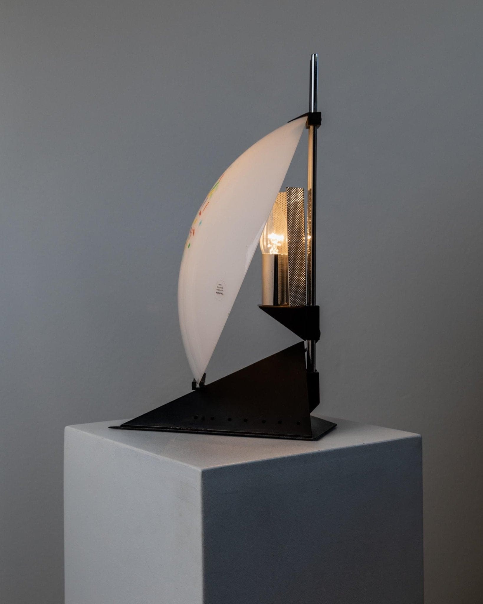 Découvrez la fascinante lampe de table vintage en verre de Murano de style Memphis, fabriquée en Italie dans les années 1980. Un véritable incontournable pour les amateurs de design moderne et futuriste du milieu du siècle. Cette lampe extraordinaire allie formes géométriques et élégance artistique pour apporter une touche italienne à votre intérieur. L'association d'un pied triangulaire en métal noir et d'un abat-jour rond en verre opale, agrémenté de touches colorées, en fait un véritable accroche-regard. Idéale comme veilleuse originale ou comme cadeau original pour les amateurs de design.