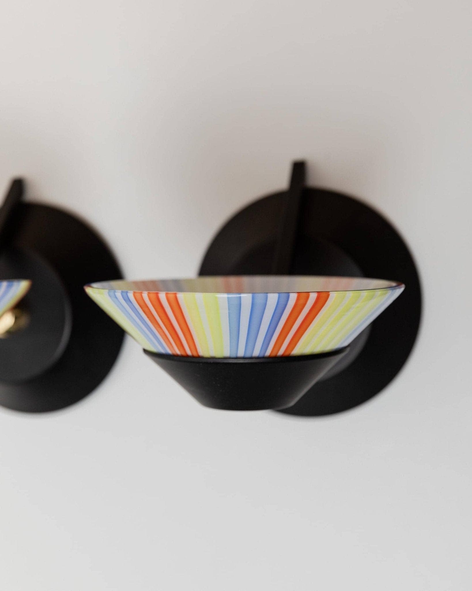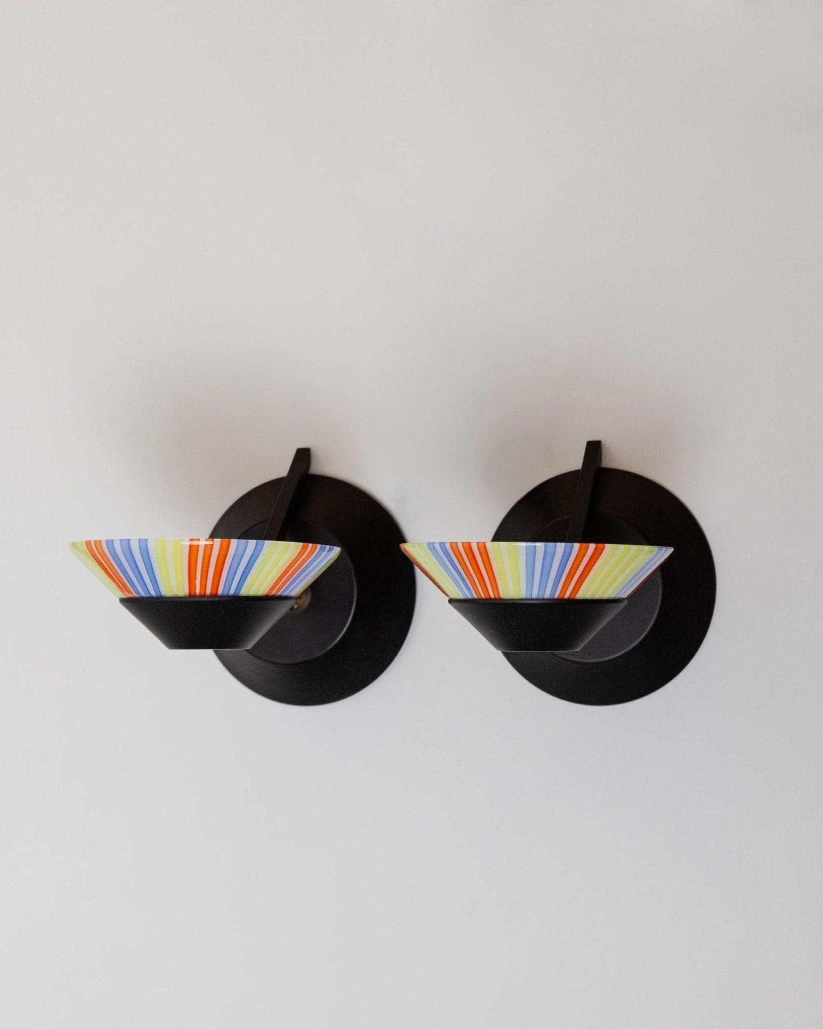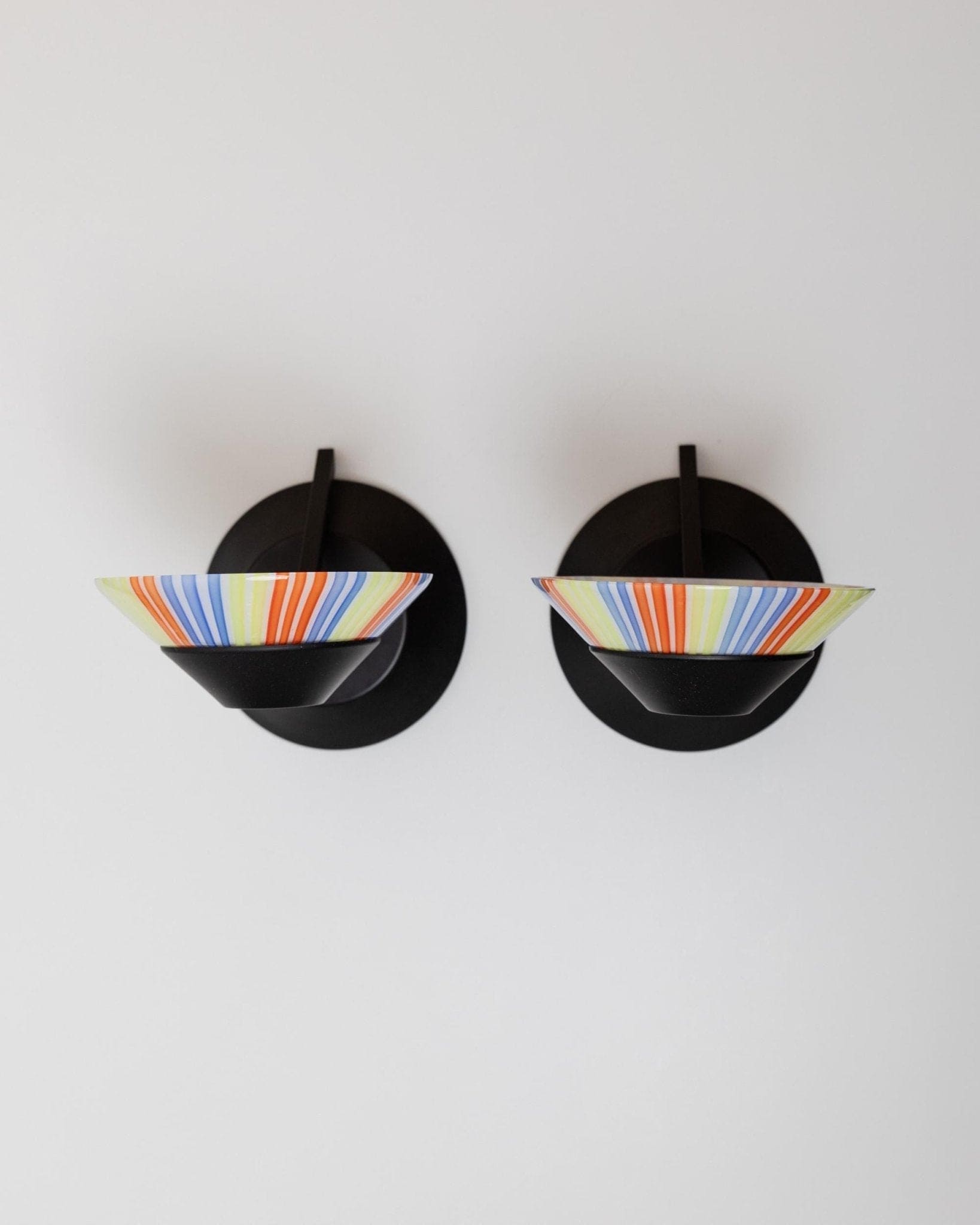 Plongez dans l'univers emblématique du design Memphis avec cet ensemble de deux appliques murales vintage en verre de Murano des années 1980. Les abat-jour en verre rayé coloré, posés sur des bases en métal noir mat, créent une impression de puissance et ajoutent instantanément du caractère à n'importe quelle pièce. Leur forme sculpturale et leur verre orné font de ces appliques murales Space Age de véritables accroche-regards ; elles apporteront une touche décorative idéale dans l'entrée, le salon ou près du lit. Un cadeau exceptionnel pour les amateurs de design et les collectionneurs d'objets modernes du milieu du siècle.