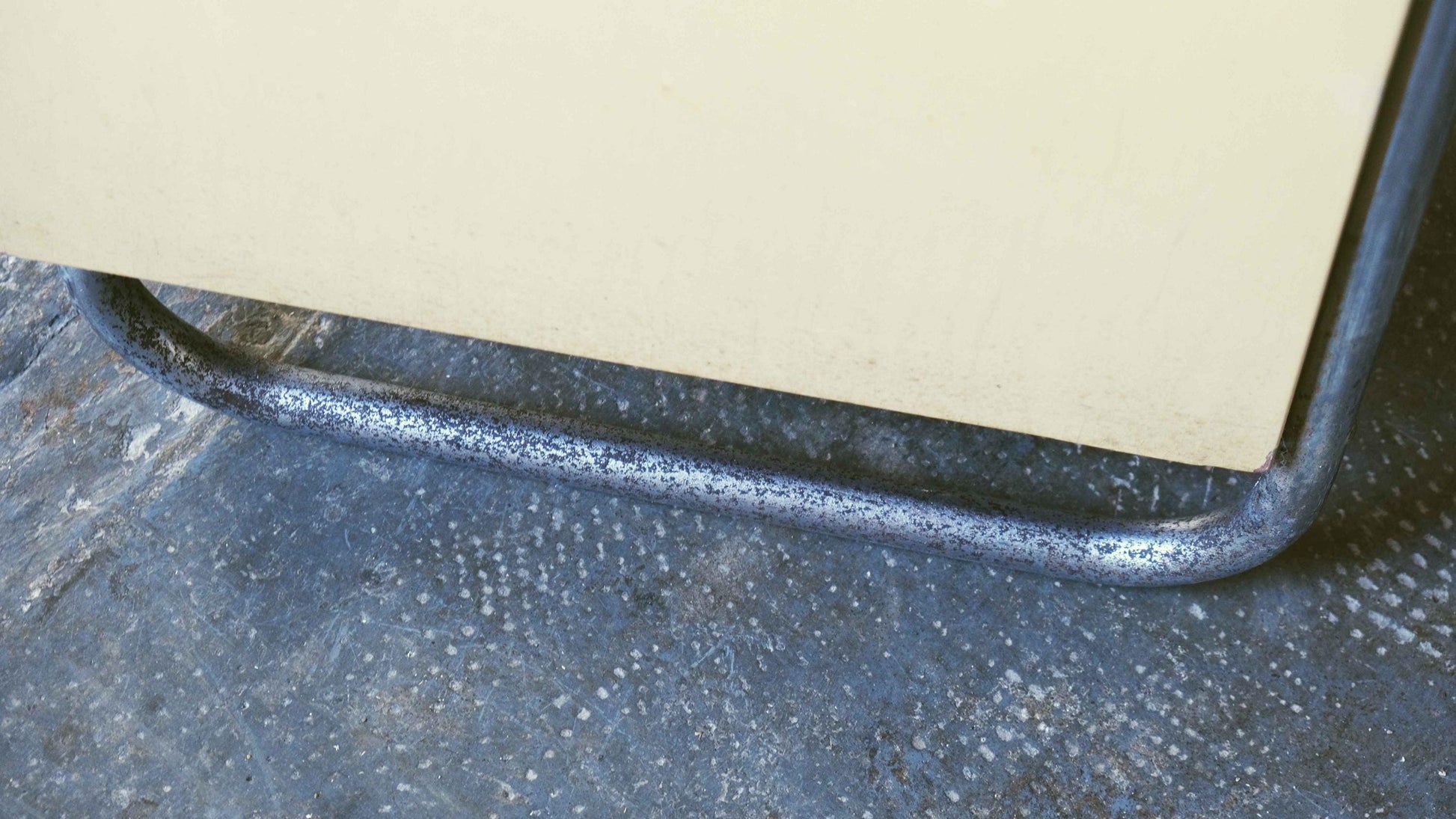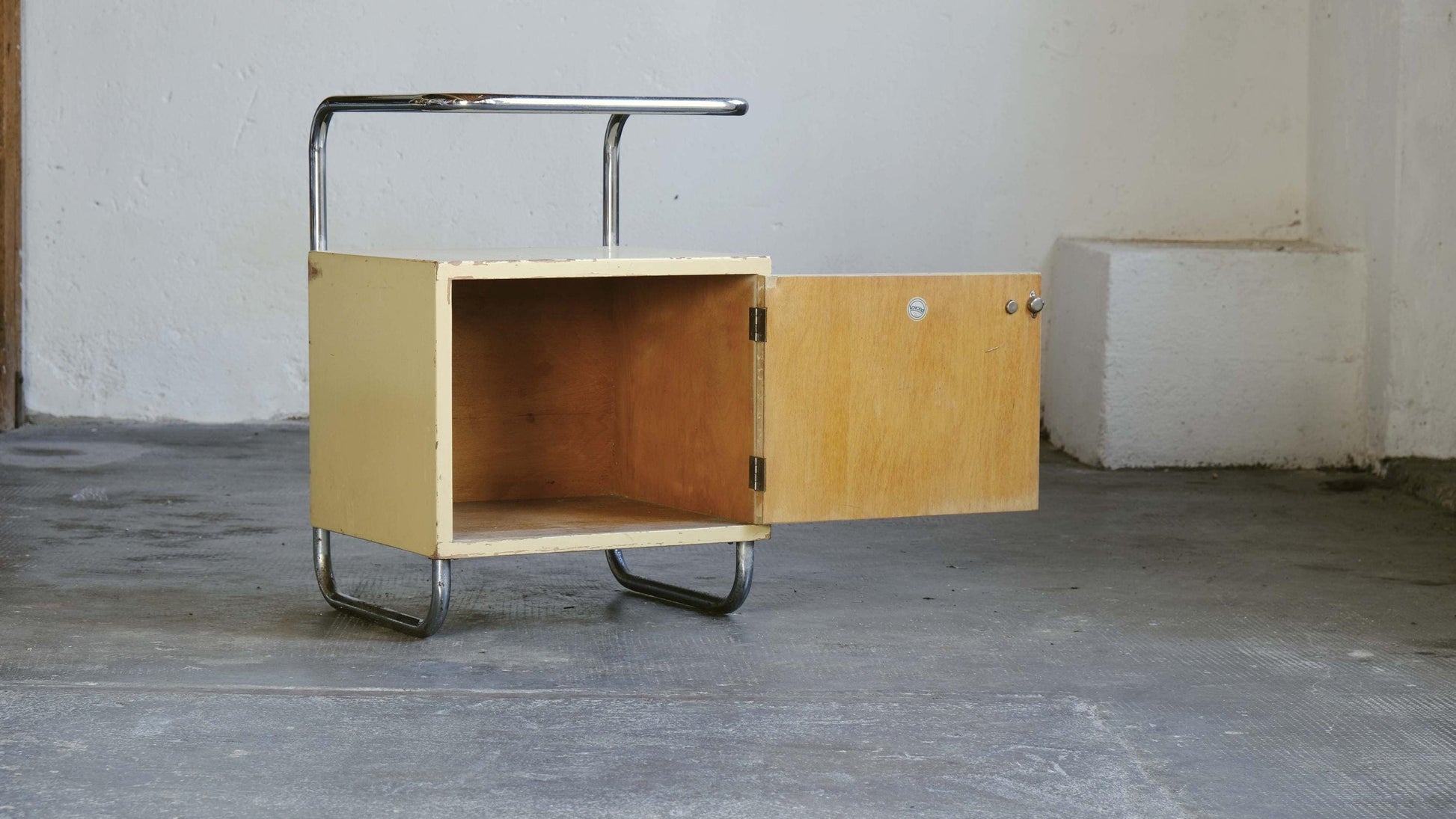 Table de chevet de style Bauhaus des années 1950 ou 1960, dans son état d'origine, avec une finition couleur ivoire/sable. Les éléments en bois sont globalement bien conservés ; quelques dommages au placage (voir photos), ainsi que des traces d'usure et des taches sur la peinture, sont visibles. Le cadre en tube d'acier chromé présente une corrosion importante dans sa partie inférieure. Le plateau en verre est manquant, mais peut être fabriqué et fourni sur demande.