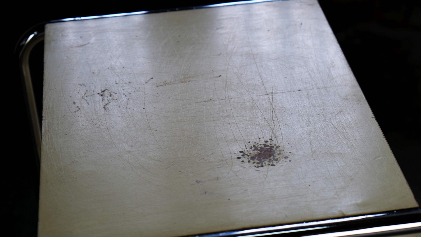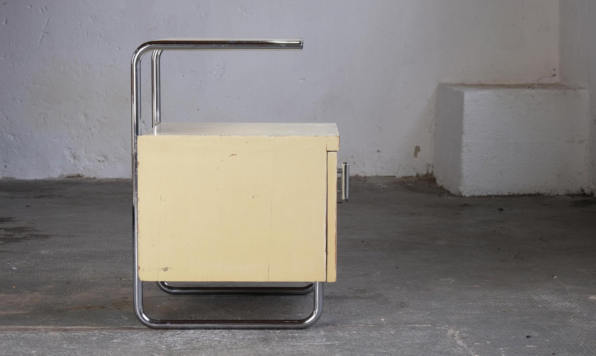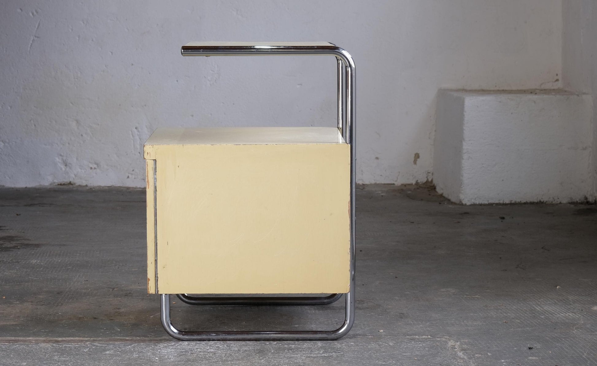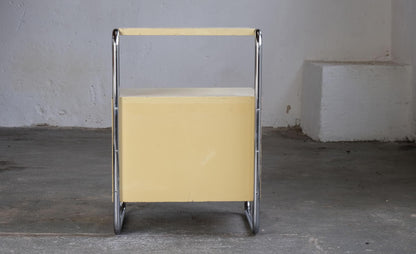 Une rare table de chevet Bauhaus de Mücke Melder, probablement des années 1930, dont le chromage est exceptionnellement bien conservé. Les surfaces du cube en bois présentent des signes évidents d'usure. Il s'agit probablement de sa peinture d'origine ; quelques vis ont été remplacées.