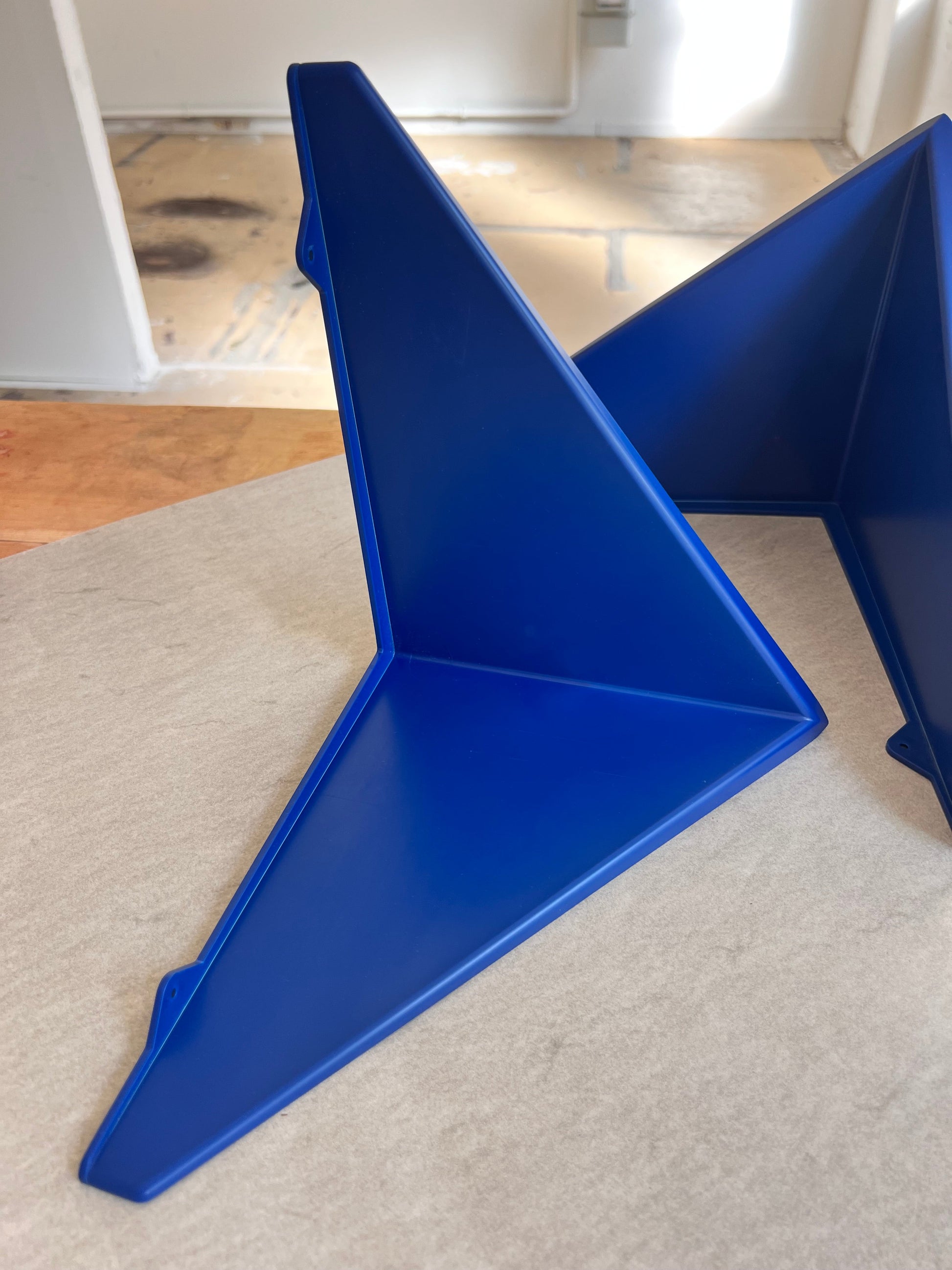 Découvrez l'emblématique ensemble de deux étagères « Butterfly » bleues, conçues par Paul Cadovius dans les années 1970. Leur design unique, rappelant un papillon, fait de ces étagères un véritable accroche-regard dans un style Space Age. Décoratives, elles sont aussi extrêmement pratiques : parfaites pour exposer avec élégance petits objets, livres ou objets de décoration. Ces étagères sont inutilisées et n'ont jamais été fixées au mur.