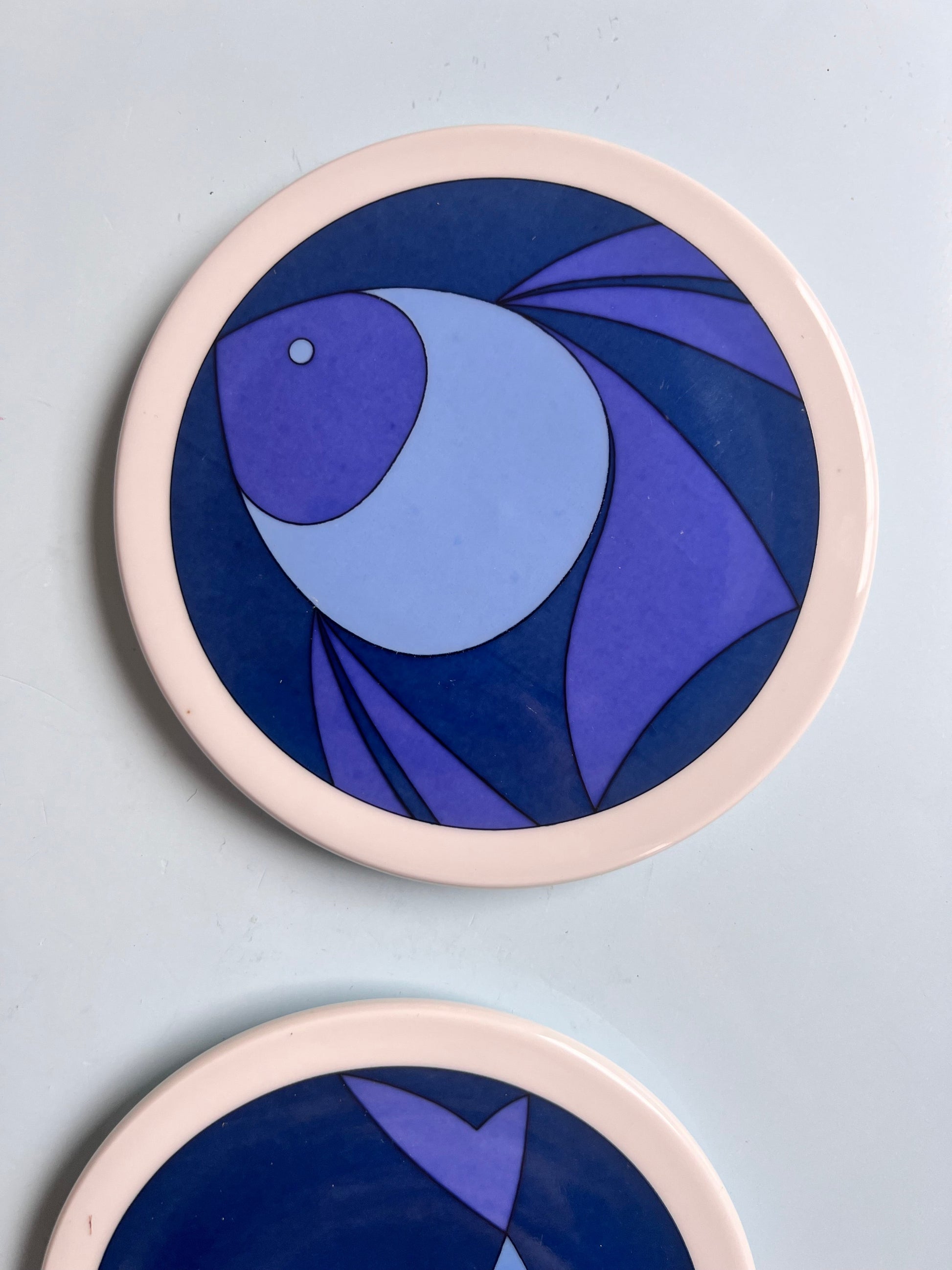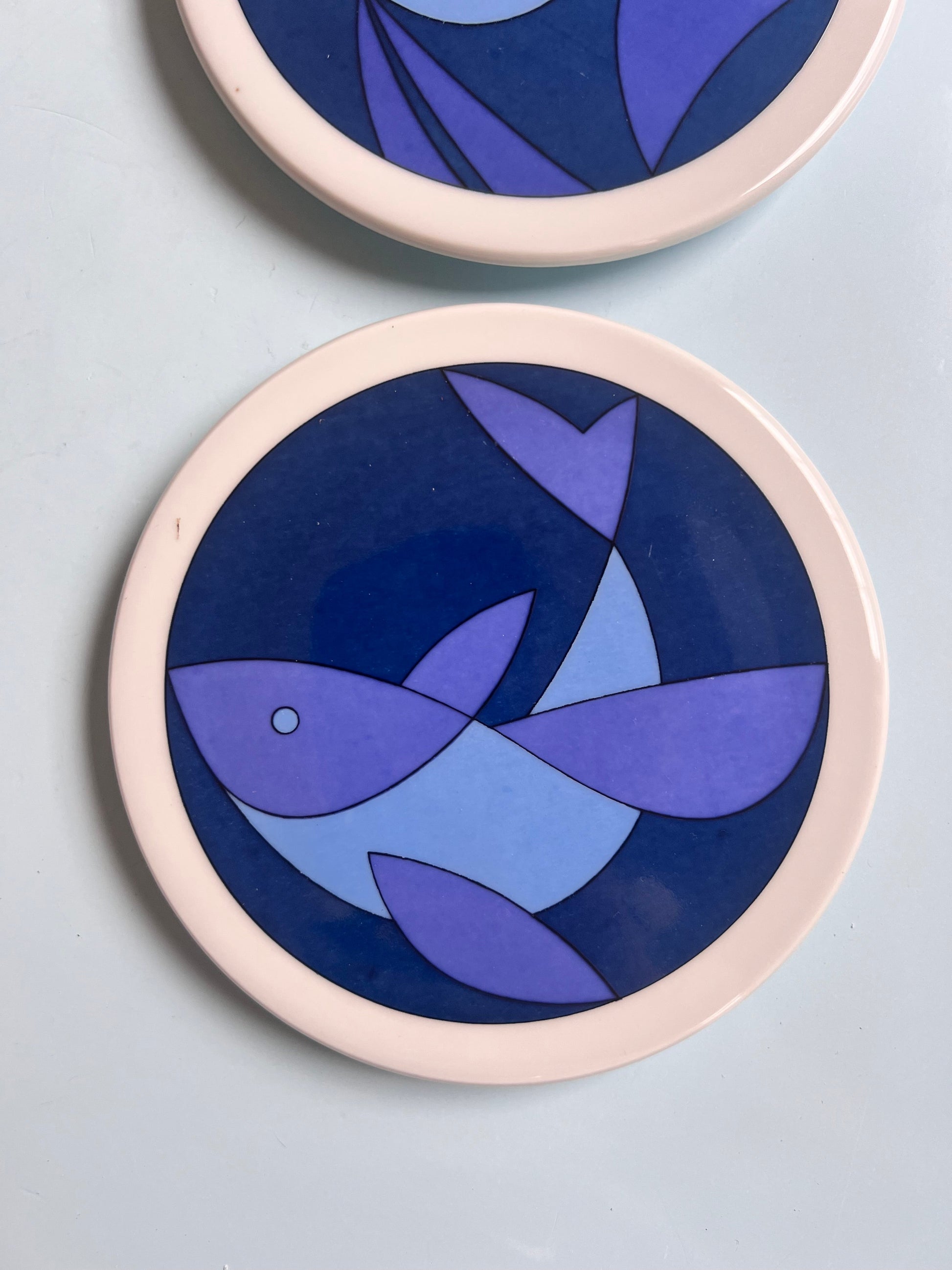 Découvrez le charmant ensemble de deux assiettes vintage bleues de collection, conçu par Ib Antoni pour Bing & Grøndahl. Ces assiettes murales uniques, issues de la célèbre série animalière des années 1970, arborent des motifs de poissons détaillés, portant les numéros de modèle 3769 et 3770. Objets de collection, elles constituent également d'élégantes touches décoratives sur les tables ou les murs. Grâce à leurs petits trous au dos, elles peuvent être facilement accrochées ou utilisées comme dessous de verre.
