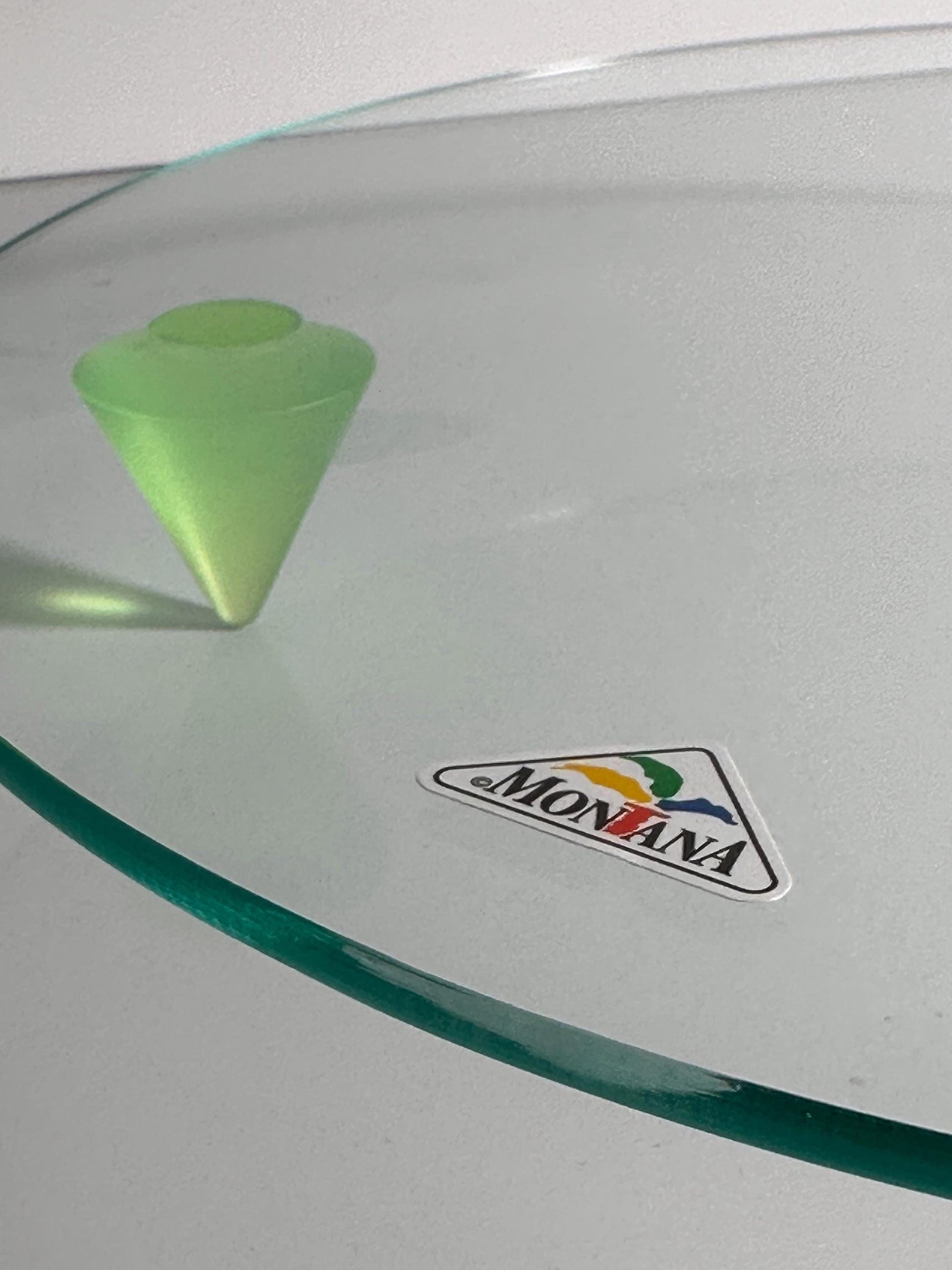 Découvrez l'extraordinaire bol vintage de style Memphis Milano, inspiré du légendaire designer Ettore Sottsass. Ce bol signé Montana allie esthétique postmoderne et charme Space Age inimitable des années 80 et 90. Son design coloré aux accents rouges, bleus et jaunes en fait un véritable accroche-regard dans n'importe quelle pièce. L'association du verre transparent et du verre dépoli, ainsi que les pieds aux formes géométriques et aux couleurs variées, soulignent son style emblématique du milieu du siècle.