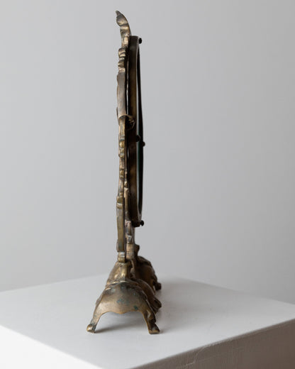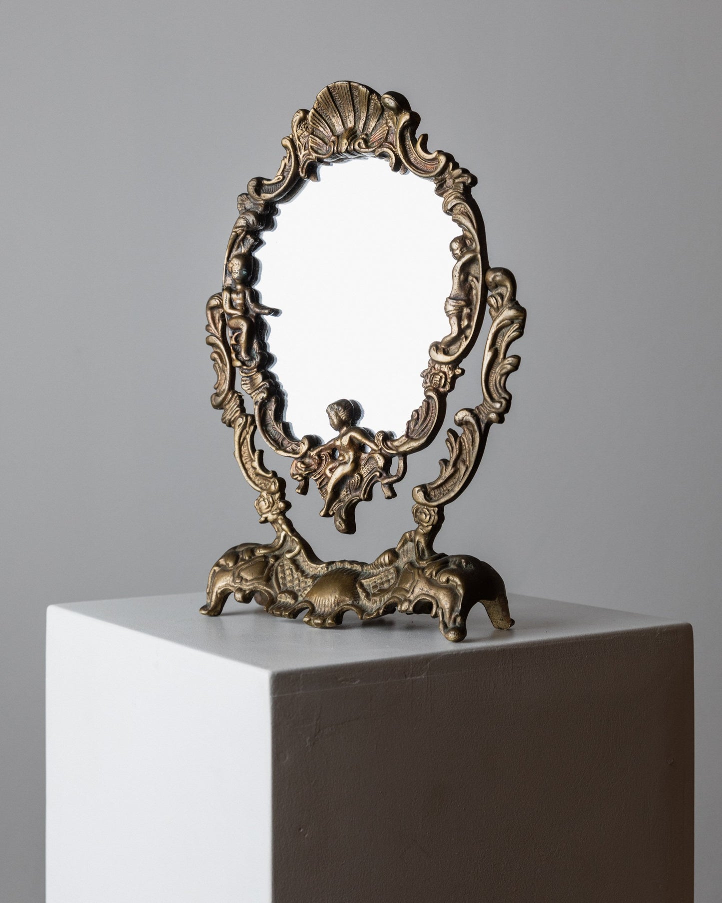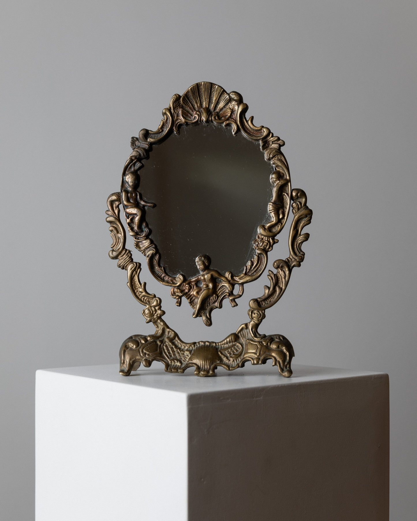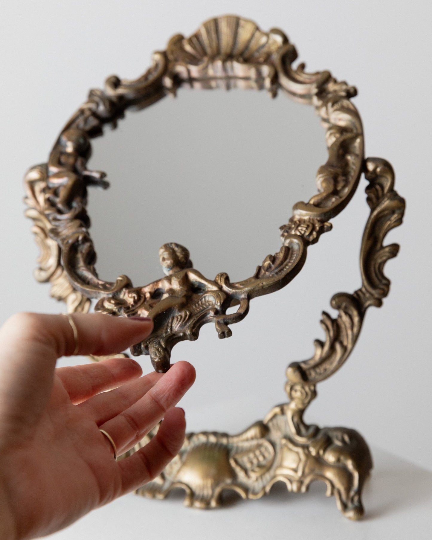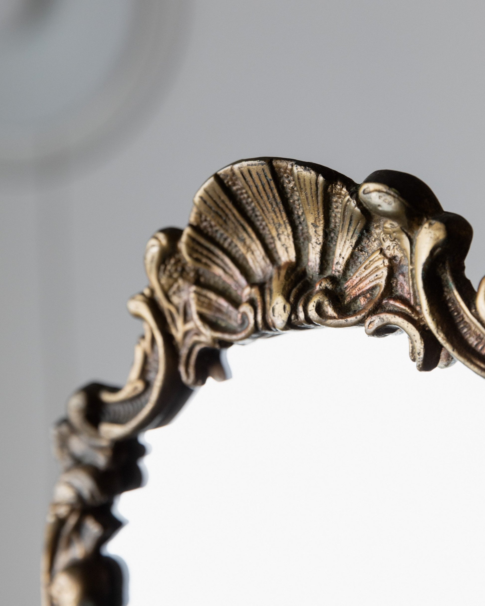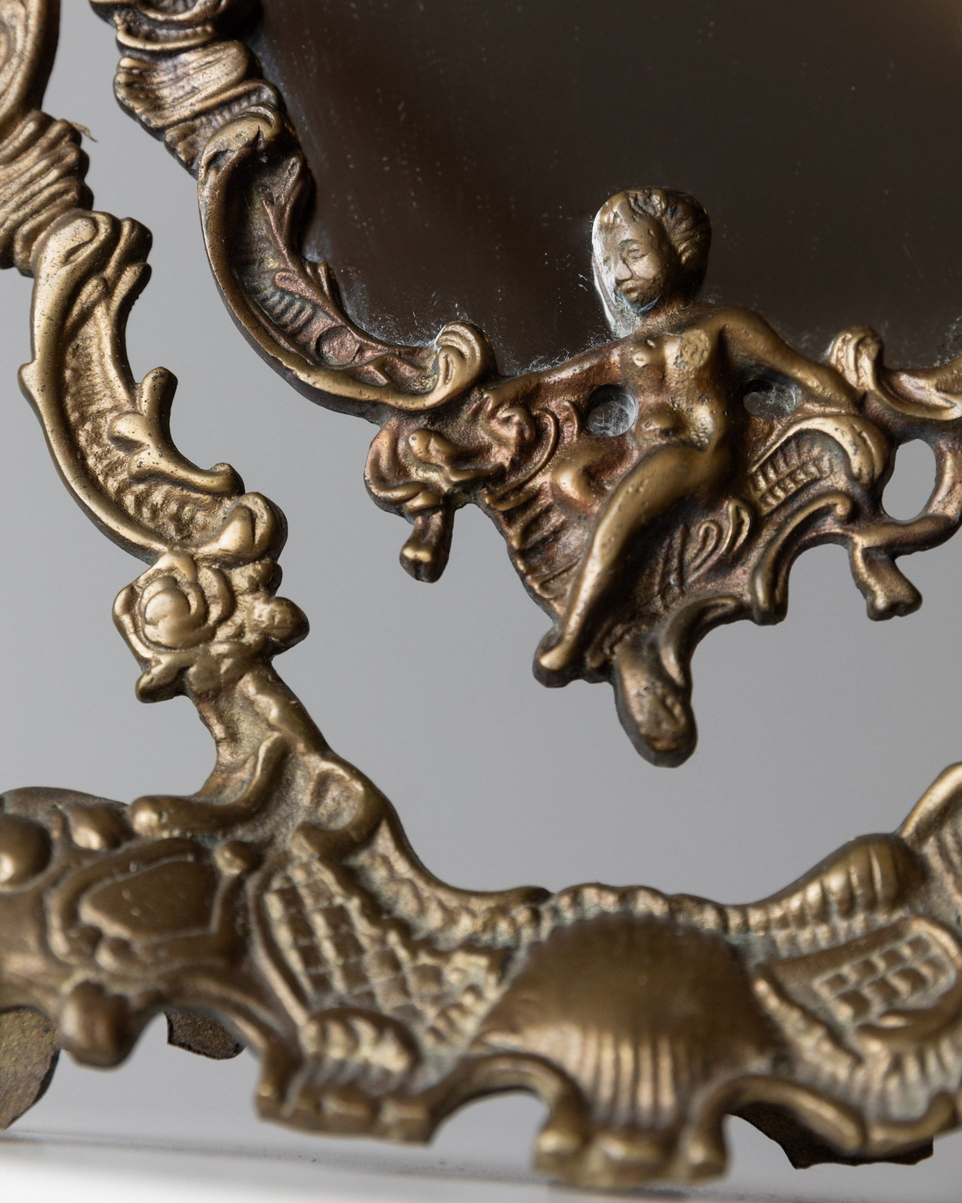 Découvrez le charme d'autrefois avec ce superbe miroir de maquillage de style baroque vintage de France, fabriqué dans les années 1930. Cette pièce unique en laiton présente des détails décoratifs, notamment des reliefs floraux et la représentation d'une figure féminine. Le miroir n’est pas seulement un accessoire pratique, mais aussi une œuvre d’art impressionnante qui ajoute une touche spéciale à n’importe quelle pièce. Laissez-vous envoûter par l’élégance et le cachet historique de cet objet hors du commun.