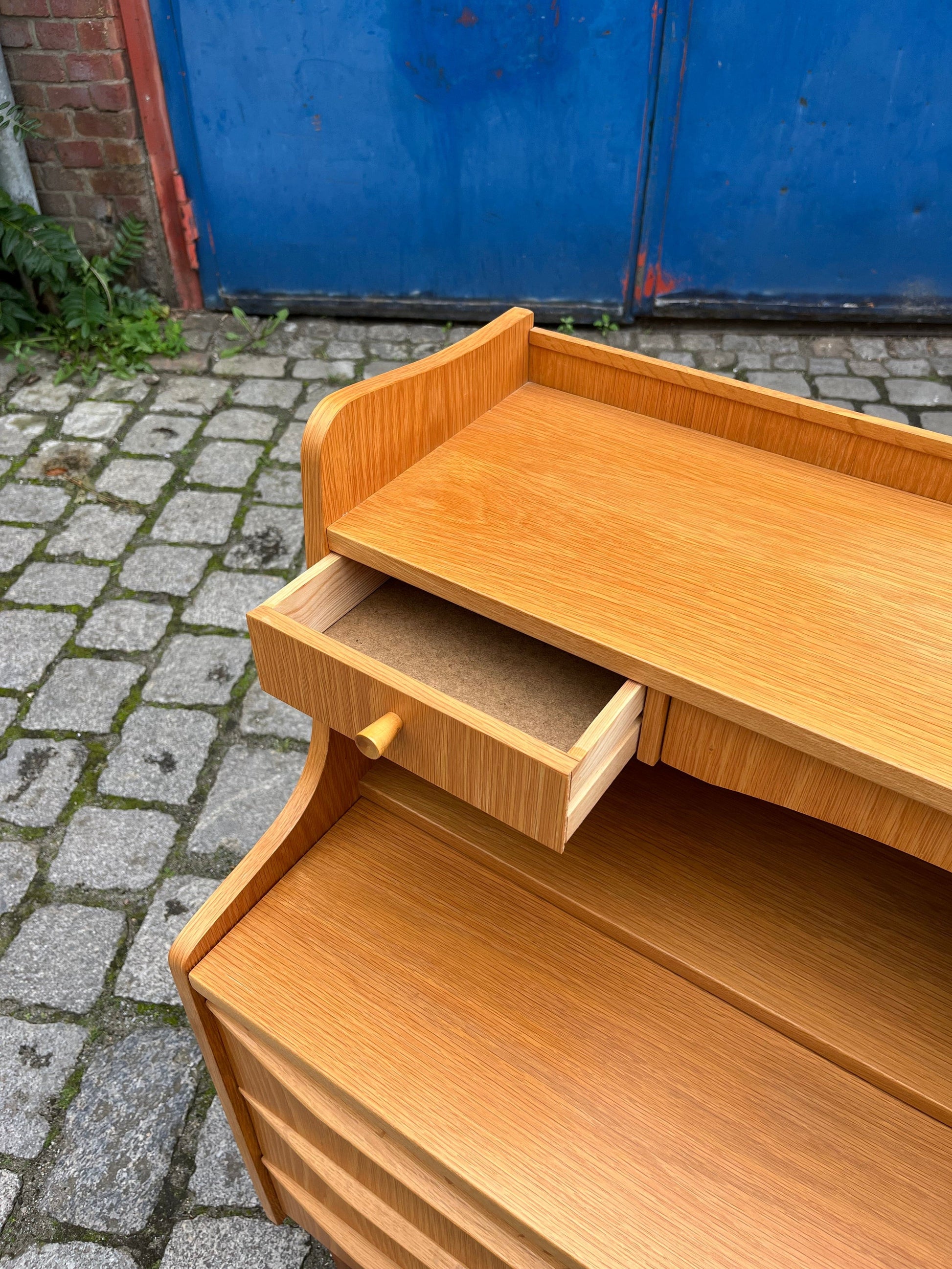 Découvrez le charme du design scandinave avec ce secrétaire vintage en chêne massif. Son bois de chêne jaune miel lui confère un aspect chaleureux et naturel, attirant tous les regards dans n'importe quelle pièce. Sa construction robuste garantit une longue durée de vie, tandis que sa polyvalence séduit. Poste de travail, coiffeuse ou espace de rangement élégant, ce secrétaire s'adapte à tous vos besoins.