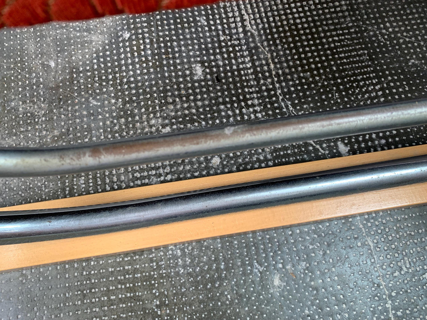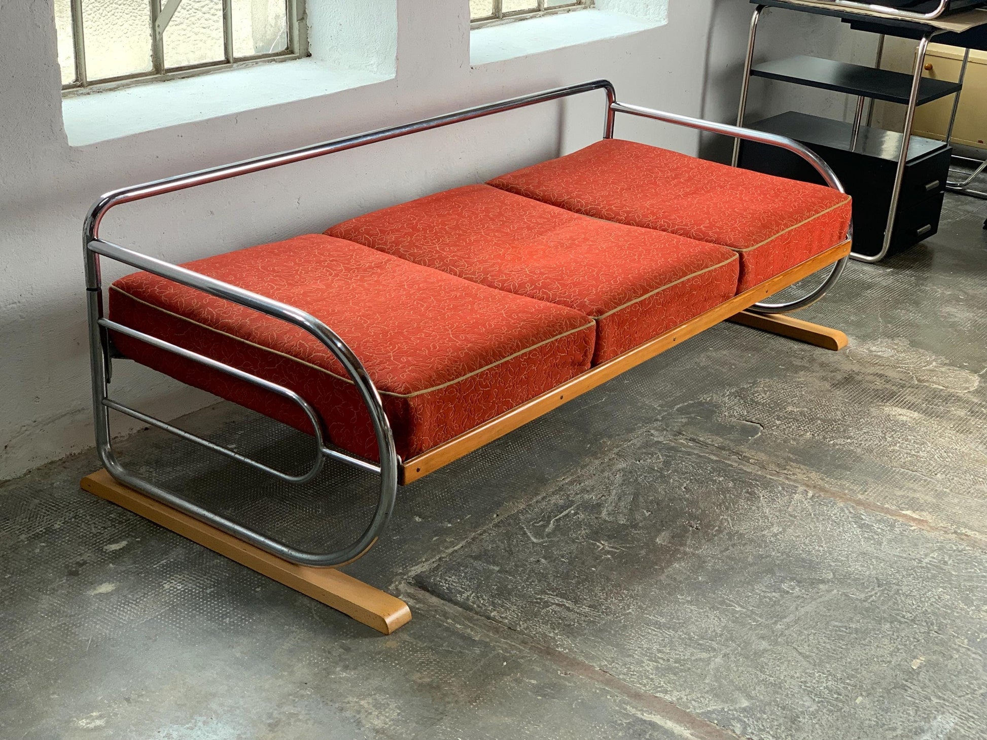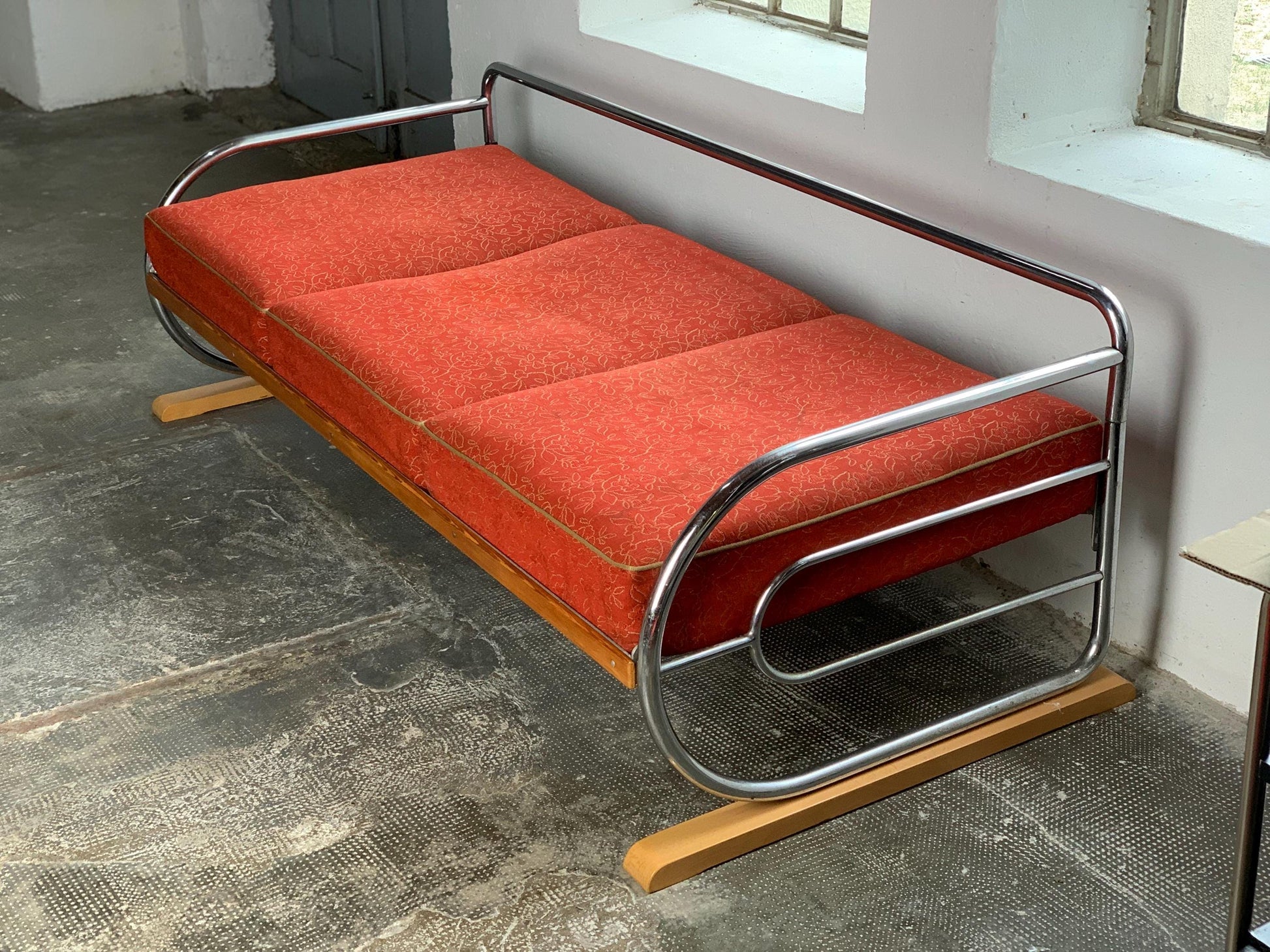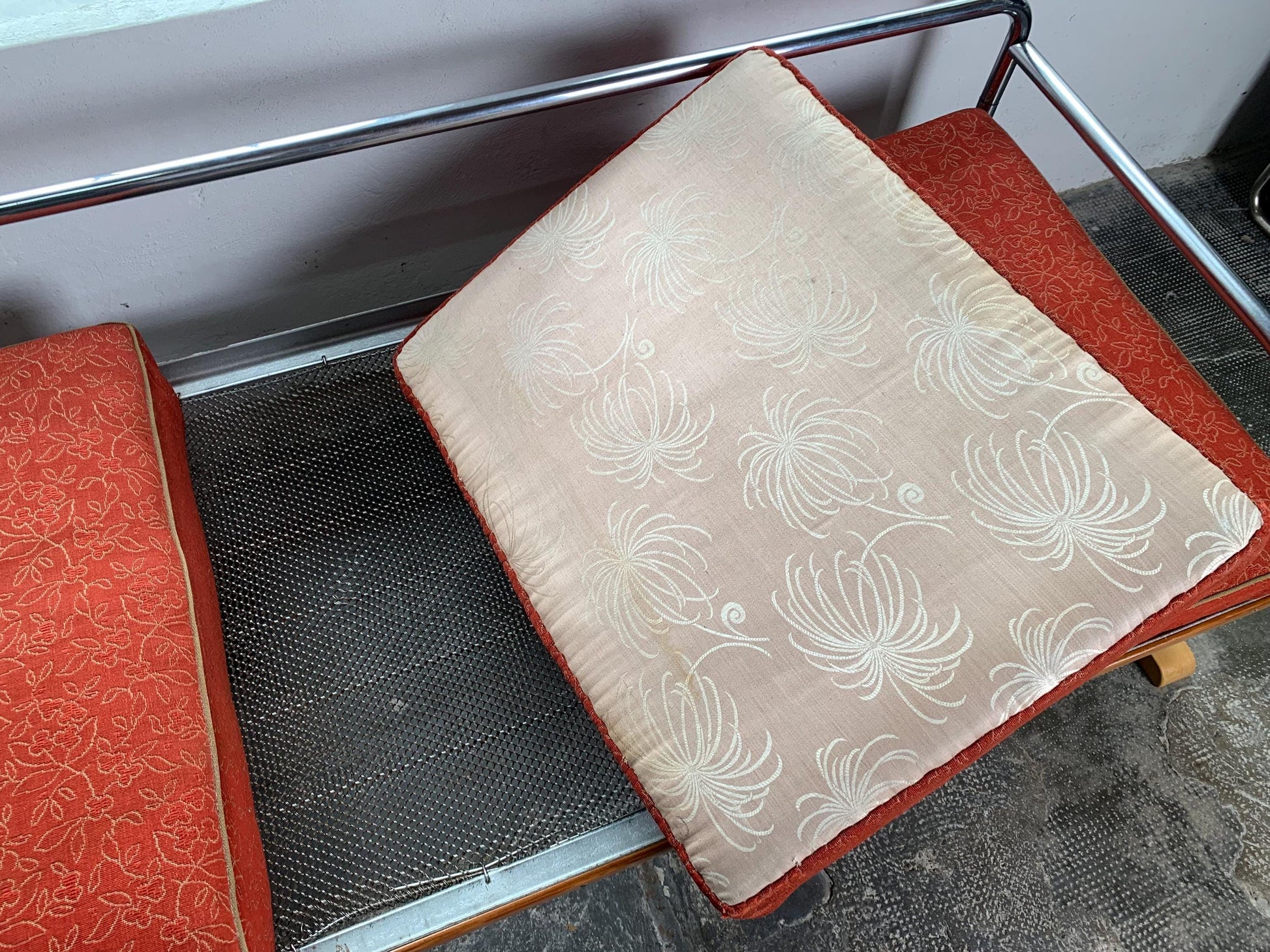 Canapé Bauhaus des années 1940 ou 1950 en très bon état de conservation. Une importante trace de corrosion est visible au centre du panneau latéral gauche ; le chromage est par ailleurs bien conservé et présente un bel éclat. Les coussins à motifs rouges sont en excellent état d'origine et ne présentent que des traces d'usure normales.