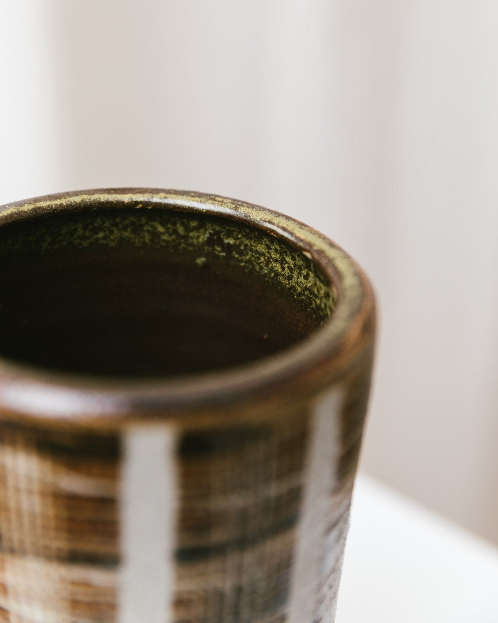 Plongez dans l'univers du design moderne du milieu du siècle avec ce vase vintage unique en céramique d'atelier des années 1960. Ce vase séduit par sa texture en relief marron et beige caractéristique, rappelant l'esthétique Space Age, et apportant une touche de charme rétro à n'importe quelle pièce. Fabriqué à la main et doté d'une texture semi-émaillée et rayée, ce vase est véritablement unique et un atout majeur pour toute collection vintage. Qu'il soit placé seul sur une table ou comme élément décoratif élégant sur un buffet, ce vase apporte une élégance intemporelle à votre intérieur.
