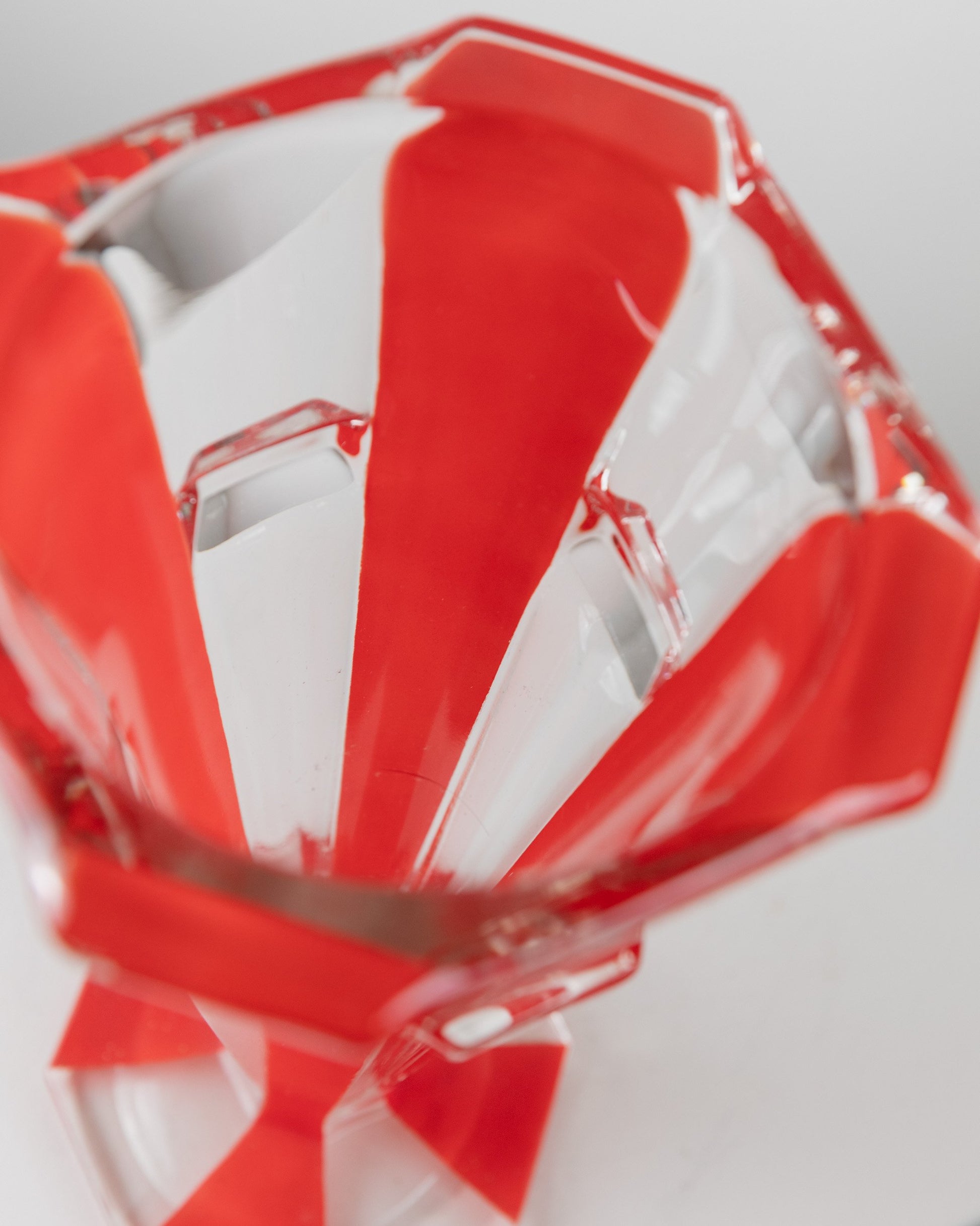 Découvrez l'élégance intemporelle des années 1970 avec cet impressionnant vase vintage en verre de Murano. Le design Art Déco et les rayures rouge vif confèrent à chaque pièce une profondeur et une élégance particulières. Ce vase n'est pas seulement une pièce fonctionnelle mais aussi un objet décoratif élégant qui est parfait comme cadeau ou pour votre propre table. Laissez-vous inspirer par la finition de haute qualité et le design unique.