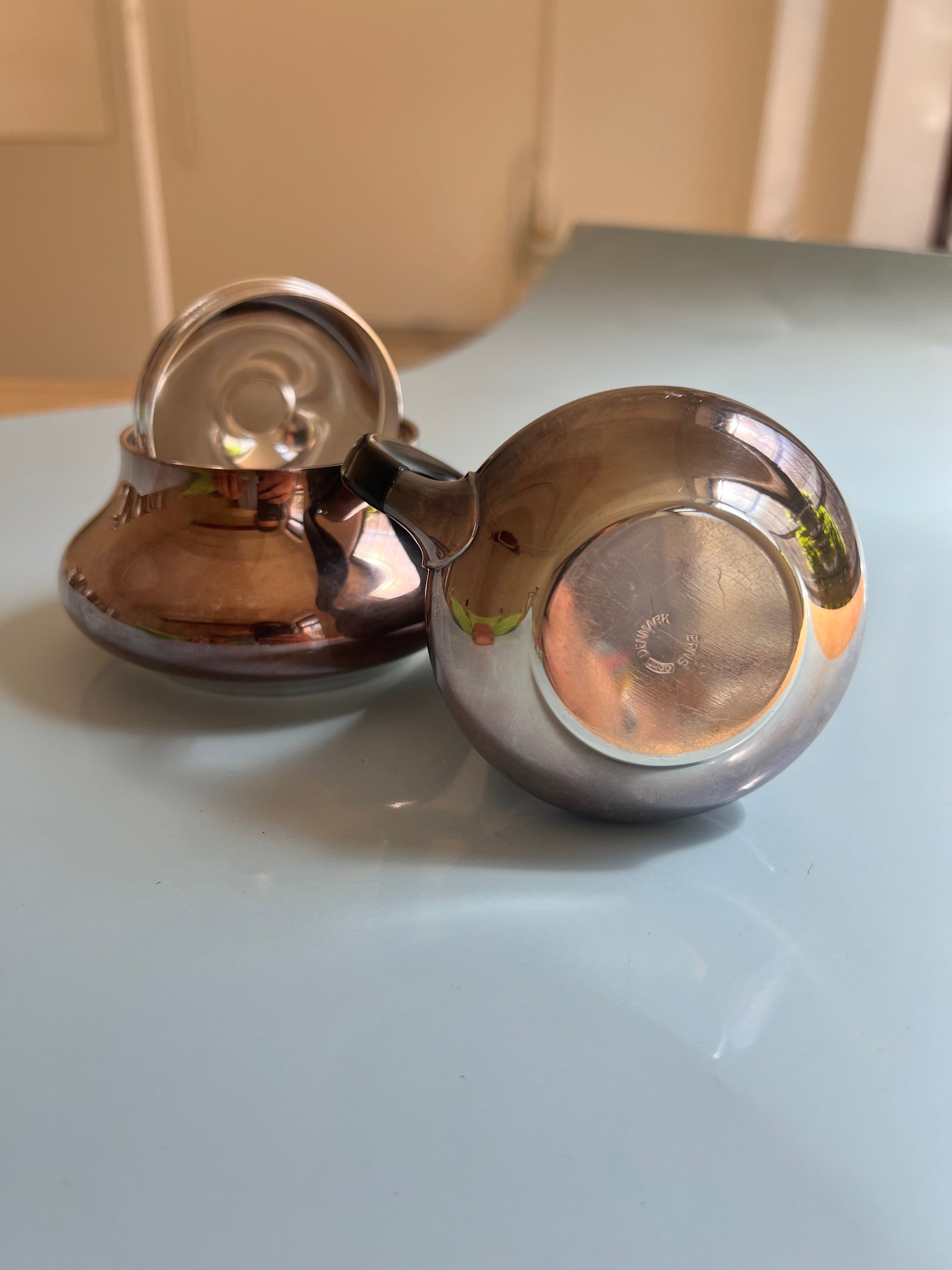 Ajoutez une touche d'élégance intemporelle à votre table avec cet ensemble sucrier et pot à lait vintage, conçu par Hans Bunde pour COHR Danemark. Datant des années 1950, cet ensemble est plaqué argent EPNS (maillechort électrolytique) de haute qualité. Les poignées en bakélite offrent un contraste élégant et une prise en main confortable. Parfait pour les tables basses élégantes ou comme objet de collection.