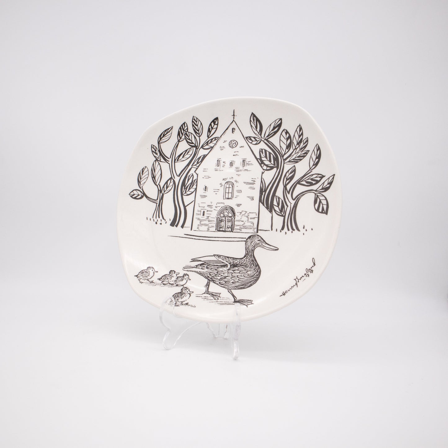 Cette plaque murale norvégienne a été conçue par Henry Imsland pour Figgjo Norvège en 1977. Sur la photo, une église de village à Stavanger avec un canard et quatre petits poussins. L'assiette fait partie de la collection du Musée graphique norvégien.