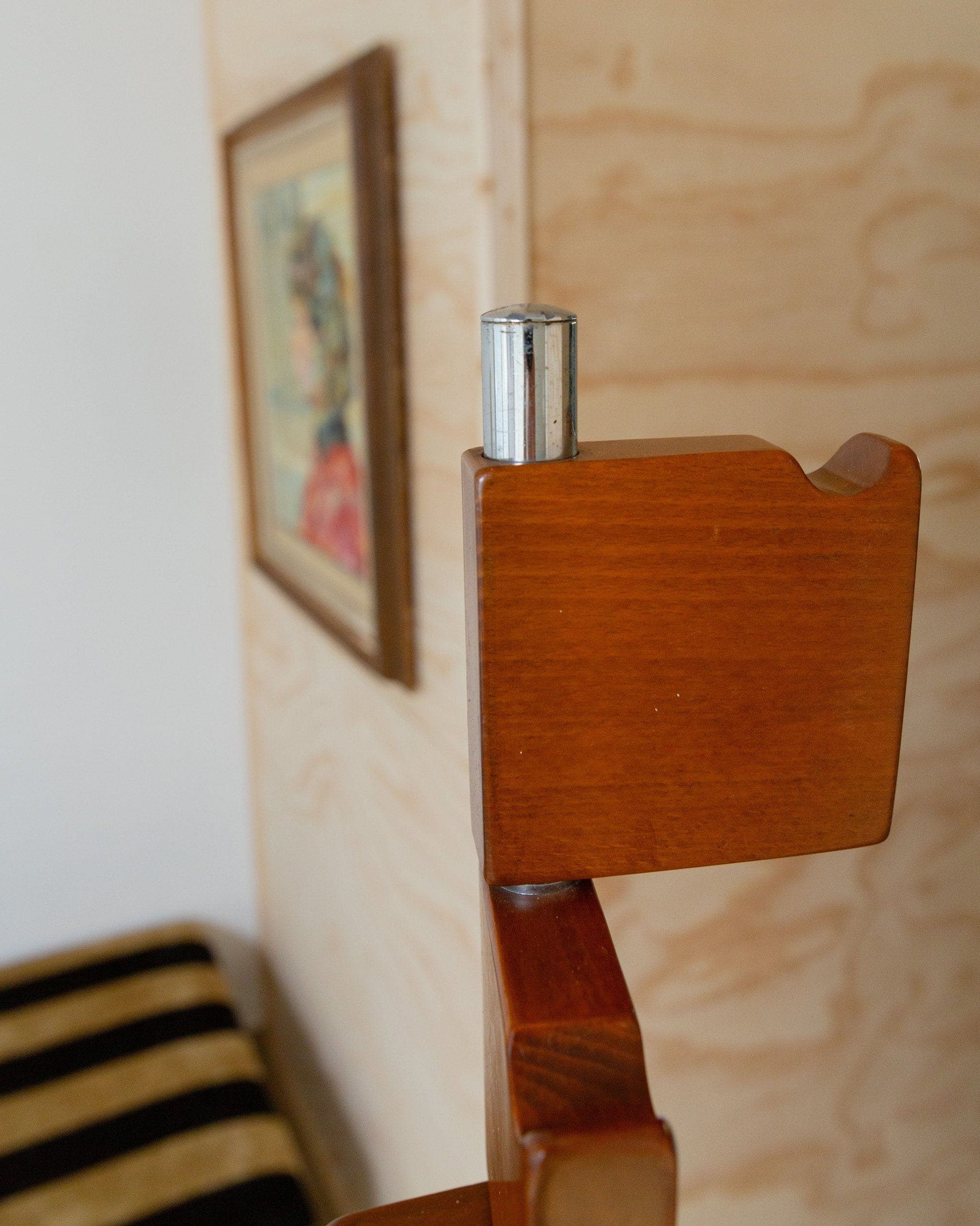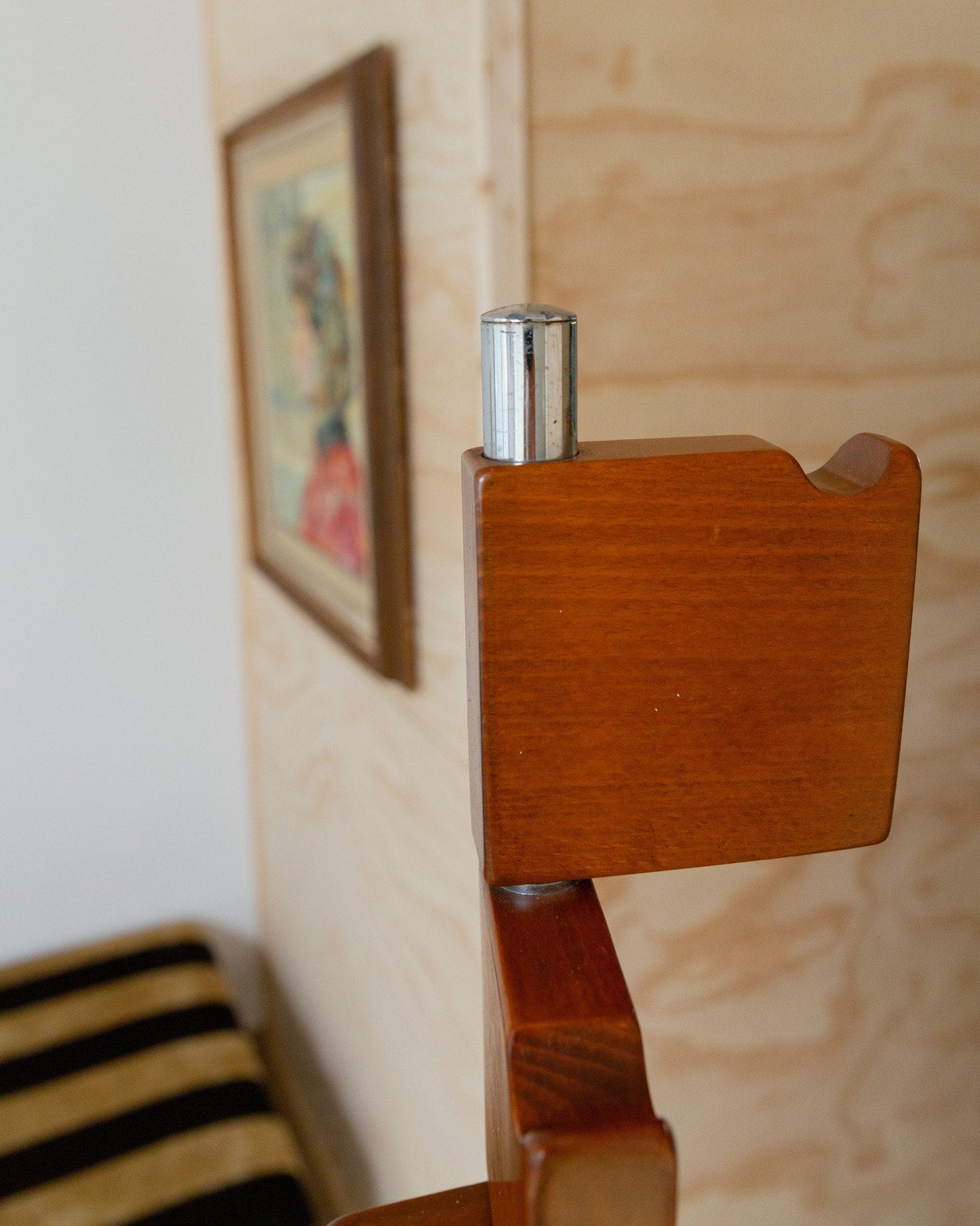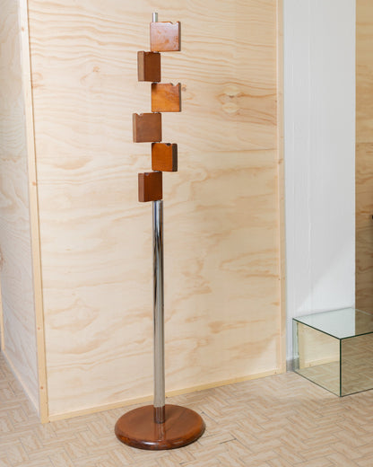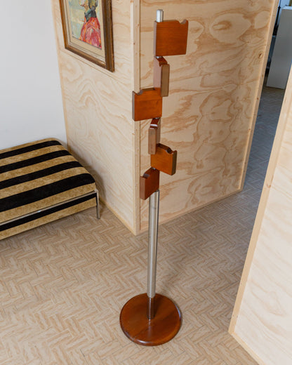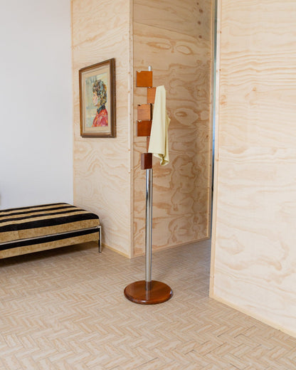 Découvrez l'élégance intemporelle des années 60 avec cette armoire vintage XL extrêmement rare en provenance d'Italie. Ce porte-manteau combine le chrome et le bois dans un design classique du milieu du siècle et ajoute une touche de style et de sophistication à votre entrée. Les crochets en bois pivotants sur la tige chromée offrent non seulement une fonctionnalité, mais également un point fort visuel. La base ronde en bois marron foncé complète parfaitement le design et assure la stabilité.