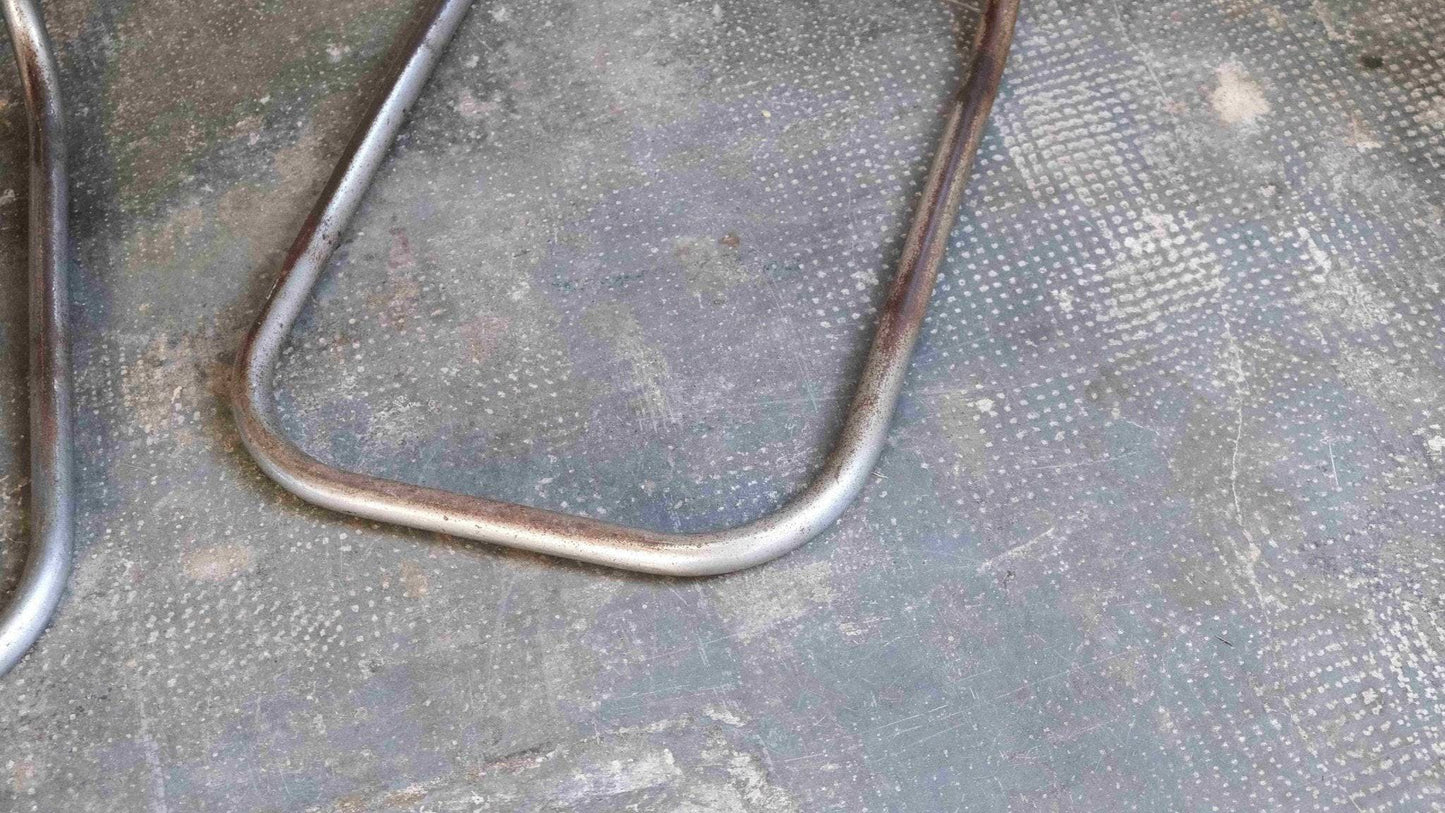 Die Holzoberflächen wurden in der Vergangenheit laienhaft weiß lackiert, zudem sind einige Schäden vorhanden. Im oberen Bereich zeigt die Verchromung einen schönen Glanz, die unteren Elemente weisen stärkere Korrosionsspuren auf.