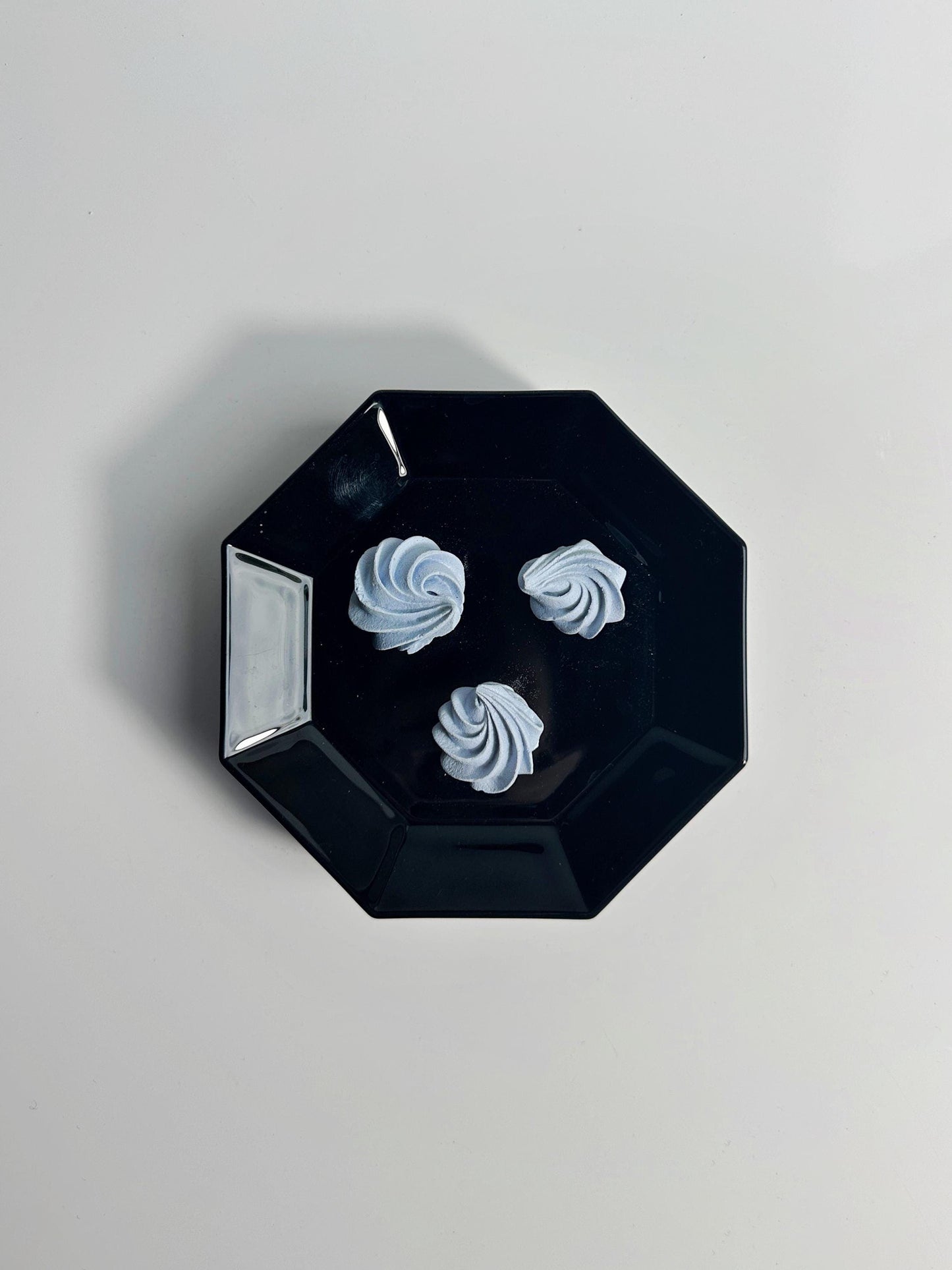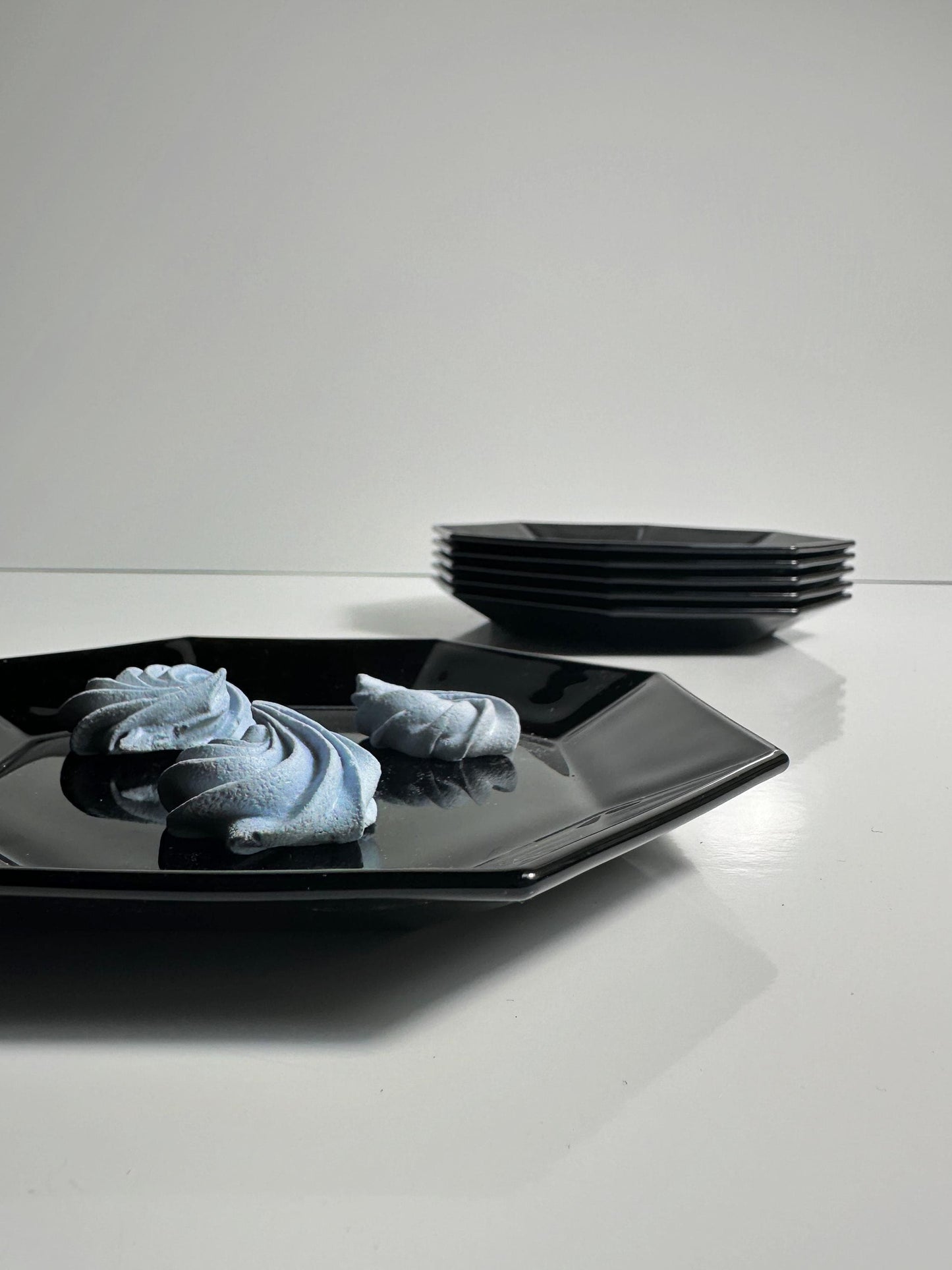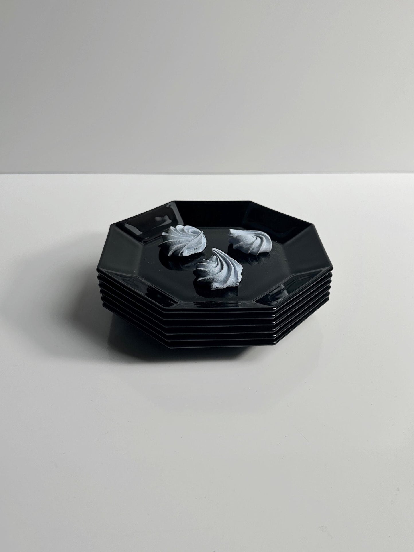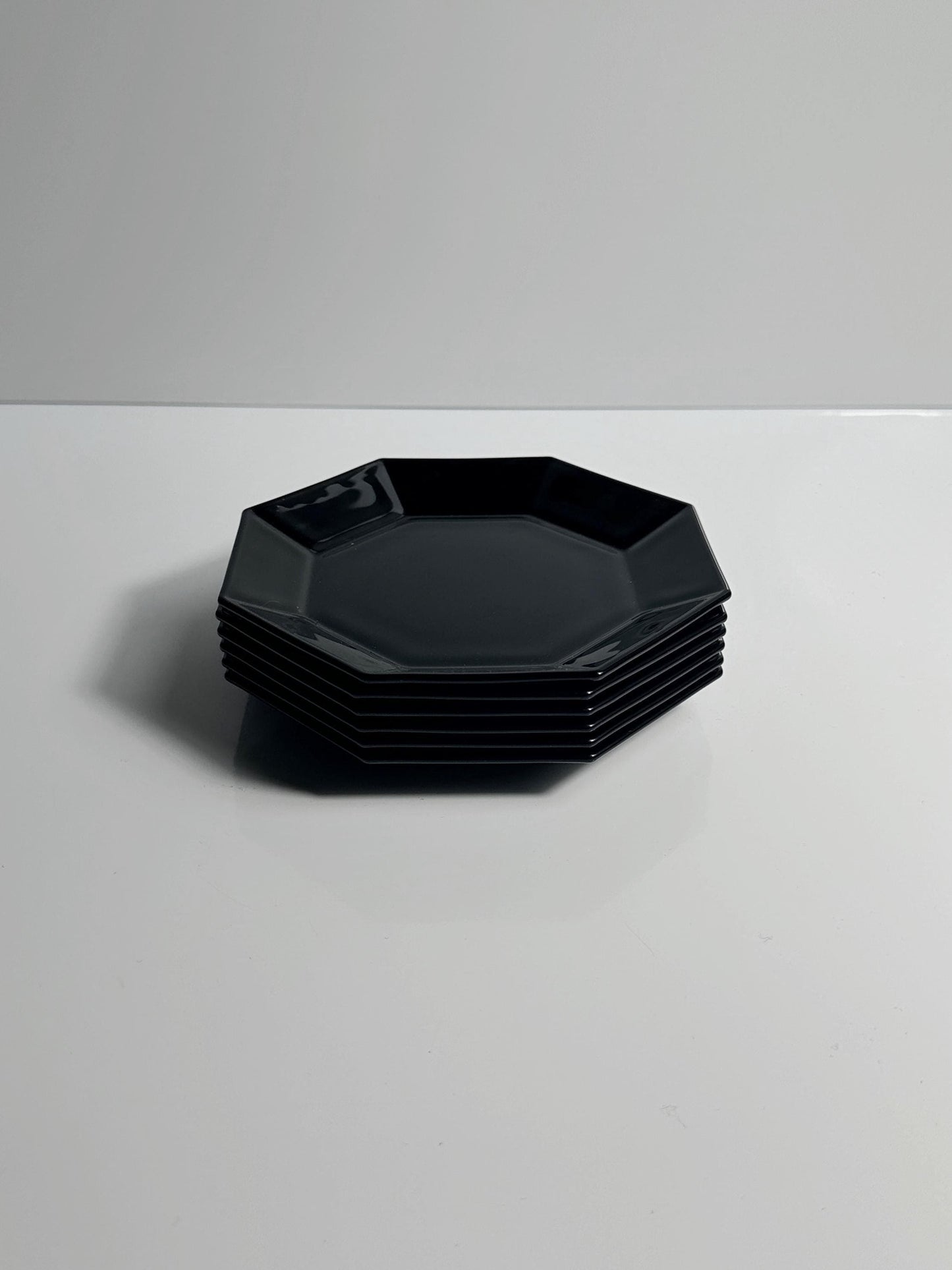 6 Wunderschöne schwarze DESSERT Teller aus den späten 1980ern on Arcoroc France aus der weltbekannten Serie Octime. Achteckiges Design in Art Deco Revival Formensprache.