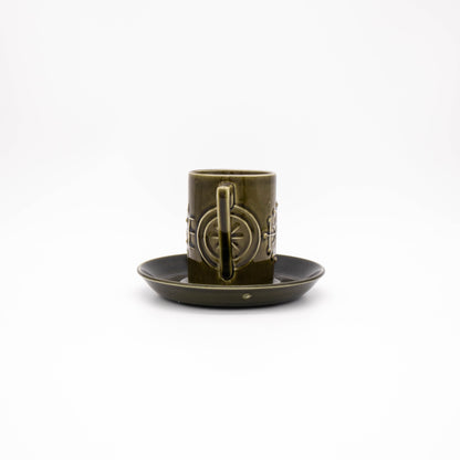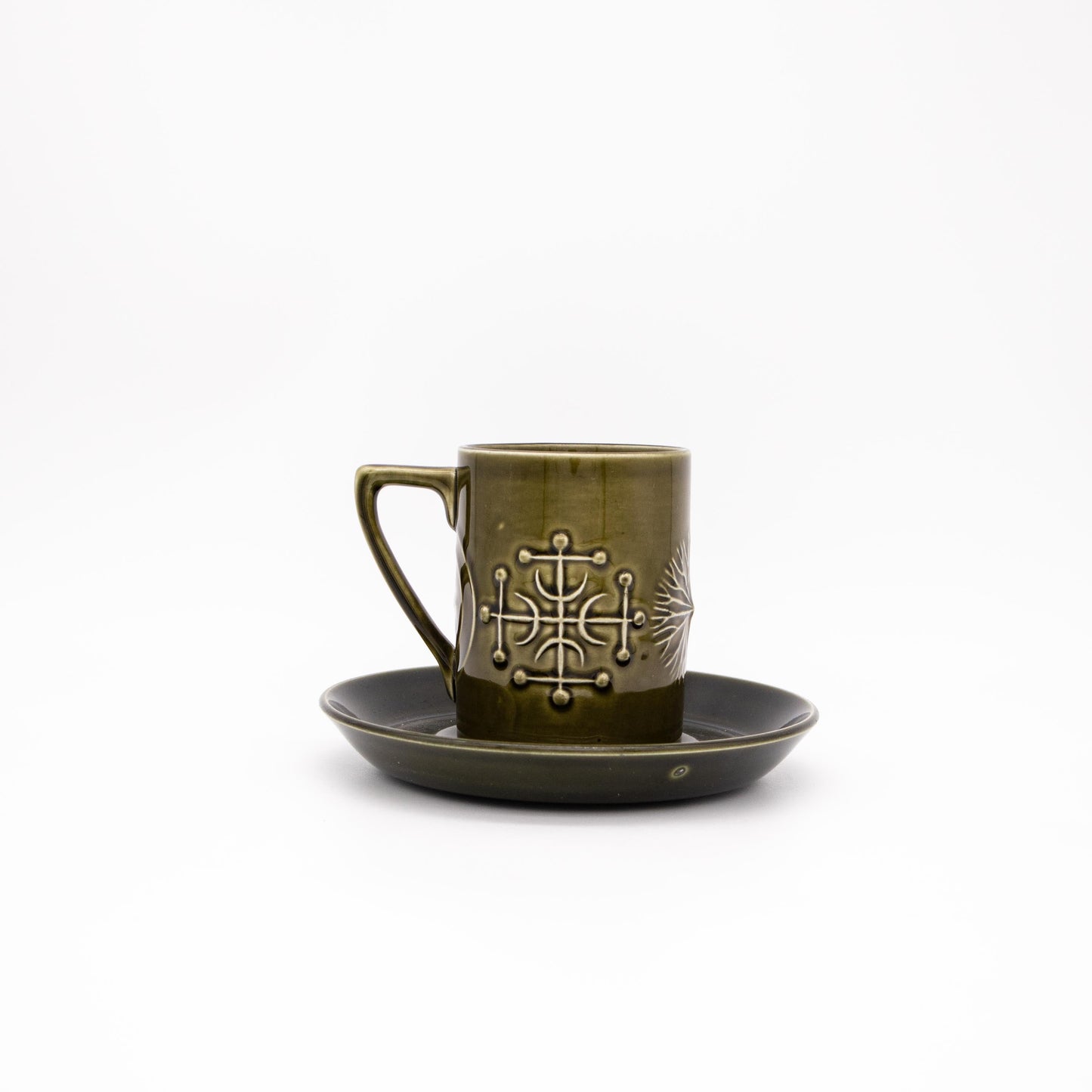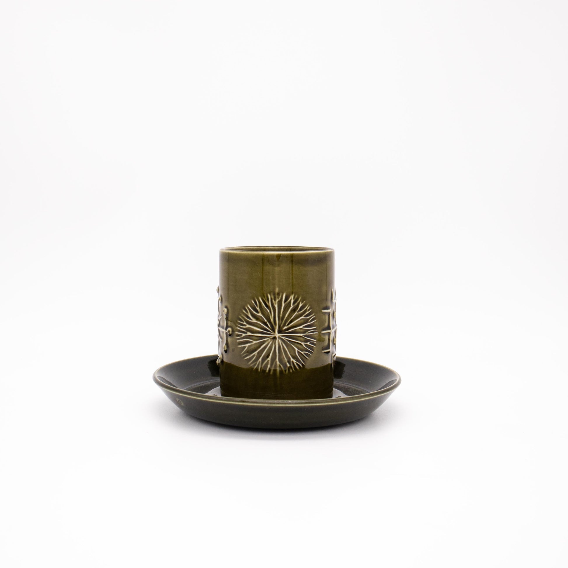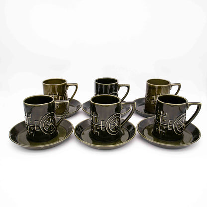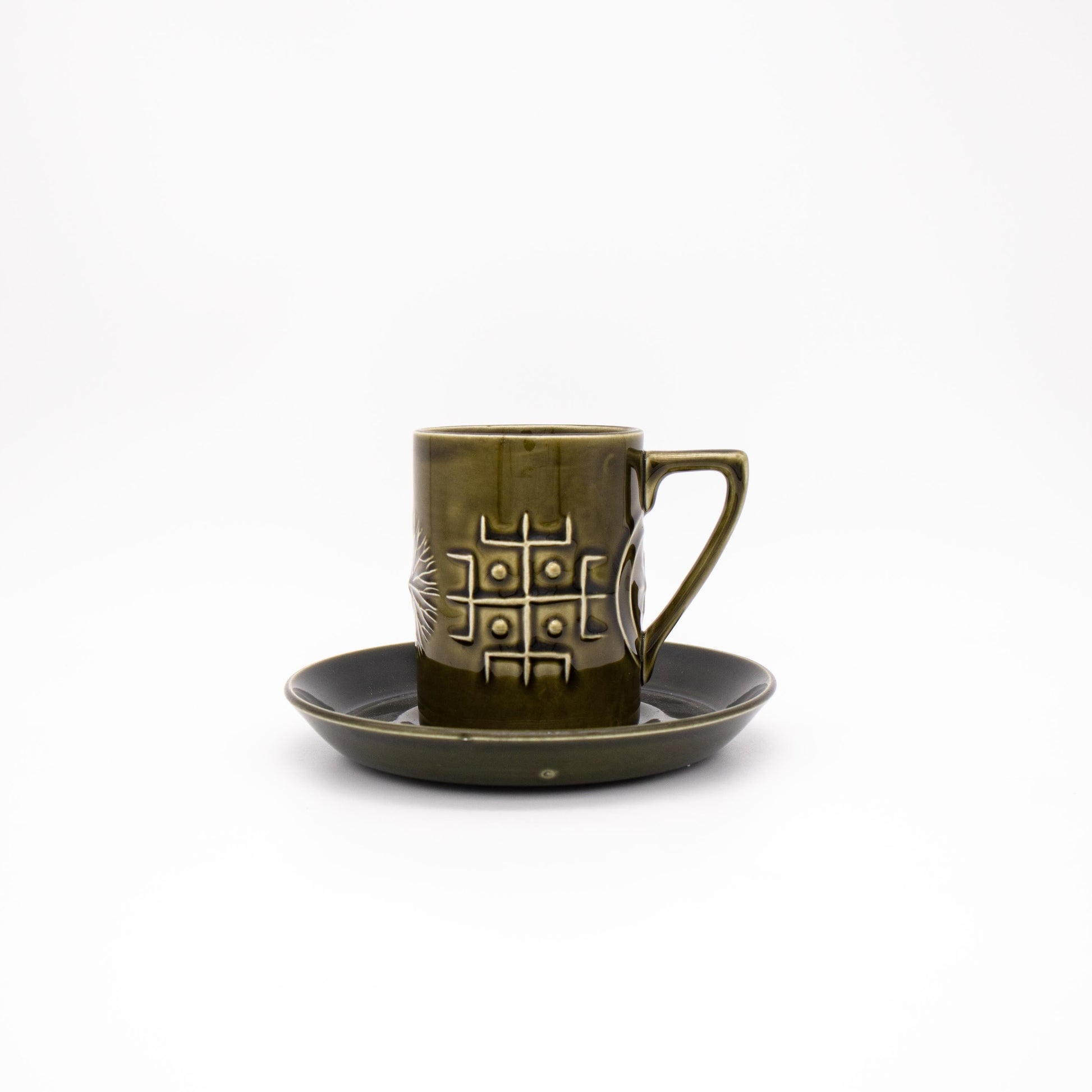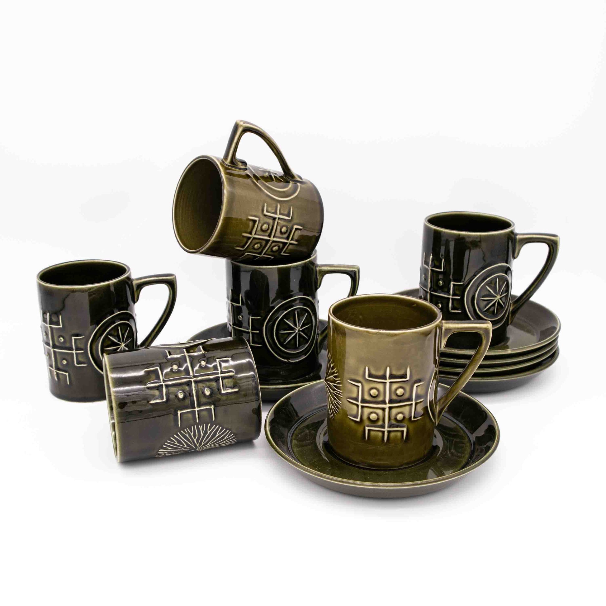 Das aufregende "Totem" Design, entstanden durch die visionäre Zusammenarbeit zwischen Susan Williams-Ellis und Patrick Reeve, vereint harmonisch geometrische Formen, mächtige Linien und fesselnde Farben. Das Tassen Set besteht aus 6 Stück mit 7 Untertassen. Es ist ideal für den Frühstückskaffee und zum Dessert, und ist in dunklem Grün gehalten. Ein einzigartiges Design Highlight aus den 1970er Jahren, das jeden begeistert.
