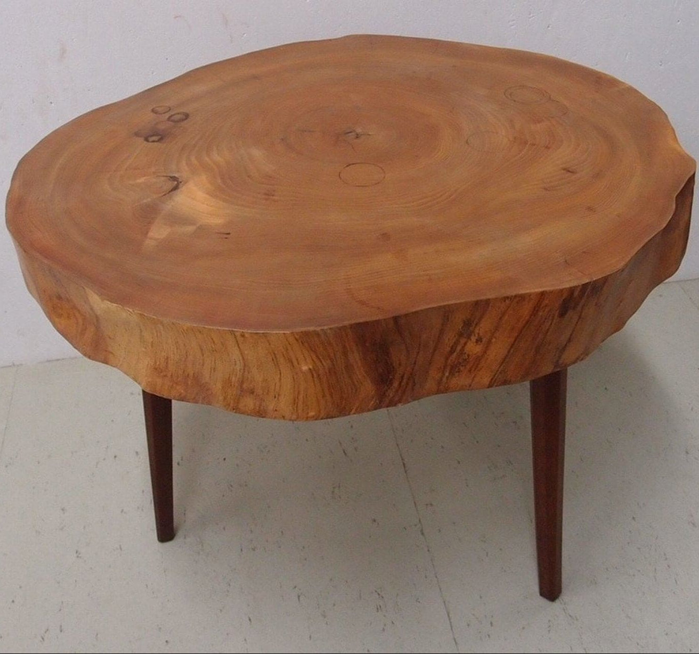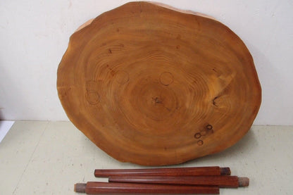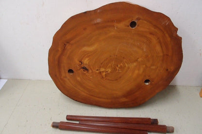 Vintage Beistelltisch aus Baumscheibe: Dieser stilvolle Beistelltisch kombiniert die natürliche Schönheit von massiver Rüsterholz-Baumscheibe mit minimalistischer Eleganz. Die markante Maserung und die dunklen Wengeholzbeine verleihen dem Tisch eine moderne Optik und machen ihn zu einem vielseitigen Möbelstück für jedes Interieur. Perfekt für Naturliebhaber und Design-Enthusiasten, die Wert auf hochwertige Materialien und einzigartiges Handwerk legen. - Massive Rüsterholz-Baumscheibe mit natürlicher Maserung - Drei einsteckbare Beine aus dunklem Wengeholz - Vielseitig einsetzbar als Tisch oder Wanddekoration - Guter Vintage-Zustand mit minimalen Gebrauchsspuren