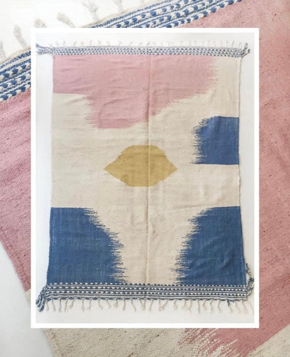 Die sorgfältig ausgewählte Farbpalette in sanften Tönen von Creme, Altrosa und tiefem Indigoblau, kombiniert mit einem markanten geometrischen Muster, fügt sich nahtlos in moderne und traditionelle Einrichtungsstile ein. Jeder Pinselstrichähnliche Farbauftrag erzählt die Geschichte handwerklicher Kunstfertigkeit und Leidenschaft.