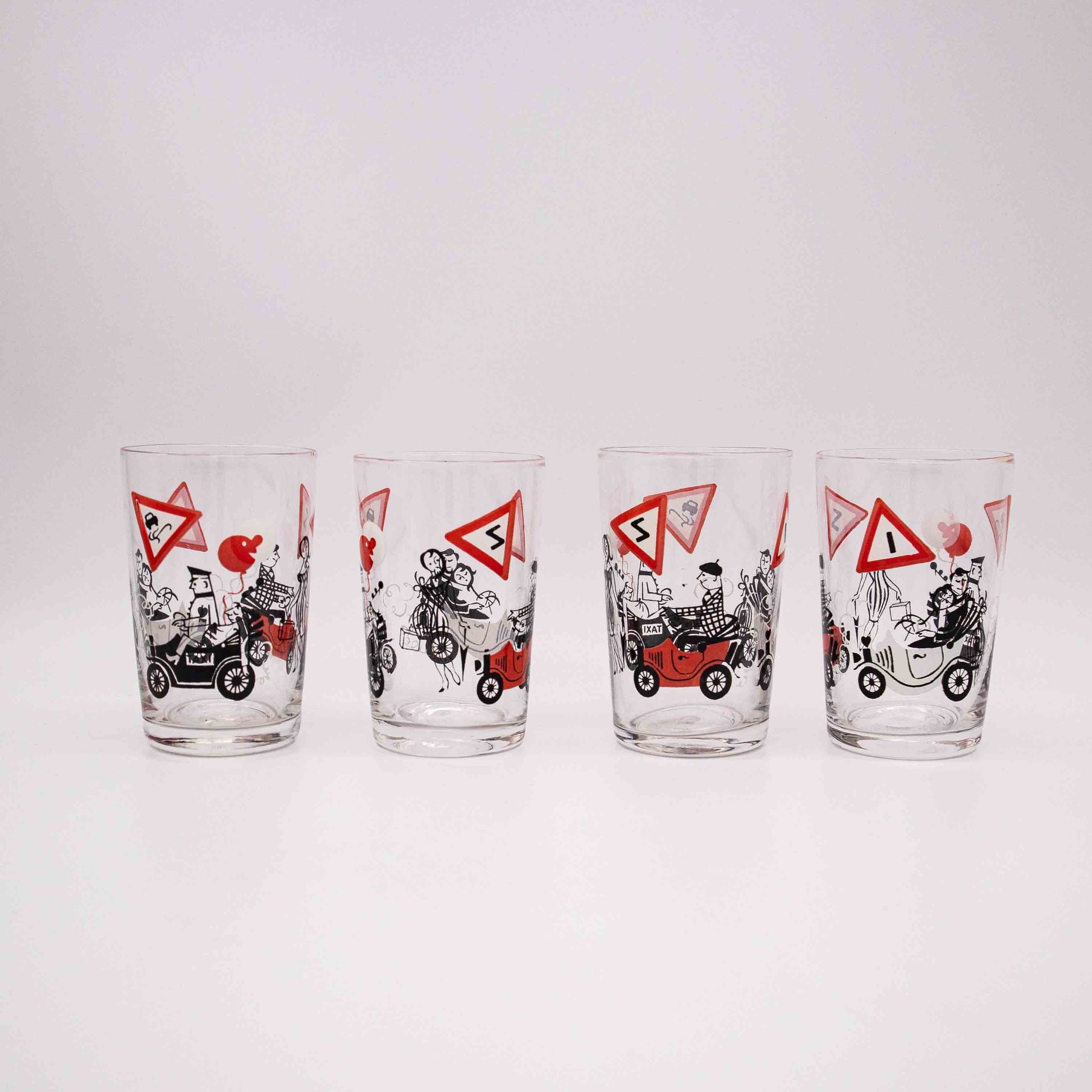 Dieses Gläserset ist ein einzigartiges Sammlerstück. Mit vier Gläsern, die mit nostalgischen Verkehrsszenen in Weiß, Rot und Schwarz verziert sind, kannst du dir die Atmosphäre der 1950er Jahre nach Hause holen.