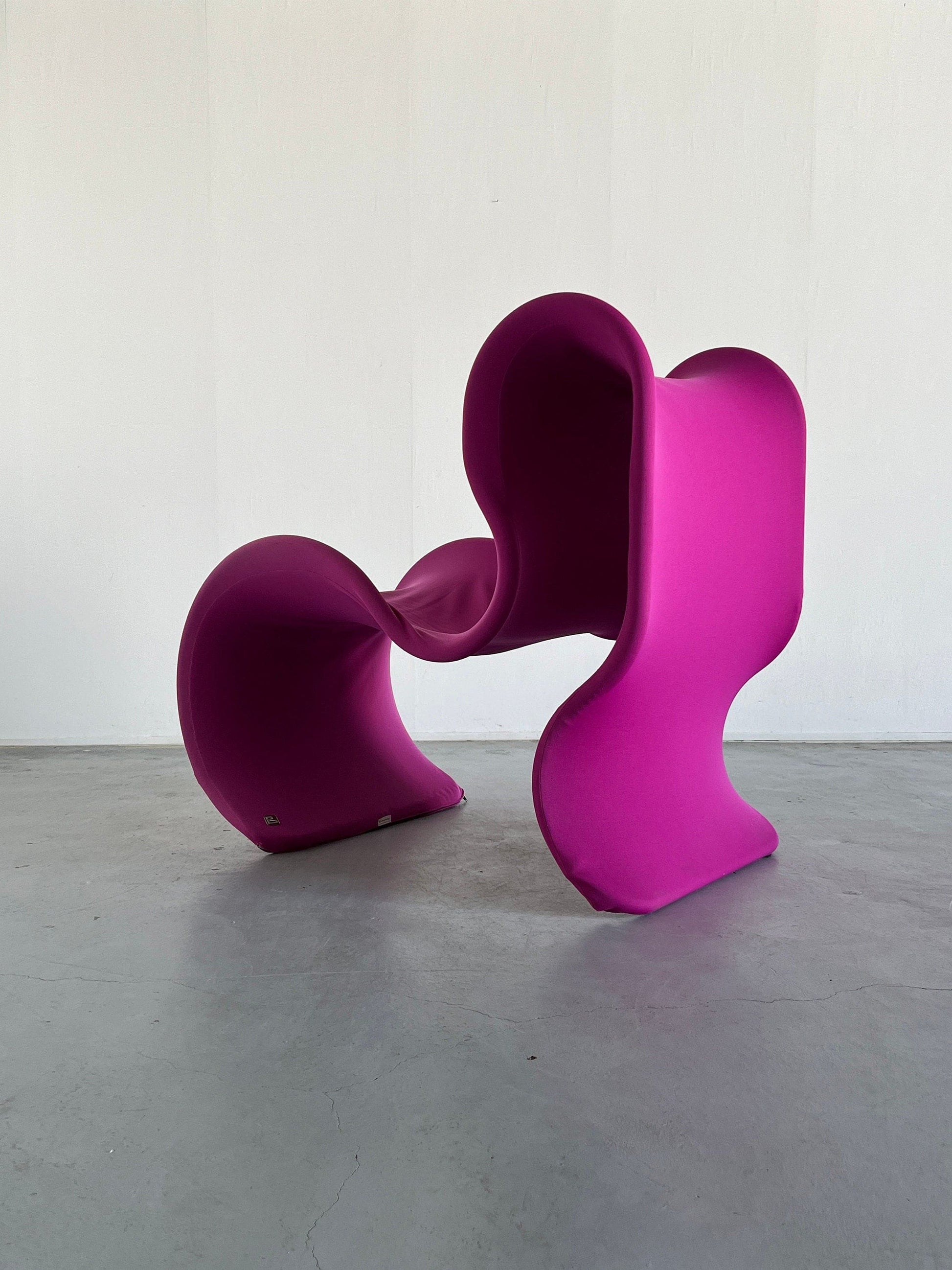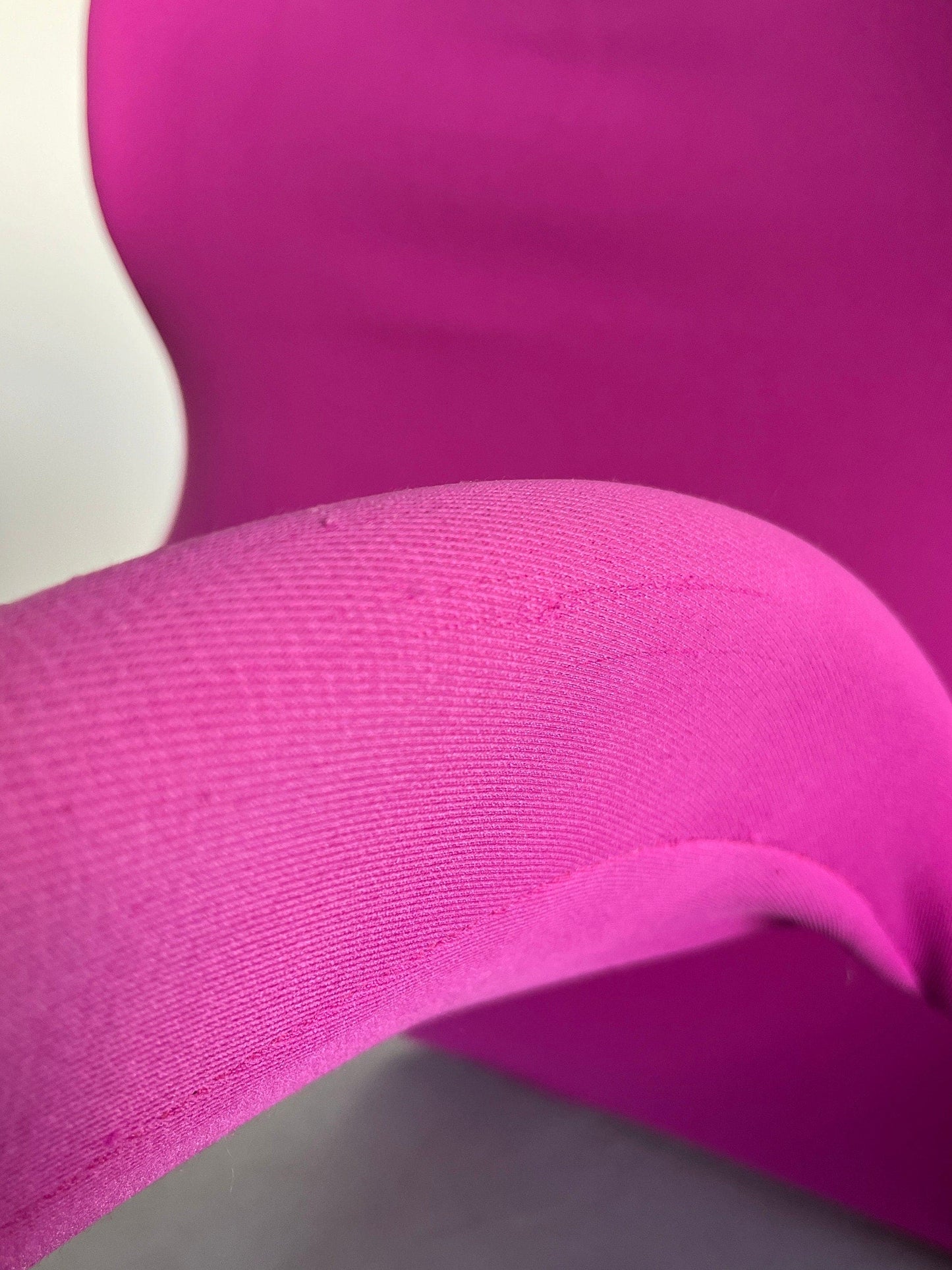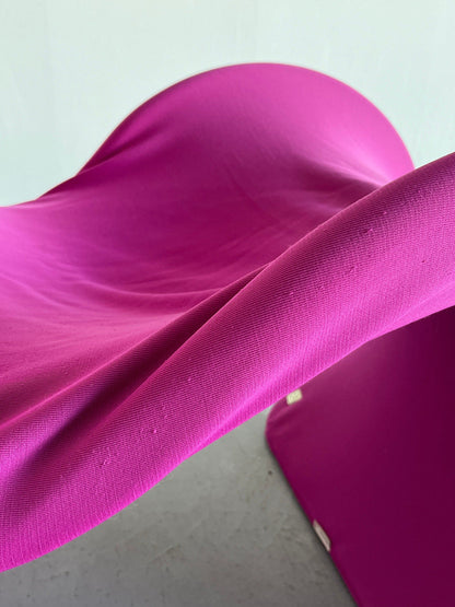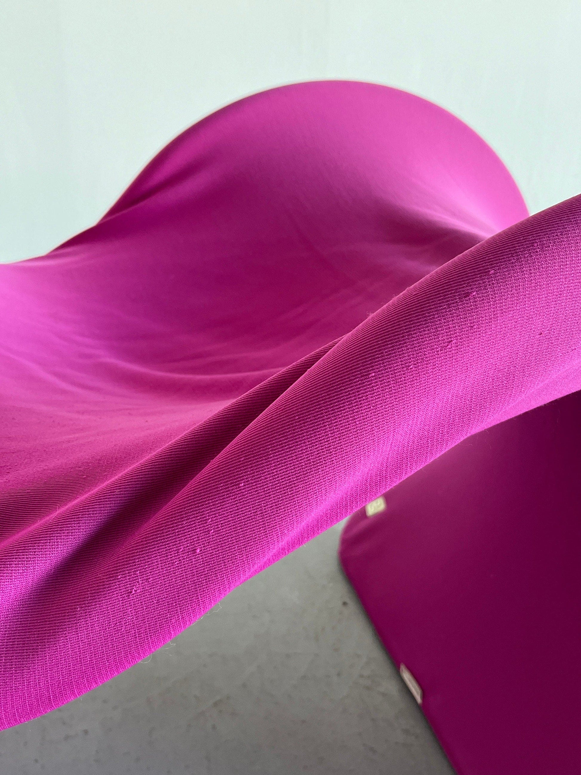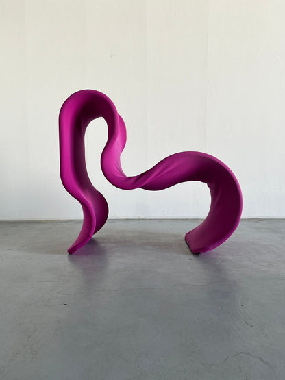 Zwei Metallprofile verlaufen parallel und beschreiben im Raum weite und gewundene Linien. Dazwischen ist ein elastischer Stoff in leuchtendem Pink gelegt, der die bequeme Sitzfläche bildet.
