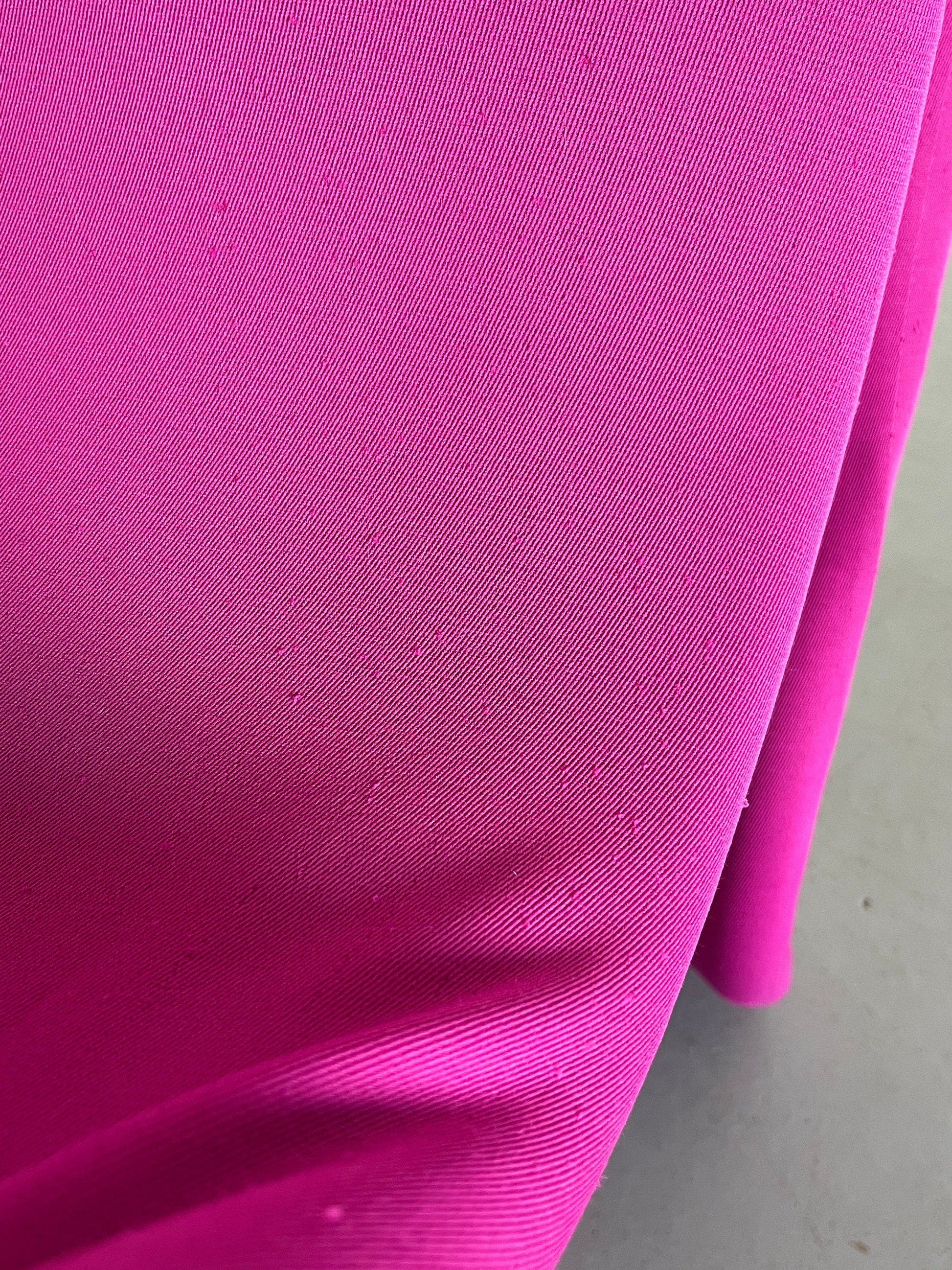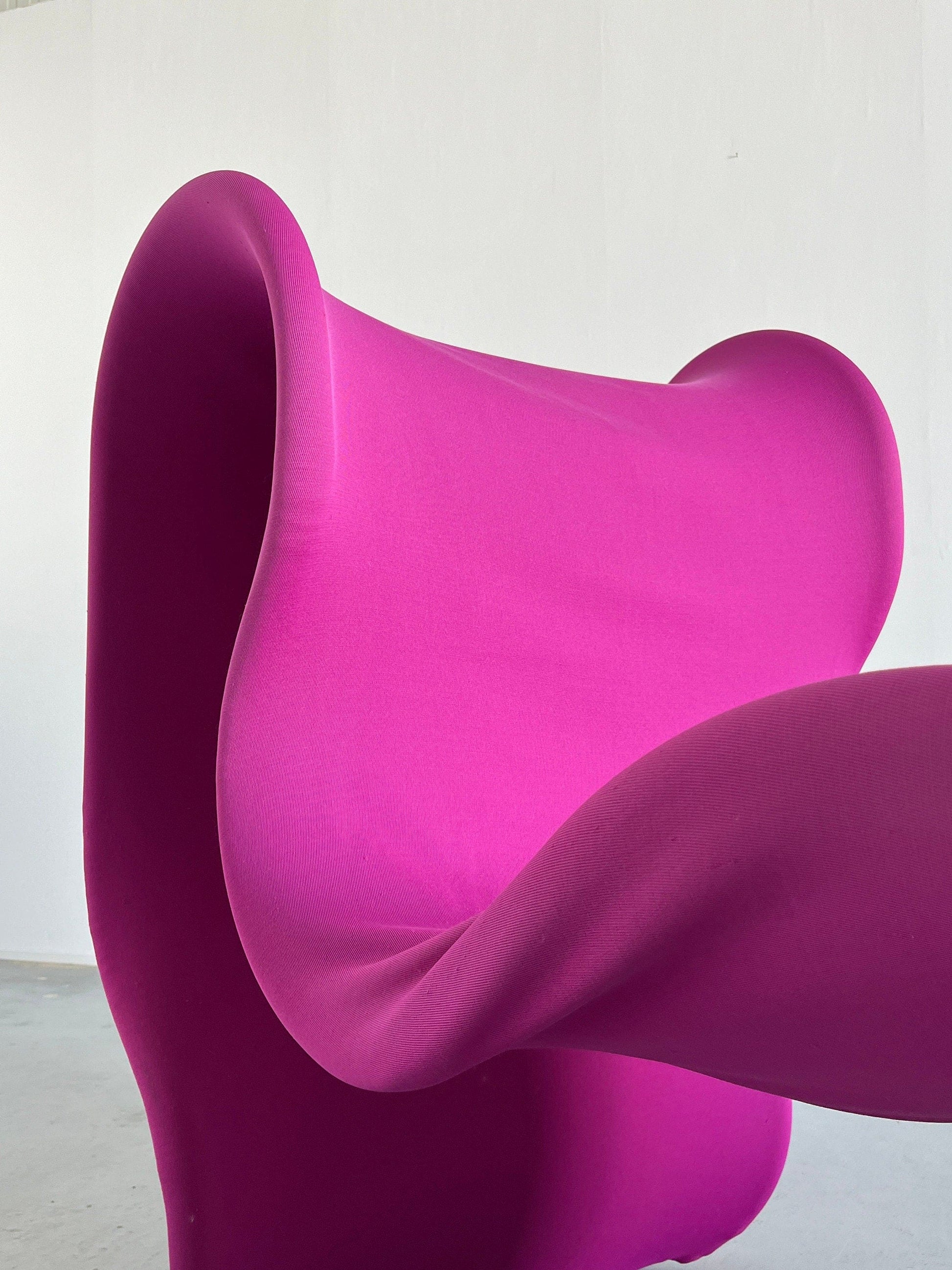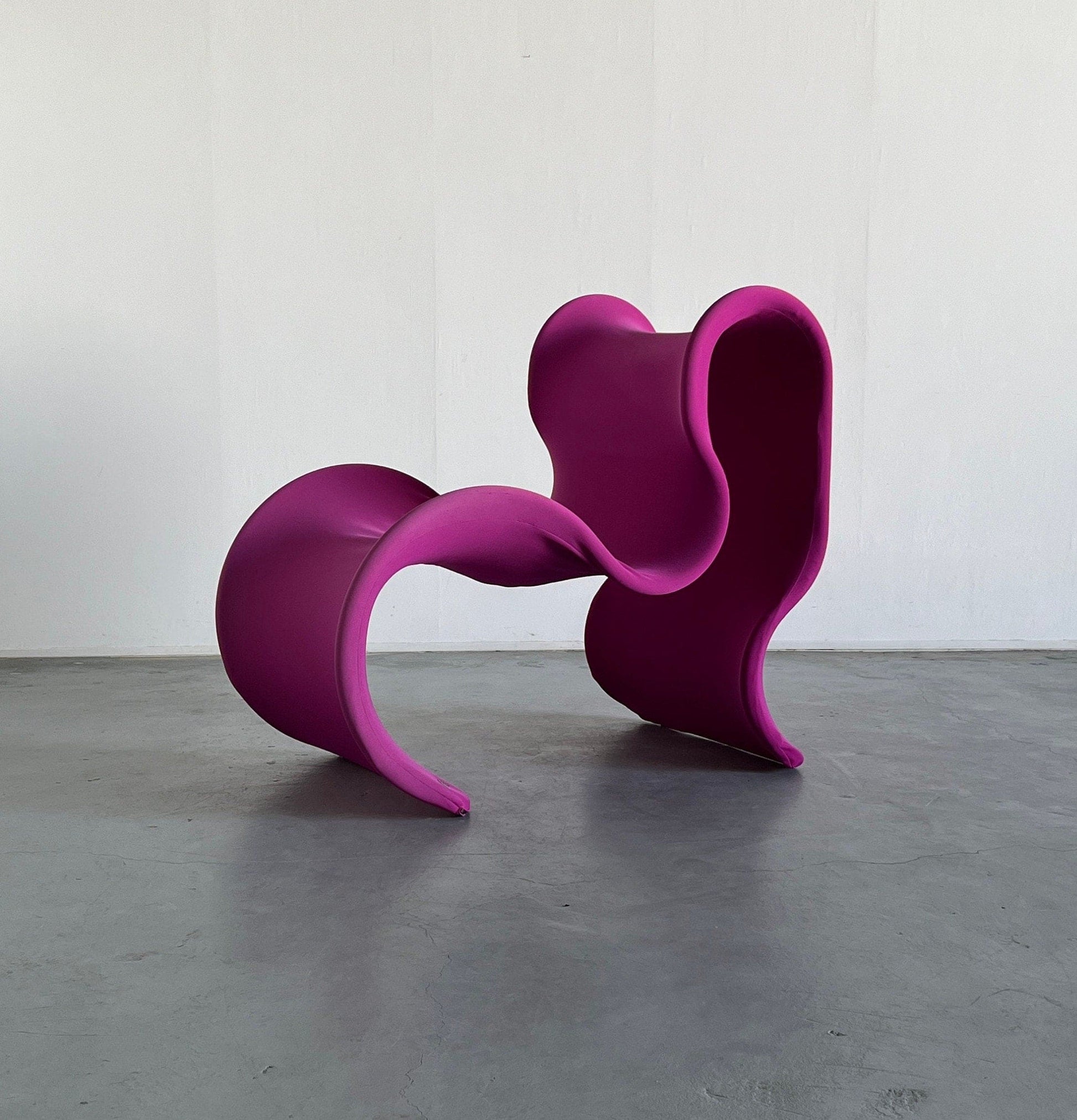 Zwei Metallprofile verlaufen parallel und beschreiben im Raum weite und gewundene Linien. Dazwischen ist ein elastischer Stoff in leuchtendem Pink gelegt, der die bequeme Sitzfläche bildet.