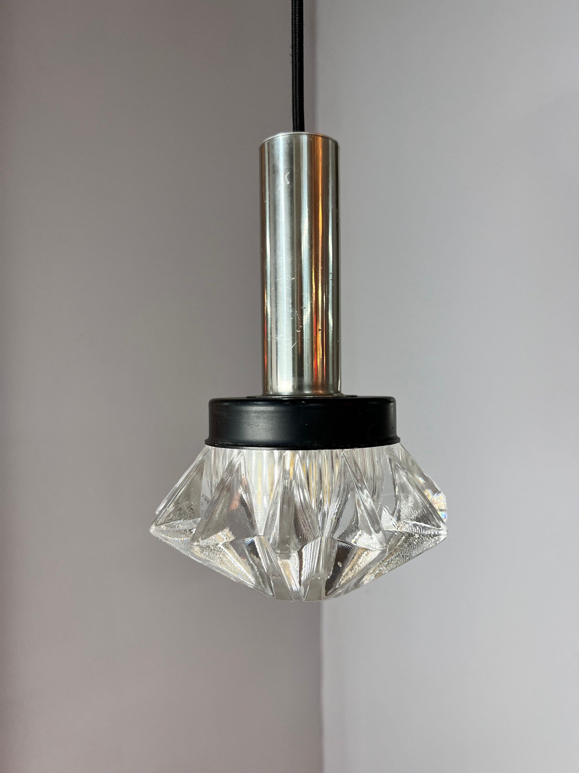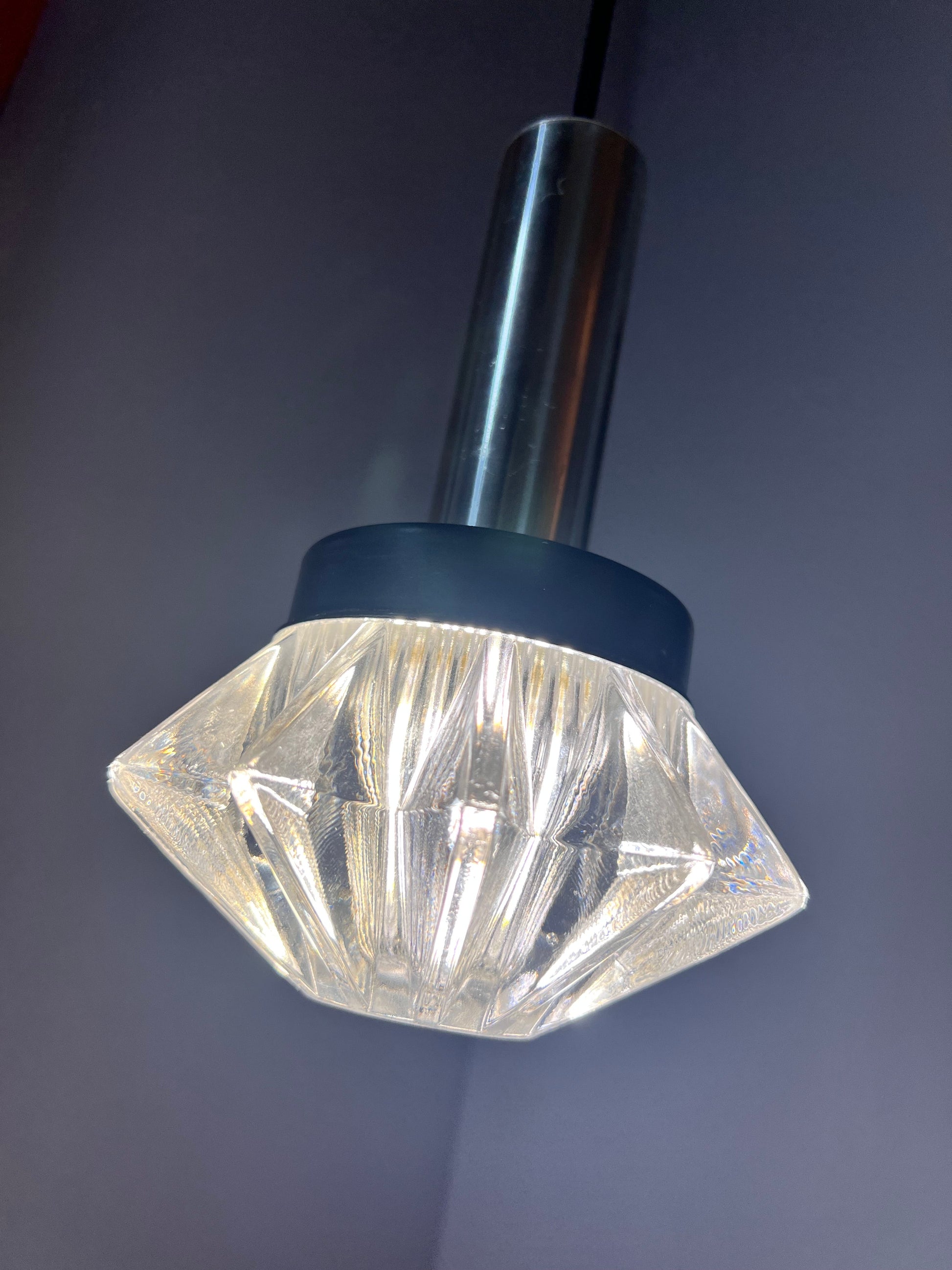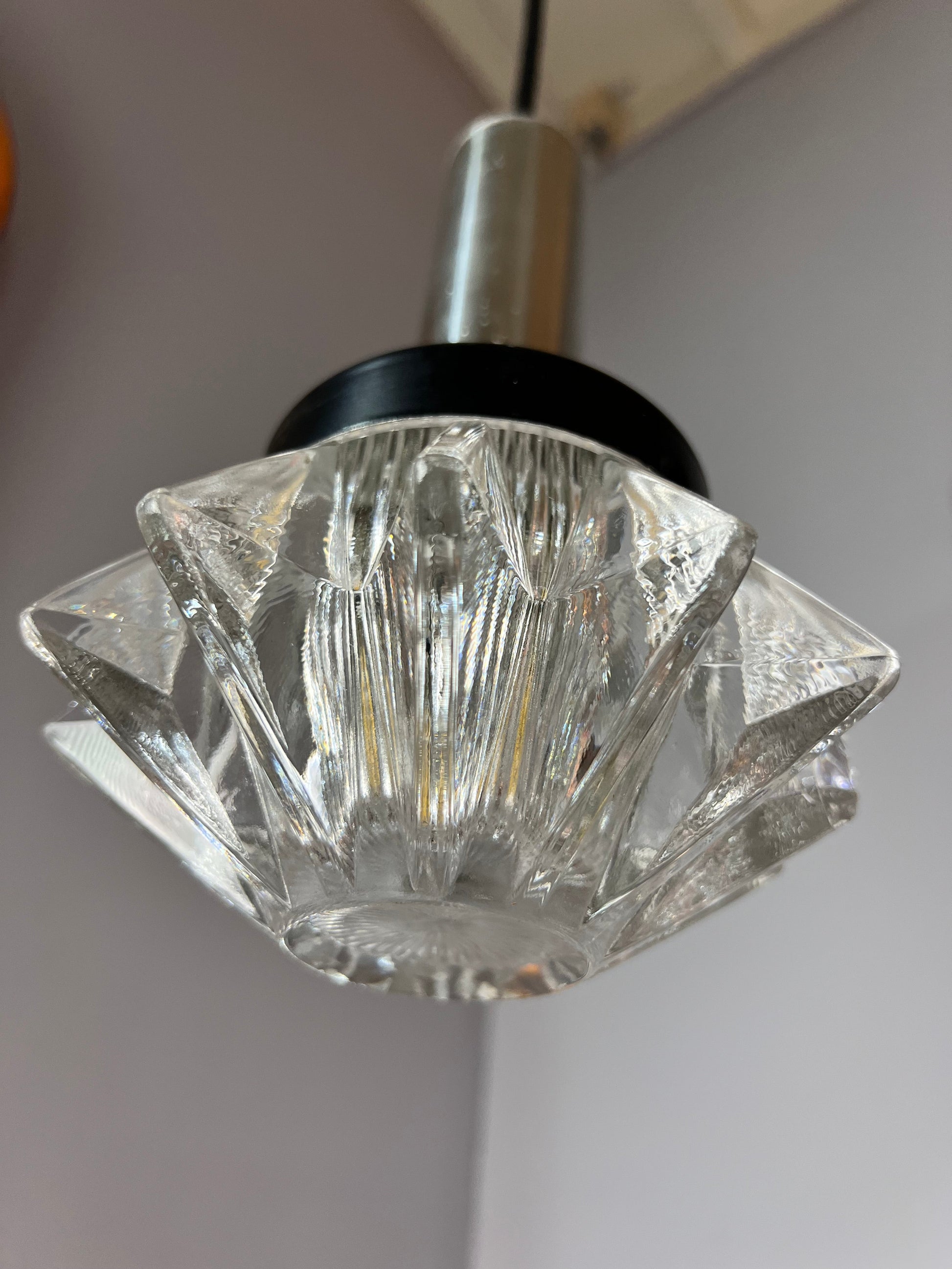 Die Hängelampe von Wortmann und Filz bringt stilvolles Space Age-Design der 70er Jahre in dein Zuhause. Mit ihrem transparenten Glas und schwarzen Metallelementen setzt sie elegante Akzente und sorgt für ein angenehmes Lichtambiente. Die Lampe eignet sich ideal als lokale Lichtquelle über dem Ess- oder Küchentisch, als hängende Nachttischlampe oder für gemütliche Leseecken. Die Kabellänge und -farbe passen wir individuell nach deinen Wünschen an.