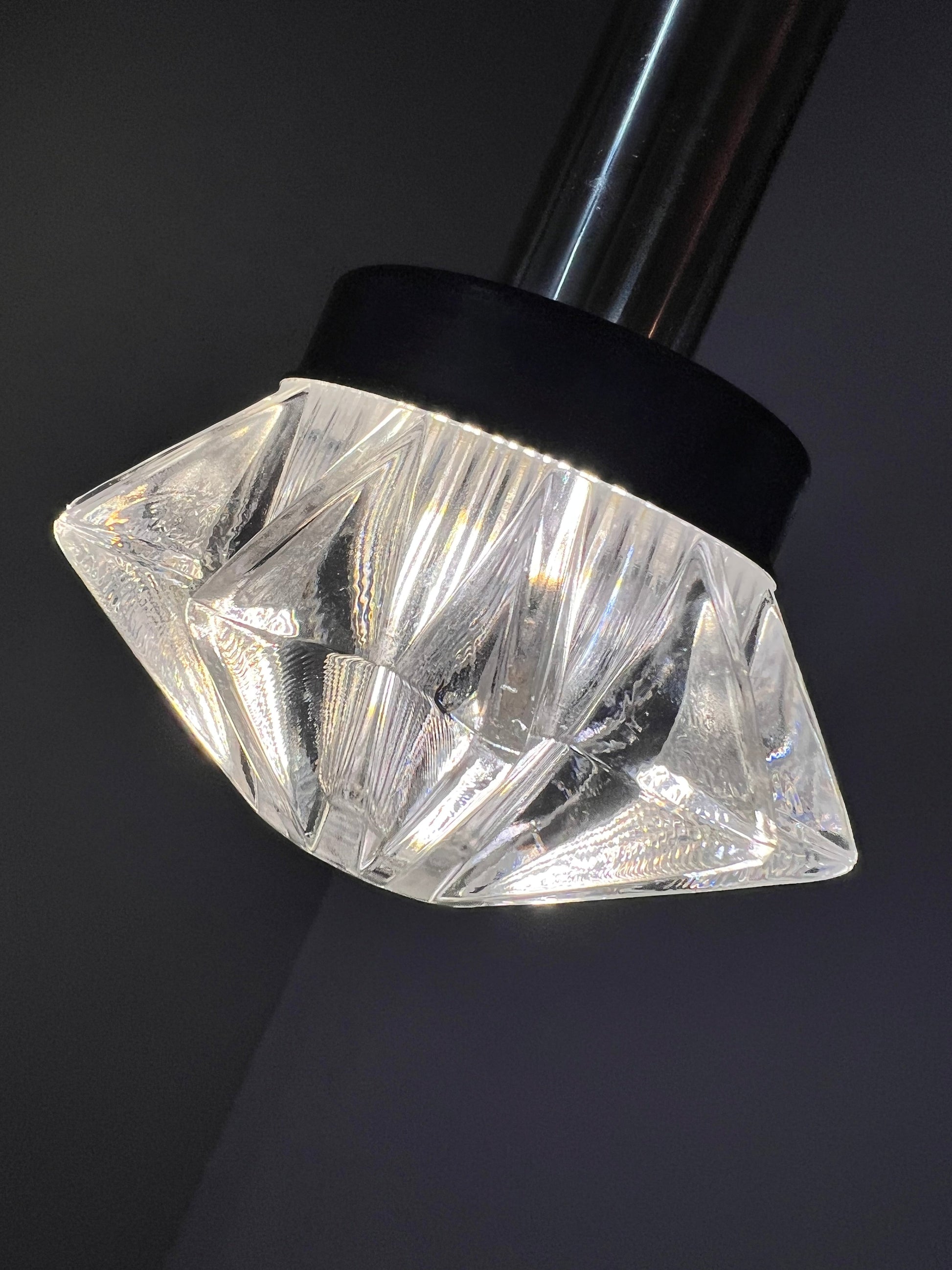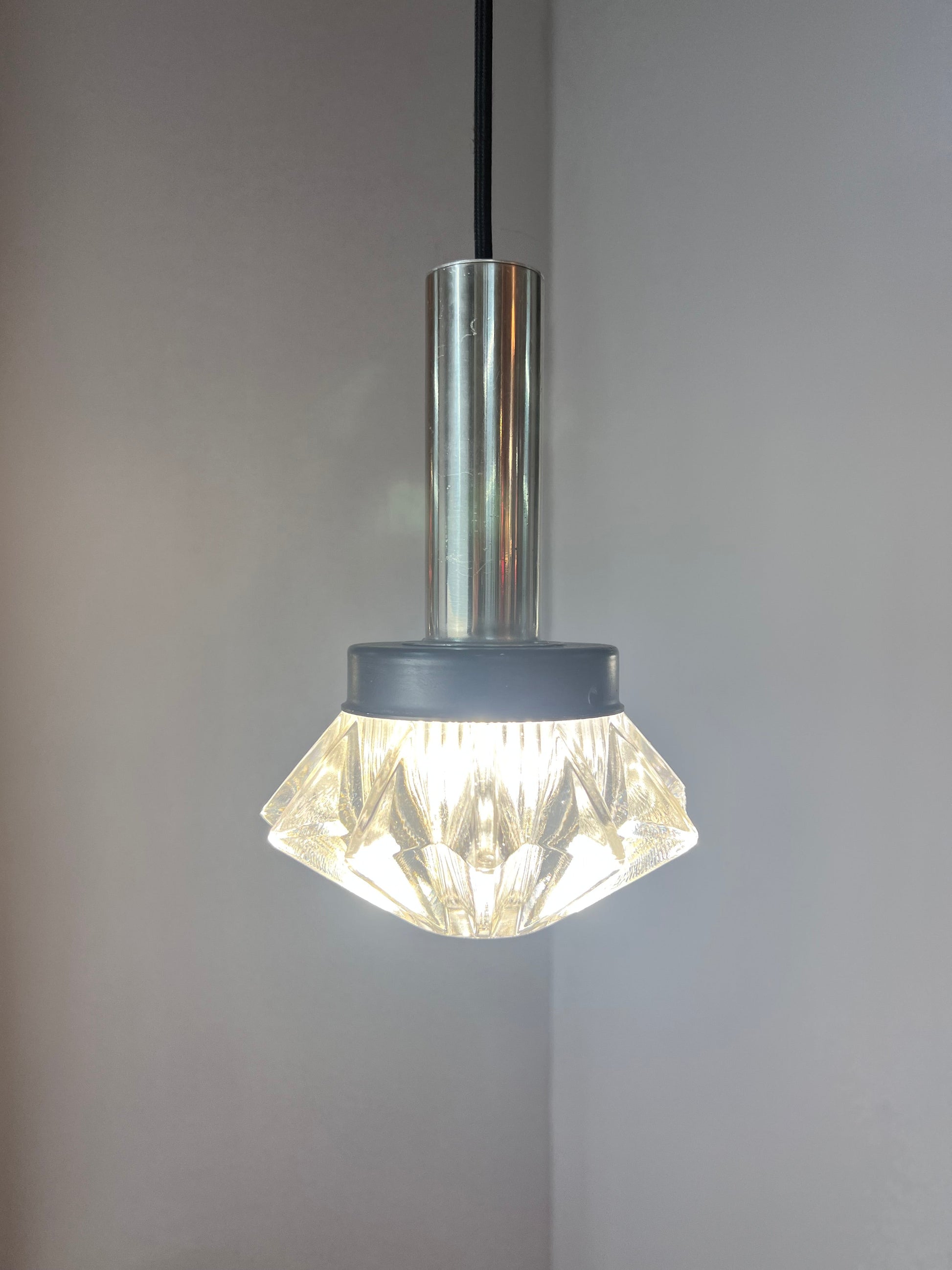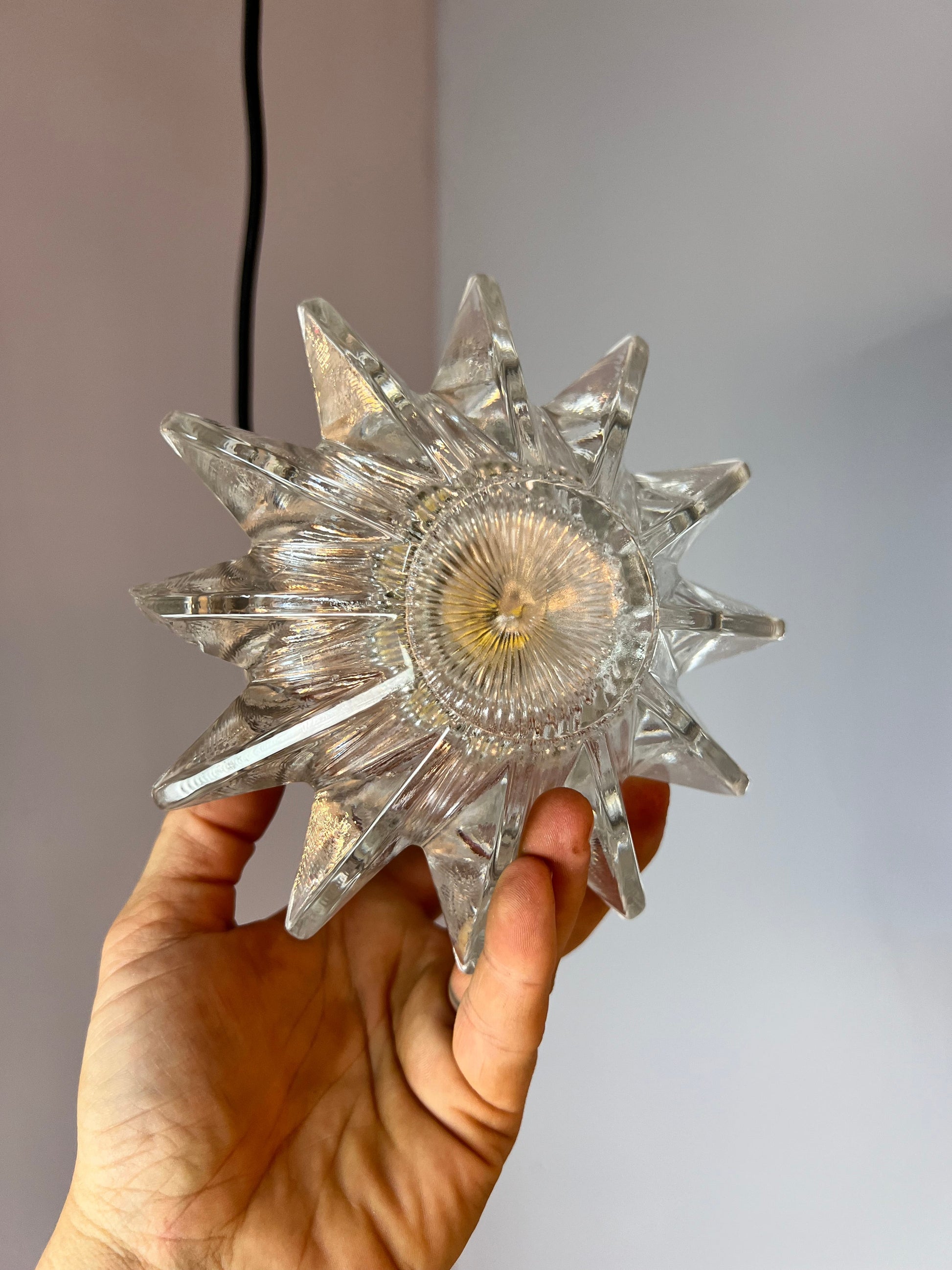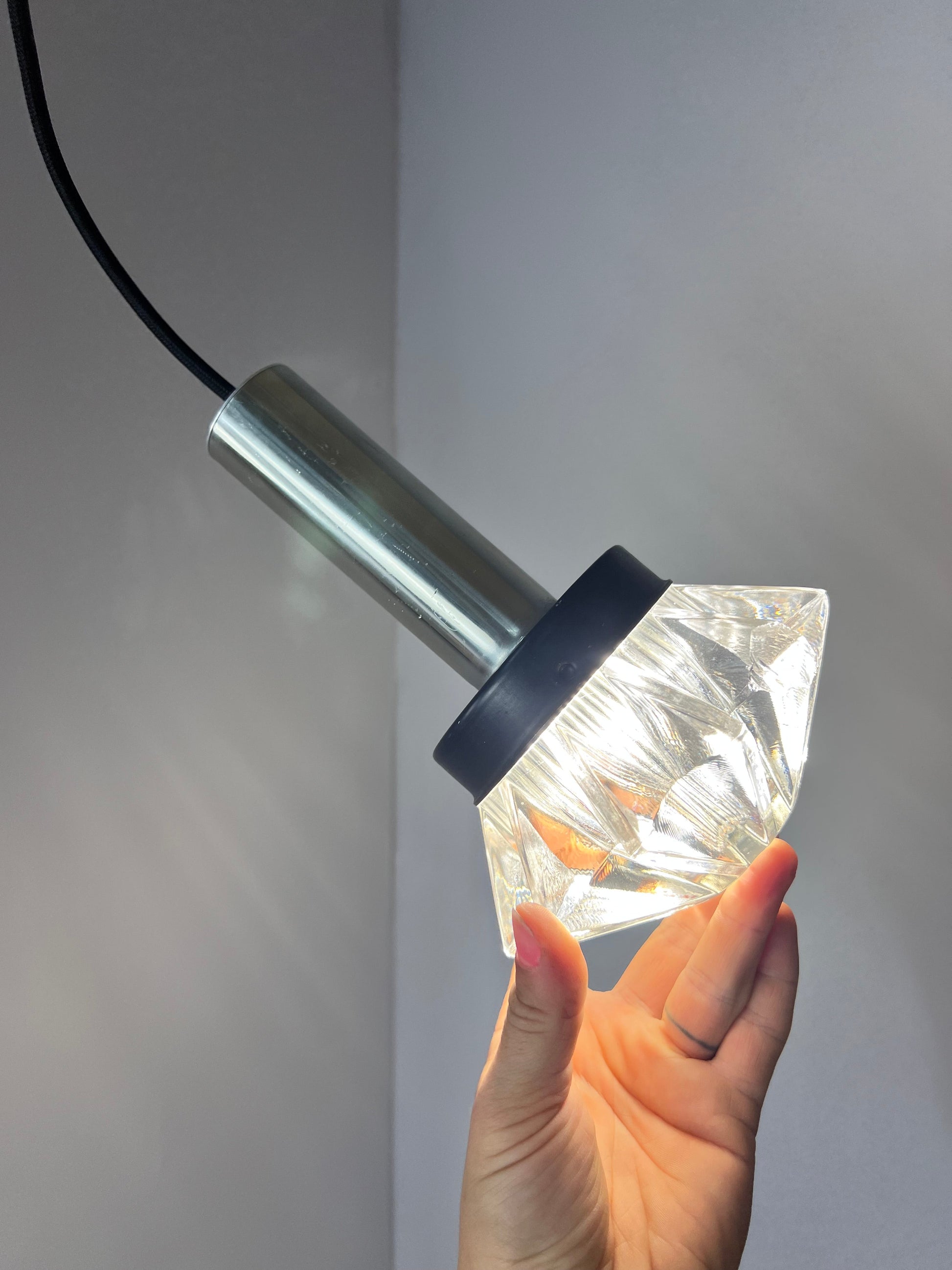 Die Hängelampe von Wortmann und Filz bringt stilvolles Space Age-Design der 70er Jahre in dein Zuhause. Mit ihrem transparenten Glas und schwarzen Metallelementen setzt sie elegante Akzente und sorgt für ein angenehmes Lichtambiente. Die Lampe eignet sich ideal als lokale Lichtquelle über dem Ess- oder Küchentisch, als hängende Nachttischlampe oder für gemütliche Leseecken. Die Kabellänge und -farbe passen wir individuell nach deinen Wünschen an.