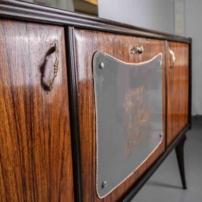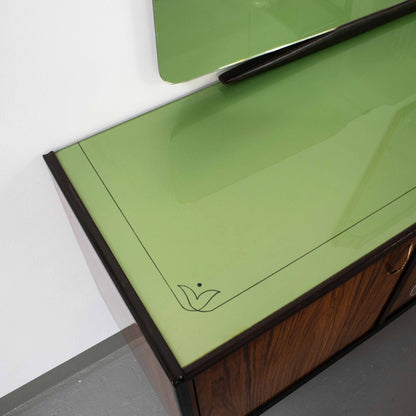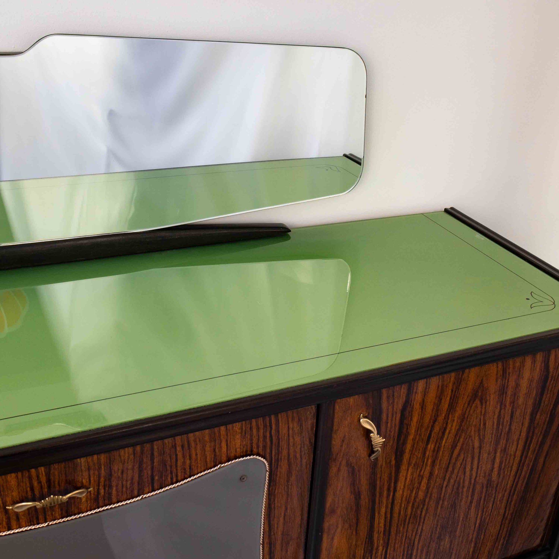 Dieses italienische Sideboard mit Bar und Spiegel ist ein wahres Meisterwerk des Art Déco. Es wurde in den 1930er Jahren gefertigt und ist in einem sehr guten Originalzustand. Die Glasplatte wurde von Hand bemalt und die vielzählig erhaltenen, wundervollen Details machen dieses Möbel einzigartig. Der Spiegel wurde von Antonio Koren aus Gorizia gefertigt und ist durch sein Original-Etikett auf der Rückseite verifiziert. Dieses Buffet ist ein bezauberndes Möbelstück, das jeden Raum mit seinem Charme verzaubert!