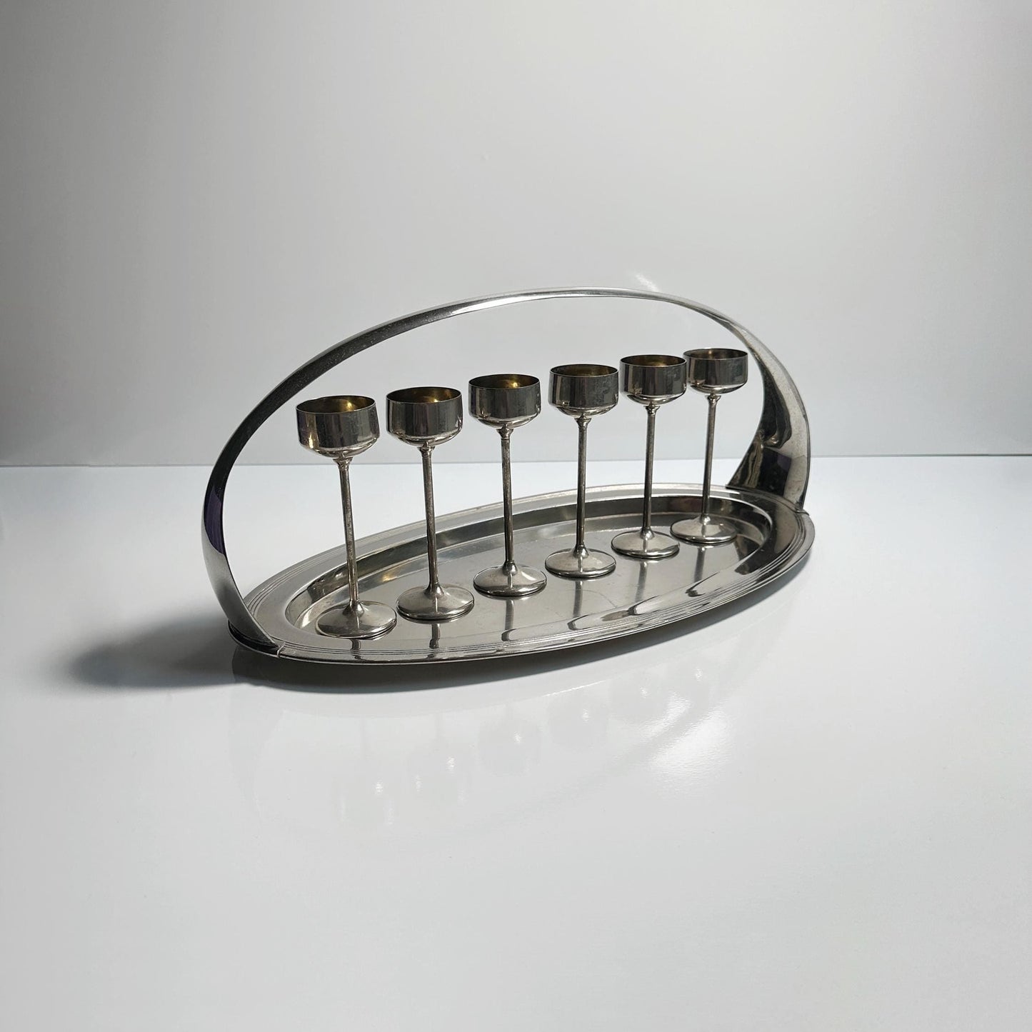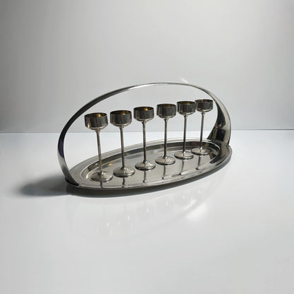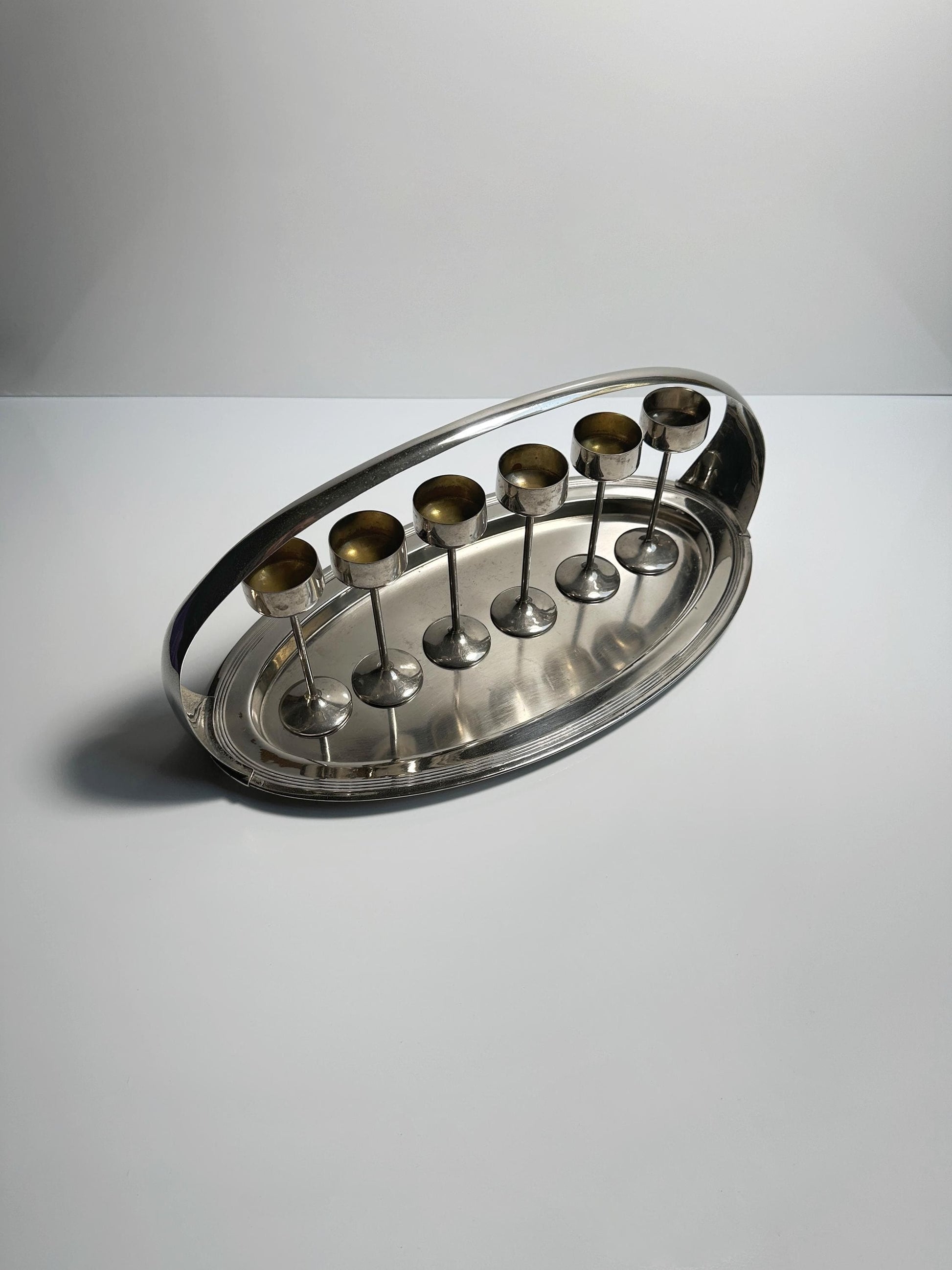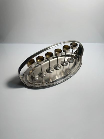 - Versilbertes Metall Set - Chrom Tablett und Kelche - Jugendstil Design von 1910