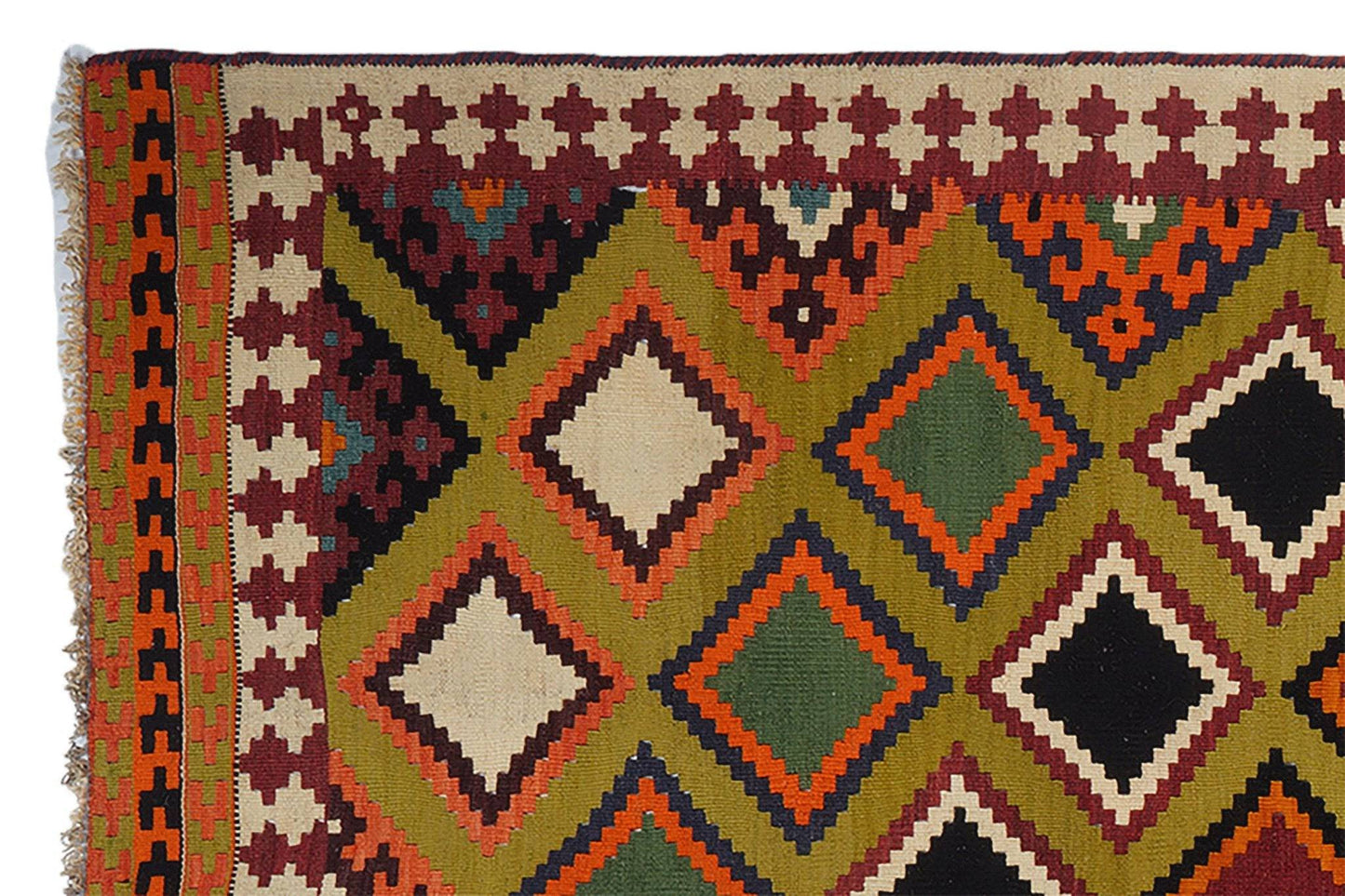 Dieser Vintage Teppich Kelim Gashgai 264x140cm ist ein einzigartiges Kunstwerk der traditionsreichen Kultur der türkisch sprechenden Nomadenstämme aus Fars. Aus 100% Schurwolle handgewebt, verfügt es über kleine Schlitze, die typisch für die Schlitzwebtechnik und den Farbwechsel sind. Das einzigartige Design ist von den herkömmlichen Mustern und Farbmischungen der Nomaden inspiriert und bietet eine einmalige Mischung an Farben und Mustern.