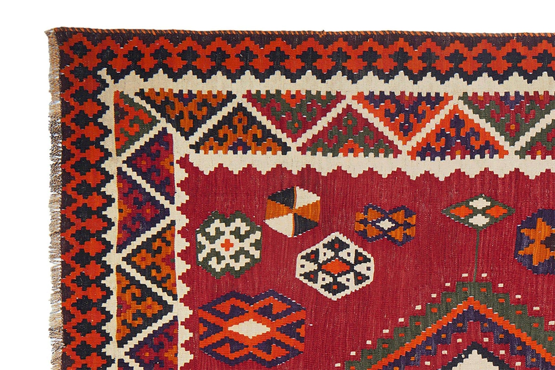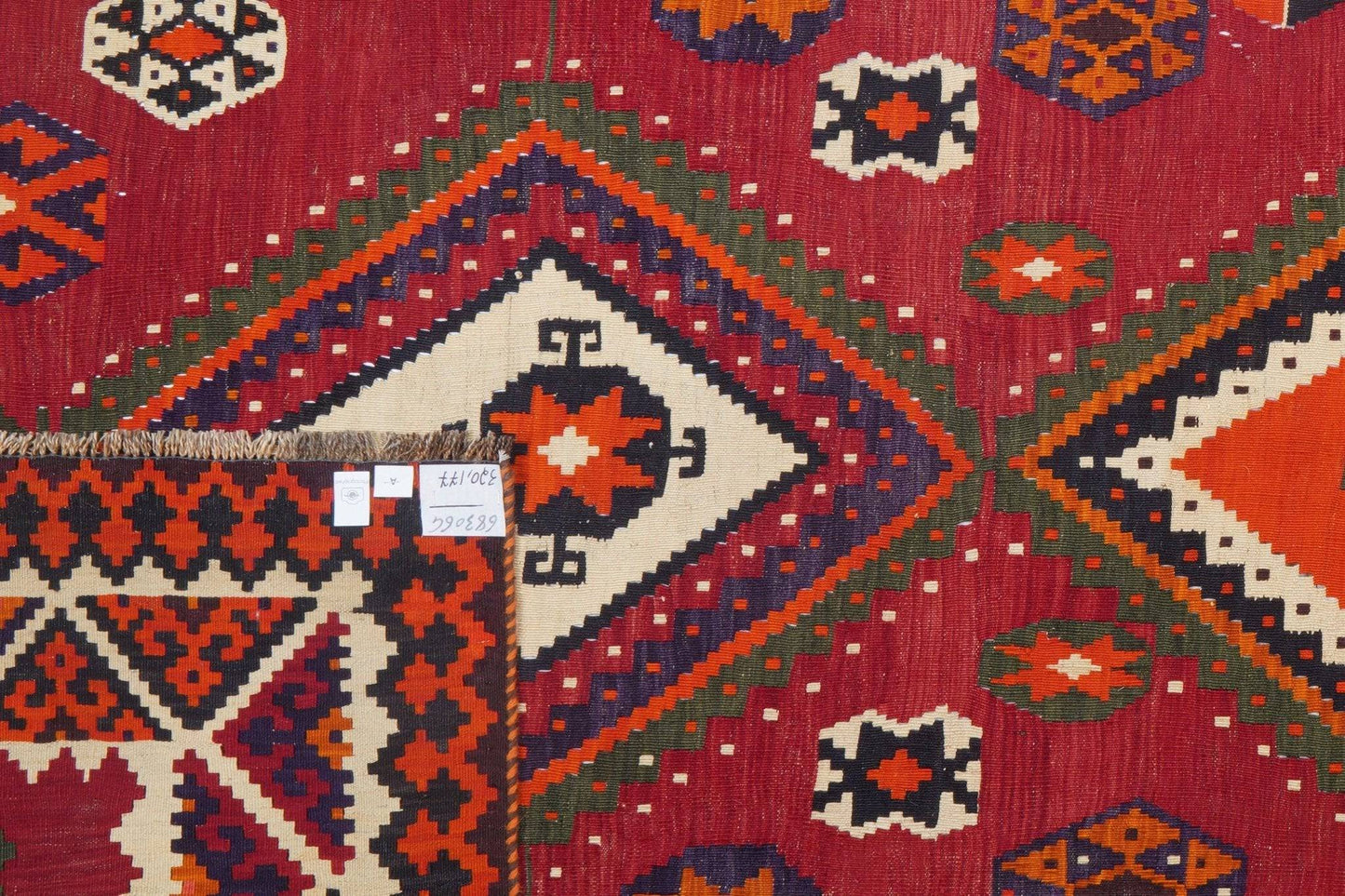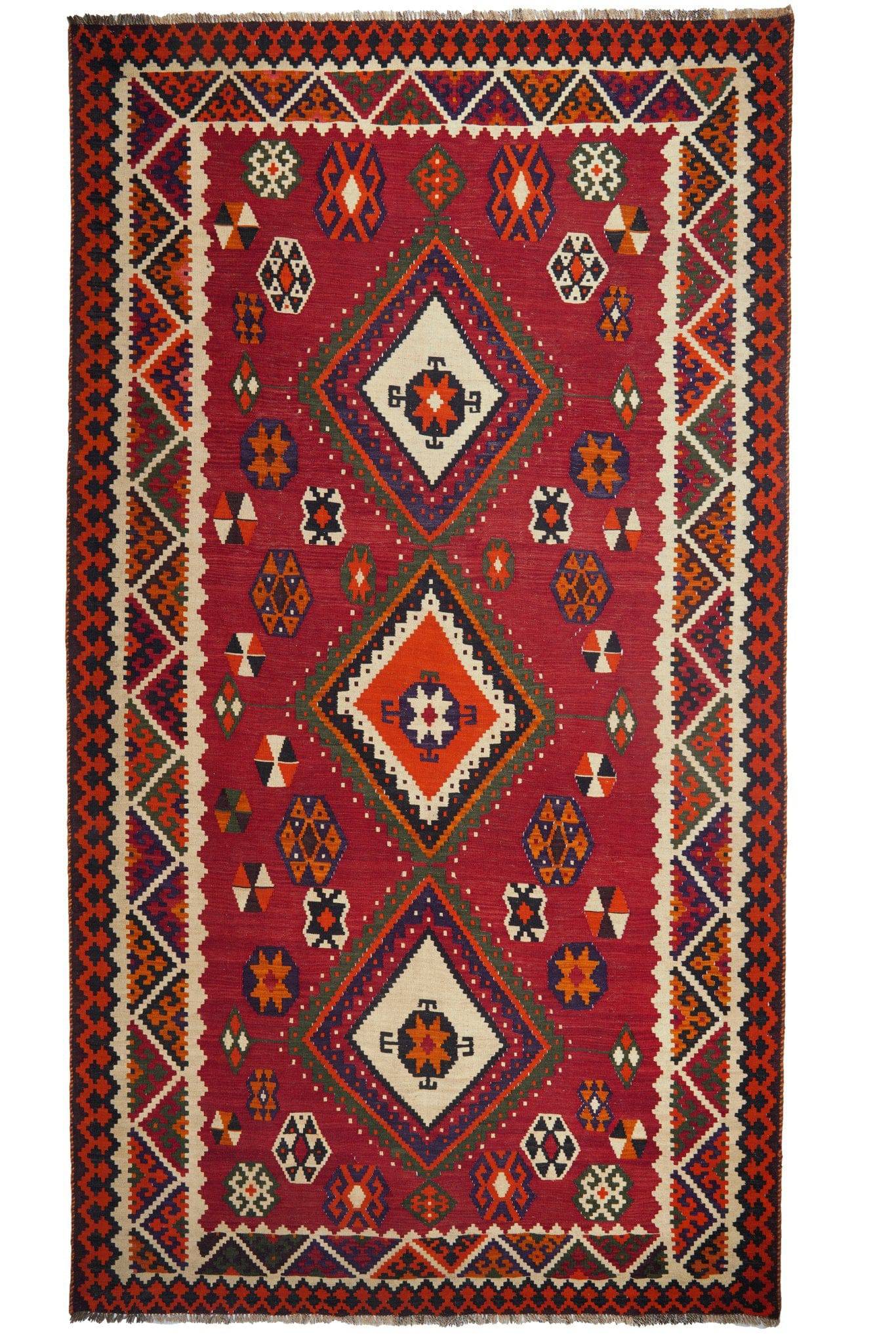 Dieser Vintage Teppich Kelim Gashgai 320x177cm wurde von türkisch sprechenden Nomadenstämme aus Fars, Iran, hergestellt. Verwendet wird die Schlitztechnik, die typisch für geometrische Motive ist und Farbwechsel ermöglicht. Jedes Teppichstück ist dank der Erfahrung und persönlichen Vorlieben der Nomaden einzigartig.