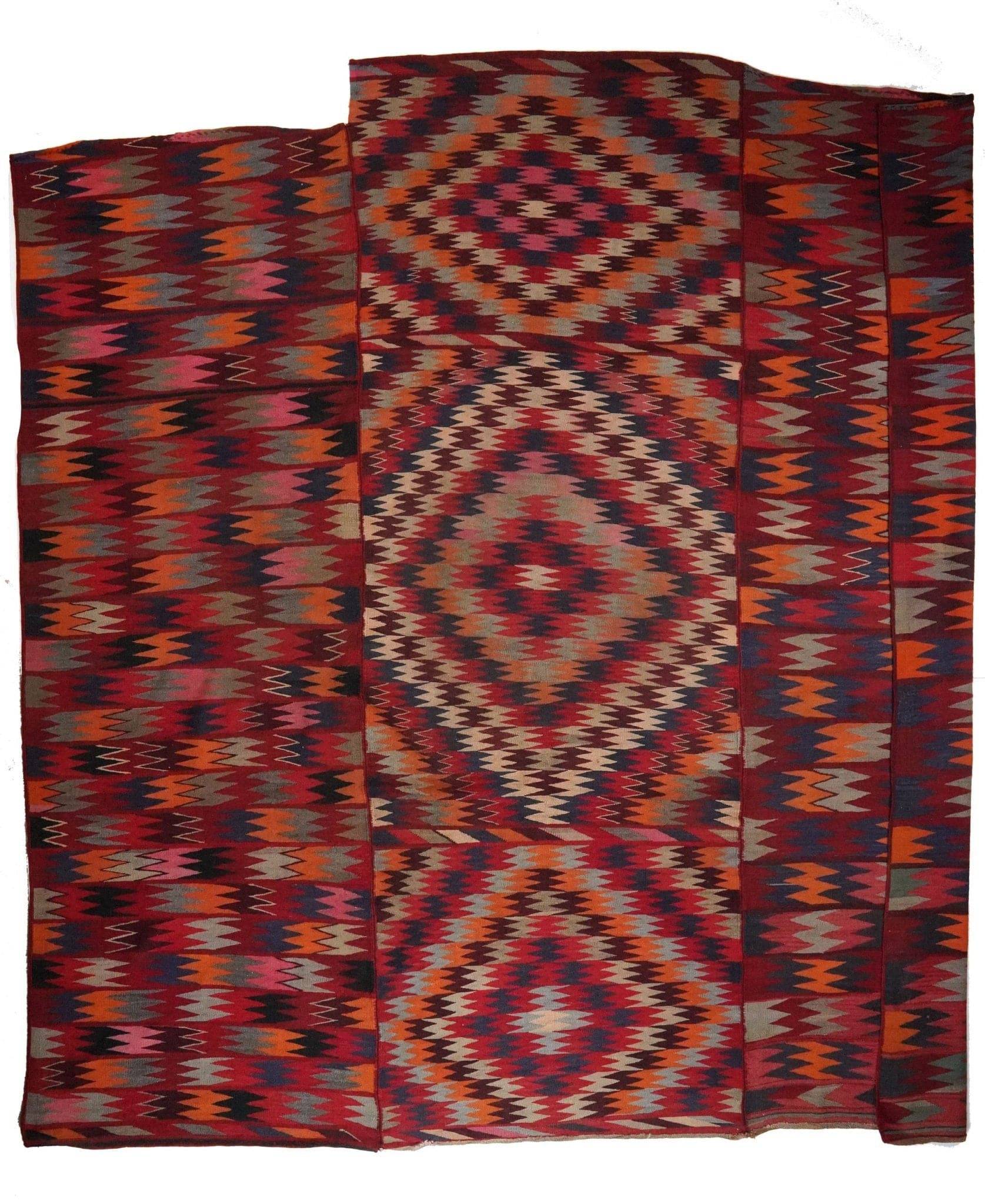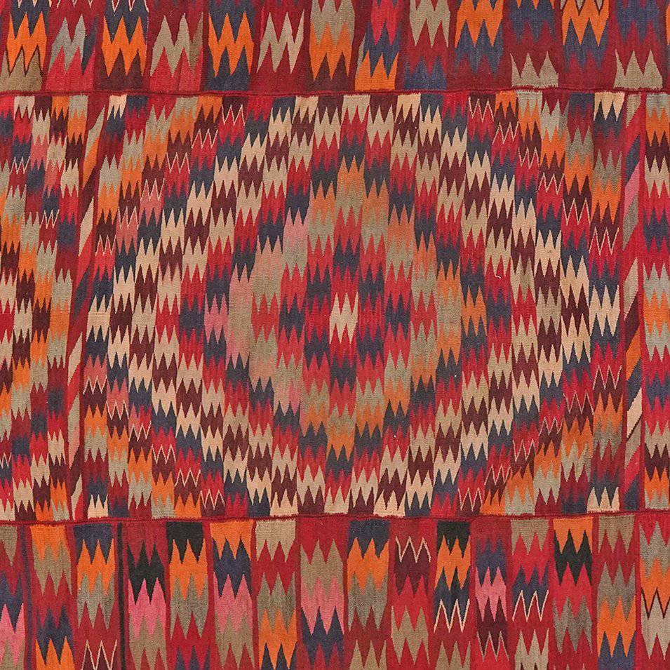 Der Vintage Teppich Kelim Old 301x294cm stammt aus der Antike und wurde meist für den privaten Gebrauch von ihren Herstellern gewebt - manche davon wurden sogar auf Basaren im ganzen Iran verkauft. Oft dienten sie als Bodenbelag oder zum Abdecken und Dekorieren von Zelten und Häusern innen und außen, als Schutz für Tiere wie Pferde, Esel oder Kamelen und für den Transport von Haushaltsgegenständen. Diese Vintage-Kelim wurden sorgfältig behandelt und aufgearbeitet, sodass sie nun in neuen Häusern ein zweites Leben erhalten. Florhöhe ca. 5cm
