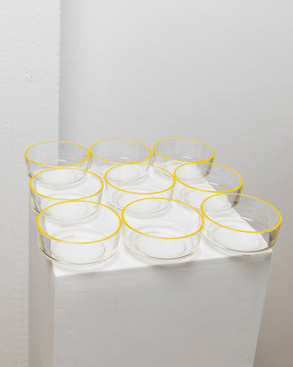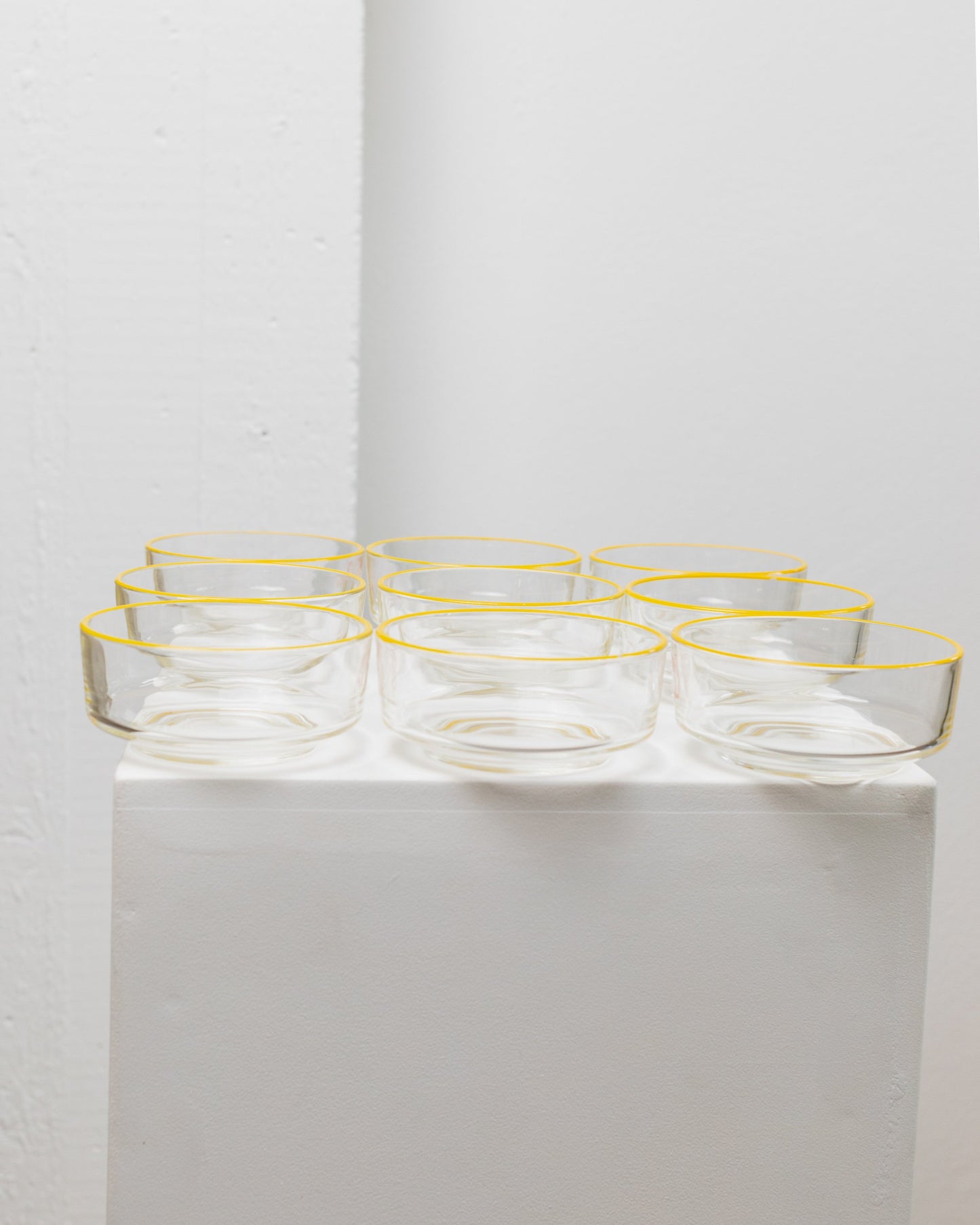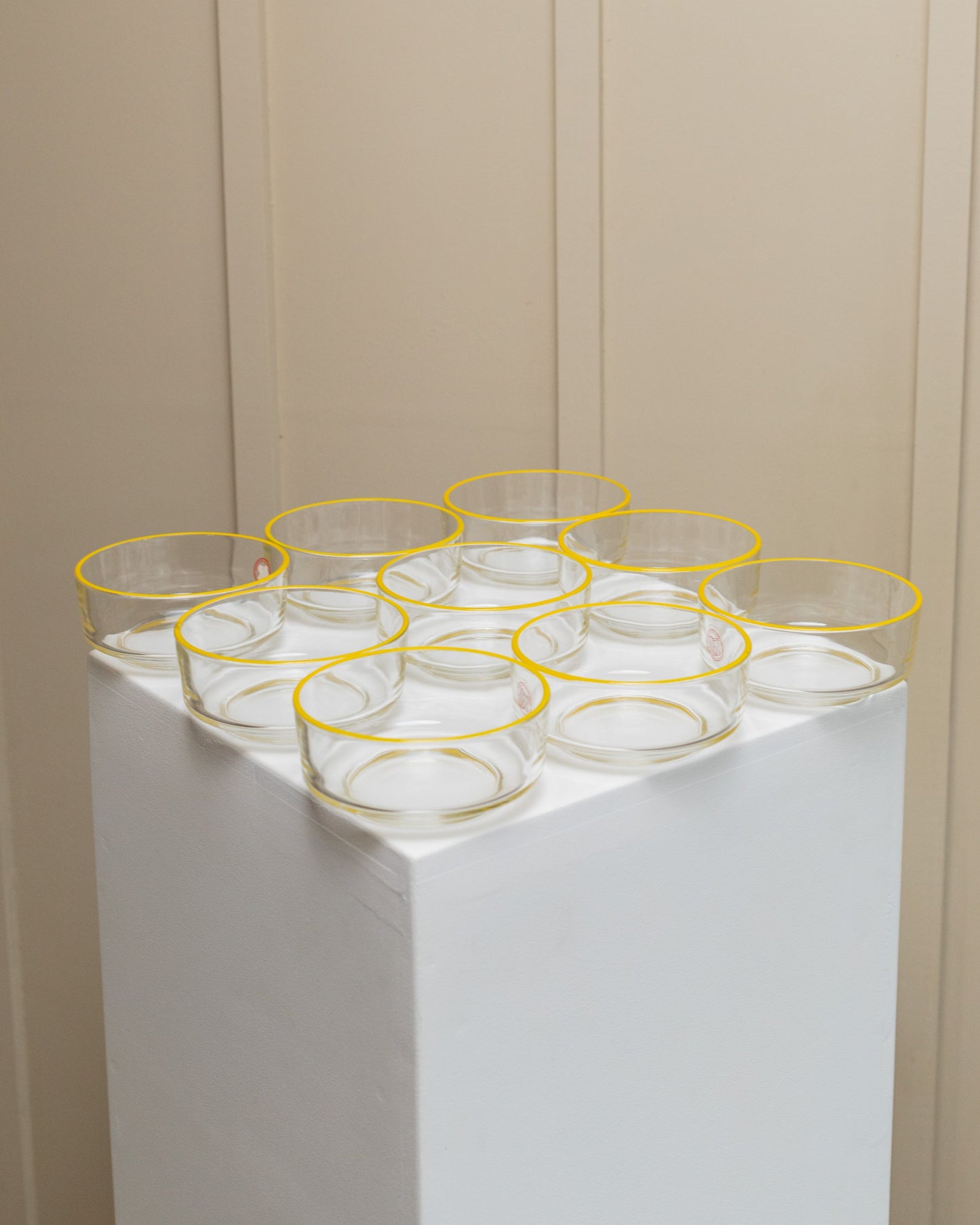 Entdecke das zeitlose Design der Vintage Schale Empoli Glas von Fratelli Buggiani. Dieses Set aus 9 Schalen vereint Eleganz und Funktionalität in einem charmanten Vintage-Stil. Die gelbe Farbe am Rand verleiht den Schalen einen besonderen Akzent, der in jeder Küche oder als Dekoration im Wohnzimmer ein Highlight setzt. Perfekt für Desserts, Eis oder Obst, sind diese Schalen vielseitig einsetzbar und ein Muss für Liebhaber von Mid-Century Modern und Space Age Design.