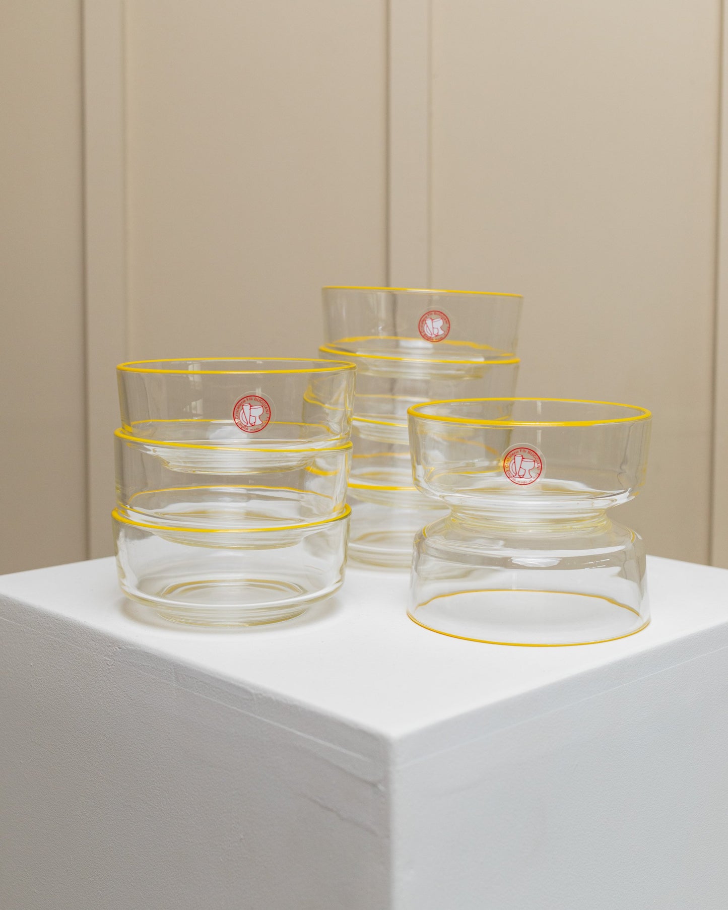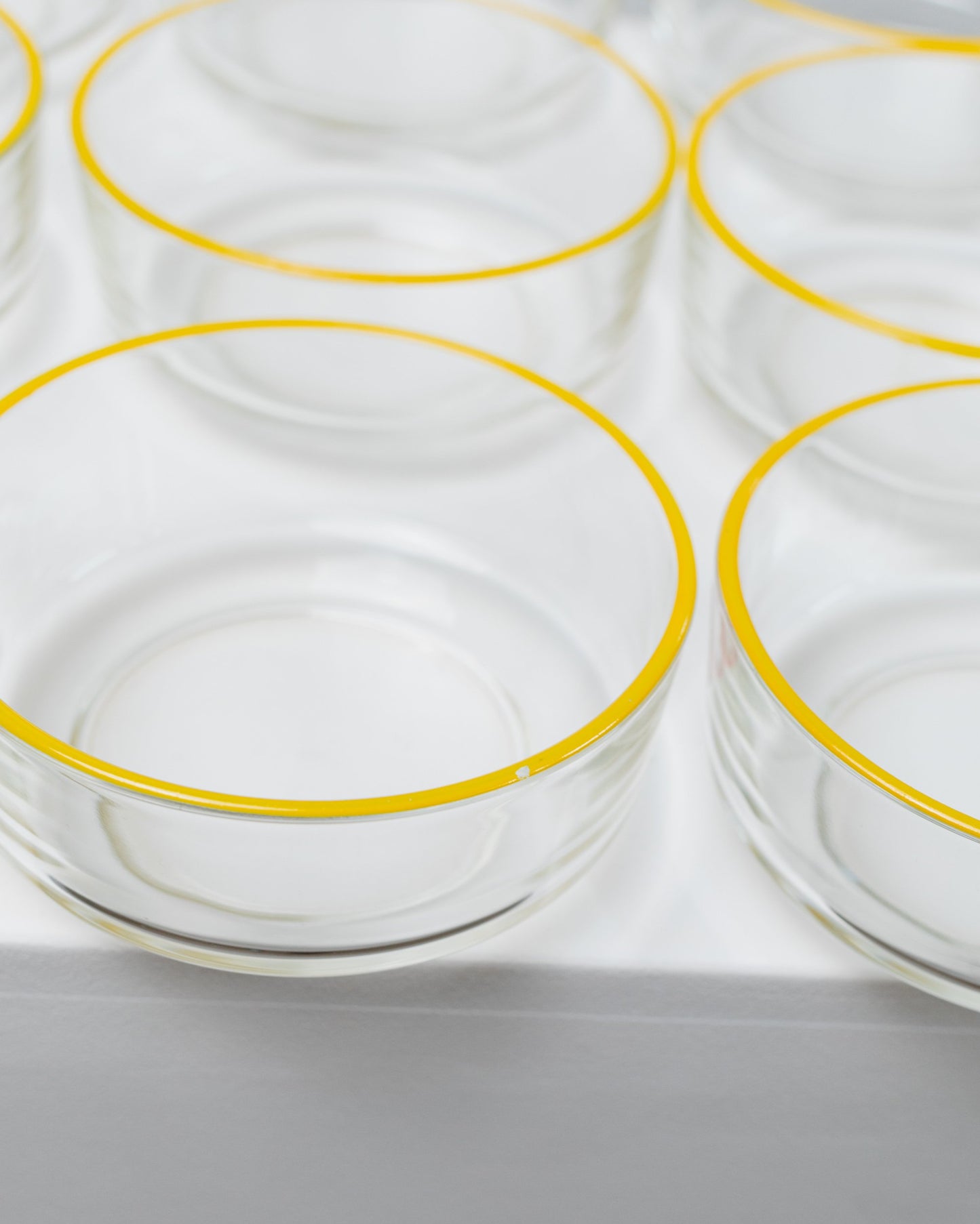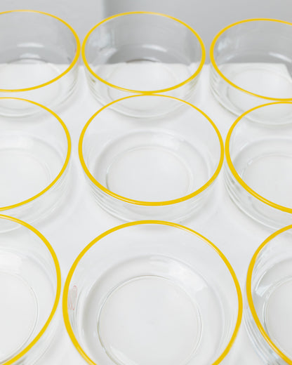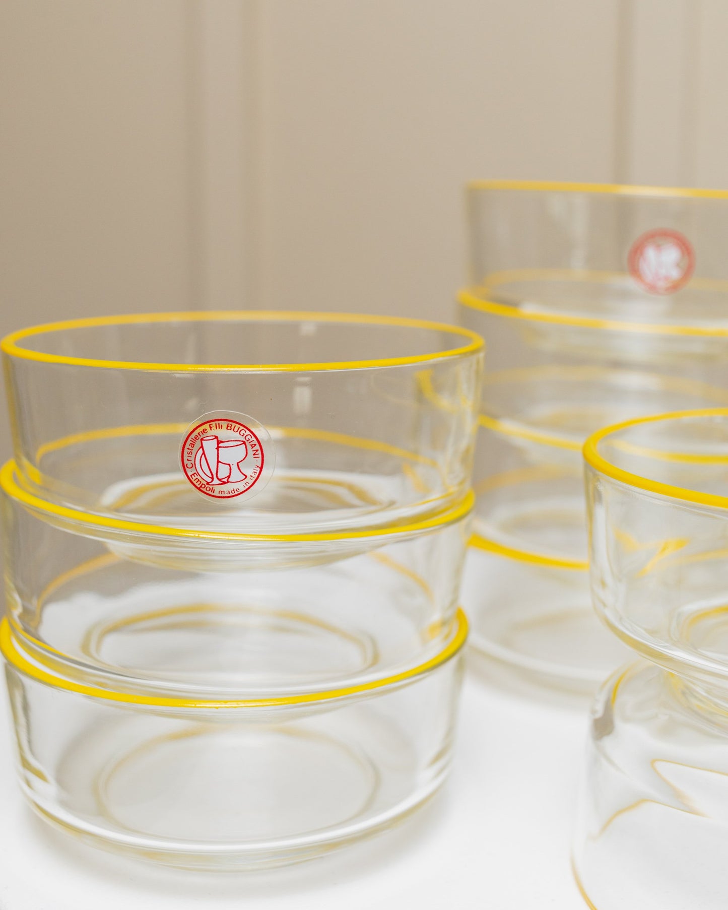 Entdecke das zeitlose Design der Vintage Schale Empoli Glas von Fratelli Buggiani. Dieses Set aus 9 Schalen vereint Eleganz und Funktionalität in einem charmanten Vintage-Stil. Die gelbe Farbe am Rand verleiht den Schalen einen besonderen Akzent, der in jeder Küche oder als Dekoration im Wohnzimmer ein Highlight setzt. Perfekt für Desserts, Eis oder Obst, sind diese Schalen vielseitig einsetzbar und ein Muss für Liebhaber von Mid-Century Modern und Space Age Design.