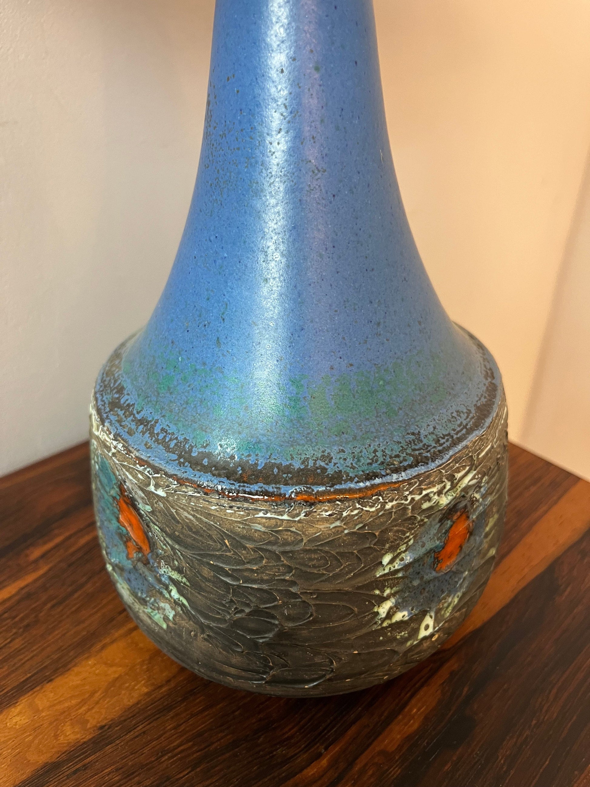 Verleihe Deinem Zuhause mit dieser stilvollen Tischlampe aus Westdeutscher Keramik einen Hauch von Mid-Century-Charme. Der handgefertigte Keramiksockel in Blau und Braun macht jede Lampe zu einem echten Unikat. Der hochwertige Stoffschirm sorgt für ein angenehm warmes, diffuses Licht und schafft eine gemütliche Atmosphäre in jedem Raum. Perfekt als Akzentbeleuchtung im Wohnzimmer, Schlafzimmer oder Büro.