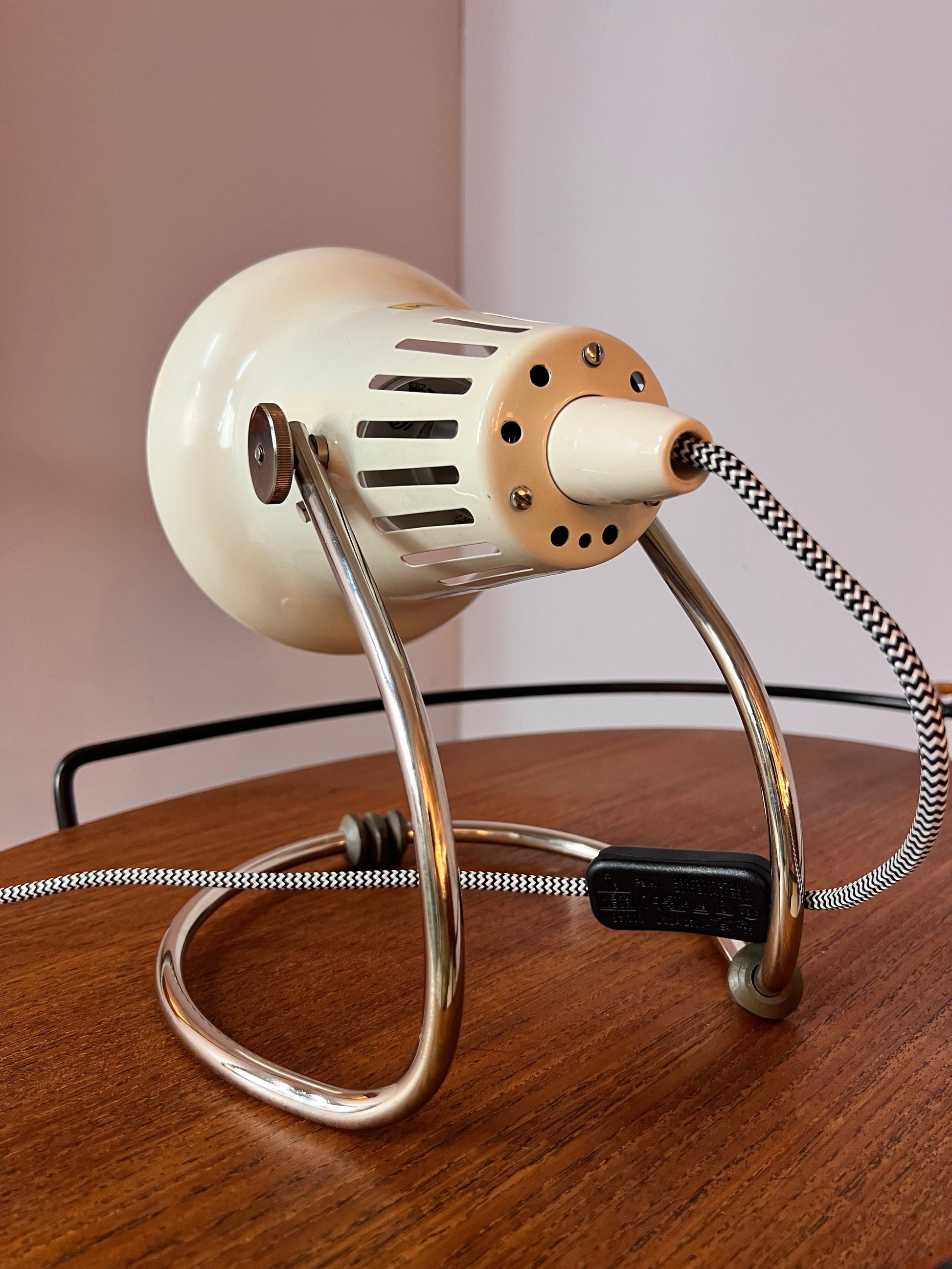 Die Tischlampe G358 von Osram bringt authentisches Mid-Century-Design der 70er Jahre in Dein Zuhause. Ursprünglich als Wärmelampe konzipiert, wurde sie professionell umgebaut und verfügt jetzt über eine E27-Fassung. Das klassische Farbschema in Weiß und Silber harmoniert mit dem robusten Metallgehäuse und macht die Lampe zu einem stilvollen Akzent auf jedem Tisch. Dank des normalen Stromkabels mit Stecker und Schalter ist sie sofort einsatzbereit.