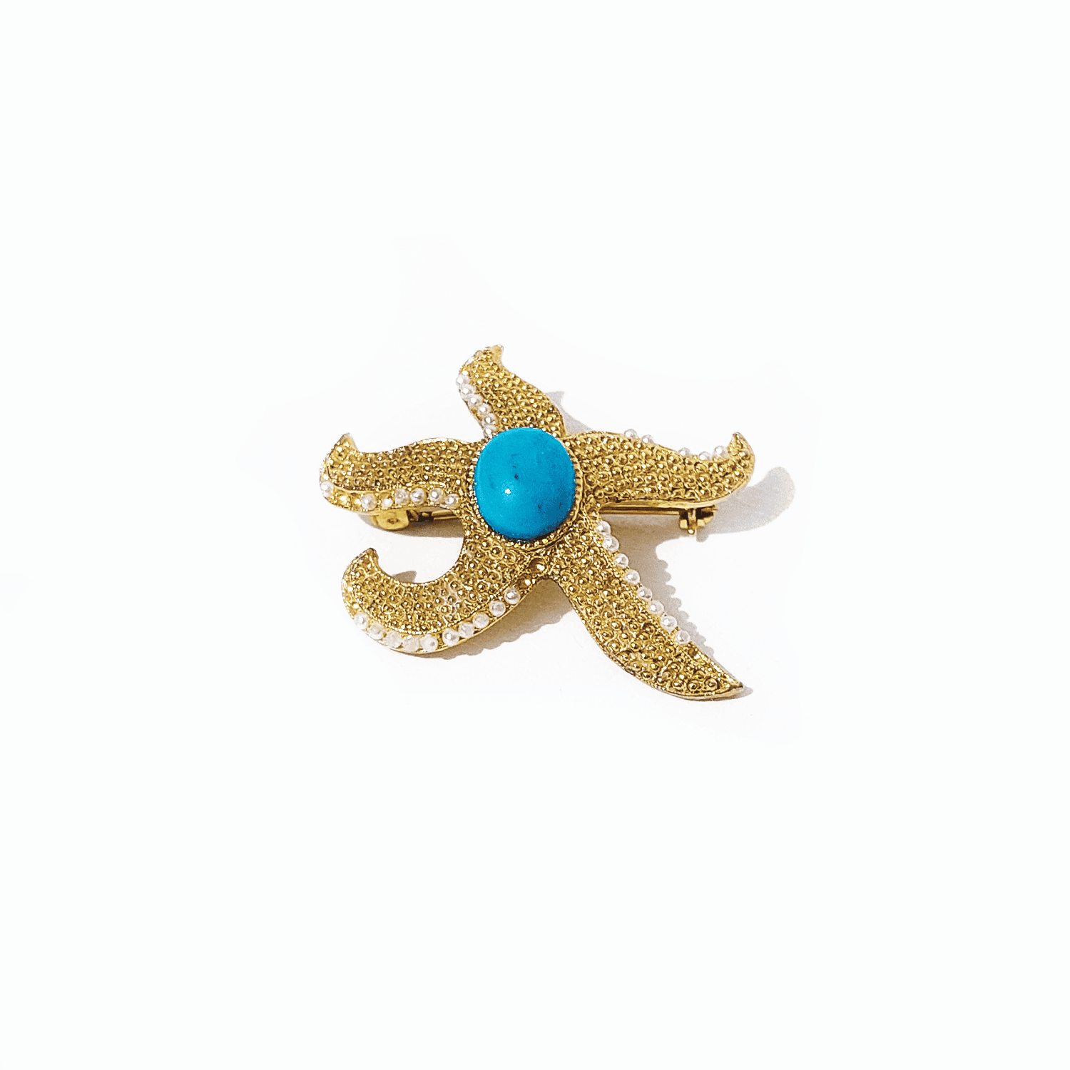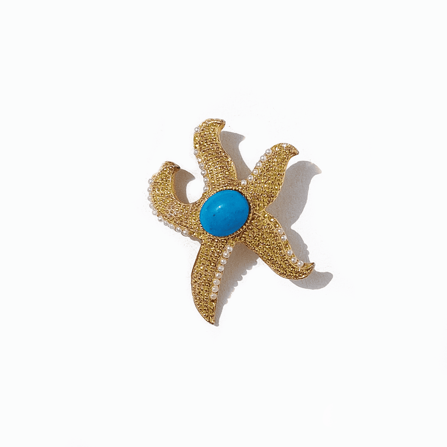Entdecke die zeitlose Eleganz der Vintage Brosche Seestern von Doré und Blau. Diese exquisite Brosche vereint den Charme des Mid-Century Modern Designs mit der faszinierenden Ästhetik des Space Age. Perfekt für Liebhaber von einzigartigem Schmuck, verleiht sie jedem Outfit einen Hauch von Raffinesse. Die Kombination aus goldenen und blauen Tönen macht sie zu einem echten Hingucker.