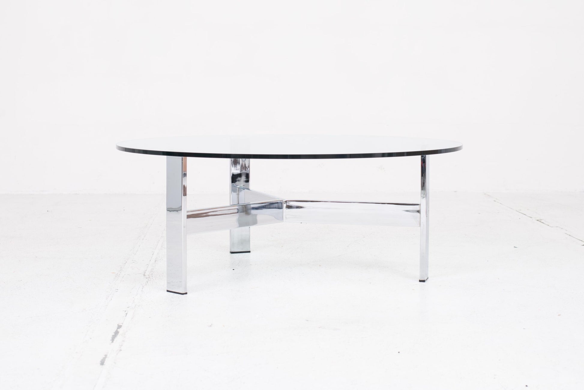 Mit einer Höhe von 46 cm und einem Durchmesser von 120 cm bietet dieser Tisch großzügige Dimensionen, ohne dabei schwerfällig zu wirken. Die Kombination aus Glas und dem minimalistischen Untergestell macht ihn zu einem idealen Begleiter für Dein Zuhause. Lass Dich von der Space Age-Ästhetik inspirieren und bringe ein Stück Designgeschichte in Dein Wohnzimmer.