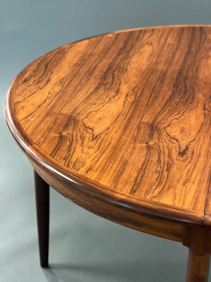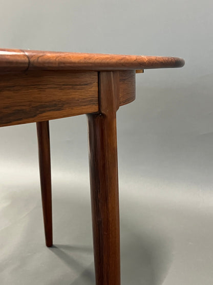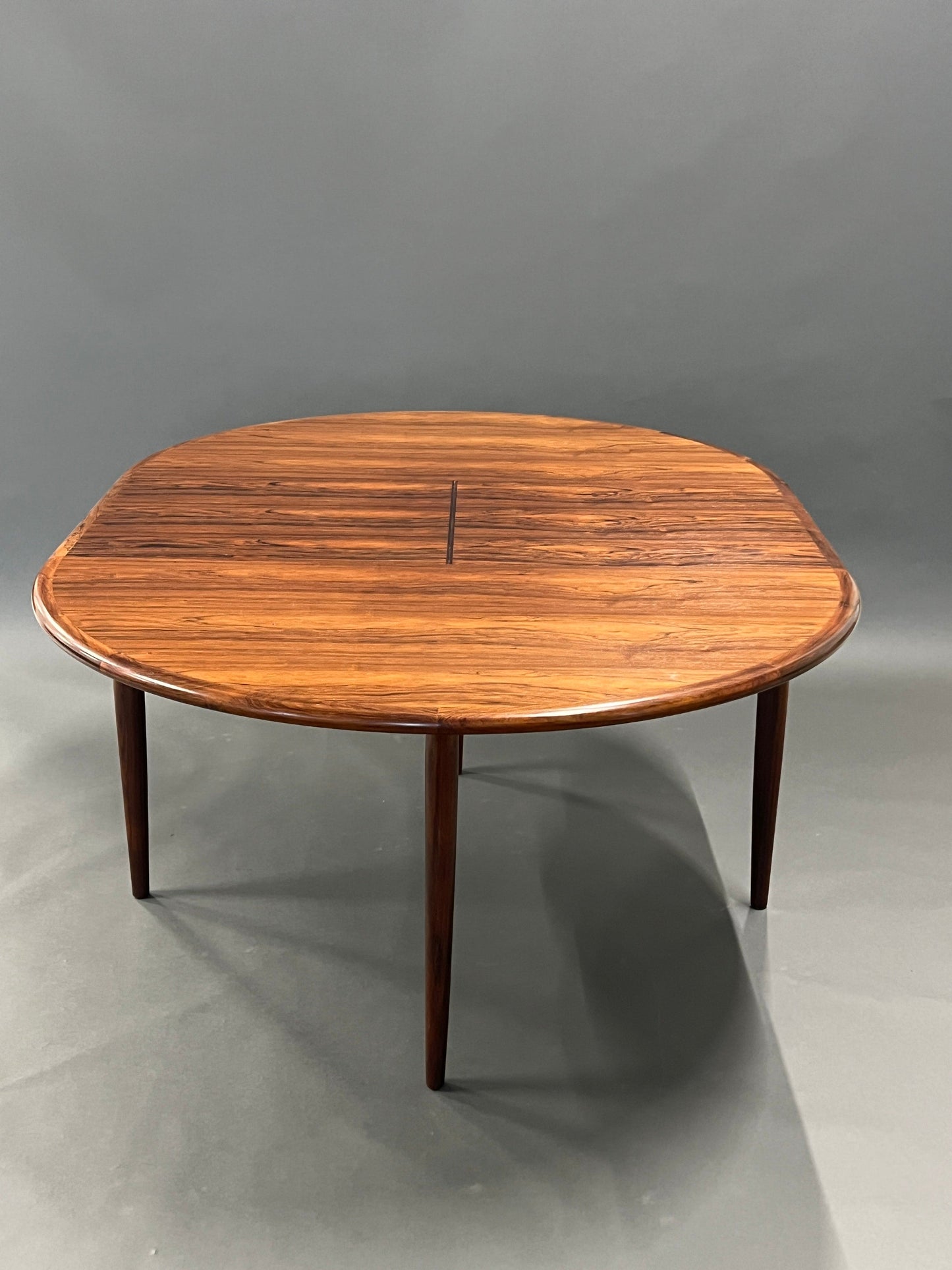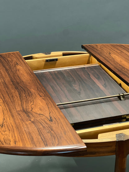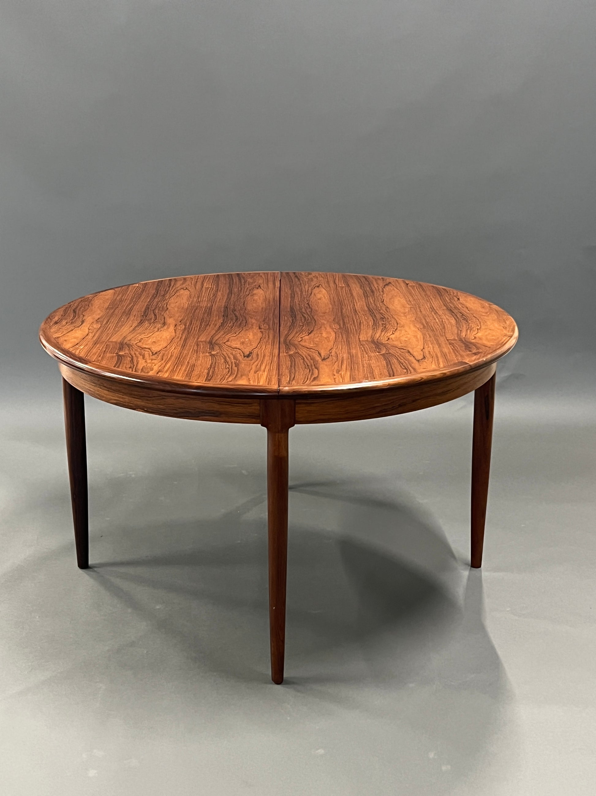 Ein runder Esstisch von Niels O. Møller, der sich per Butterfly-Einlage oval erweitern lässt. Dänisches Mid-Century-Design, ruhig proportioniert und fein gearbeitet. Die weiche Kante lädt zum Sitzen rundum; die Form schafft Nähe und Großzügigkeit zugleich. Im geschlossenen Zustand kompakt, ausgezogen mit klarer Länge für größere Runden. Ein Tisch, der Material, Handwerk und Funktion selbstverständlich verbindet. Ideal für Essbereiche mit Anspruch auf langlebige Gestaltung. Ein zurückhaltendes Statement – mit der warmen Tiefe von Holz und der Klarheit skandinavischer Linien. Seine Präsenz bleibt leise.