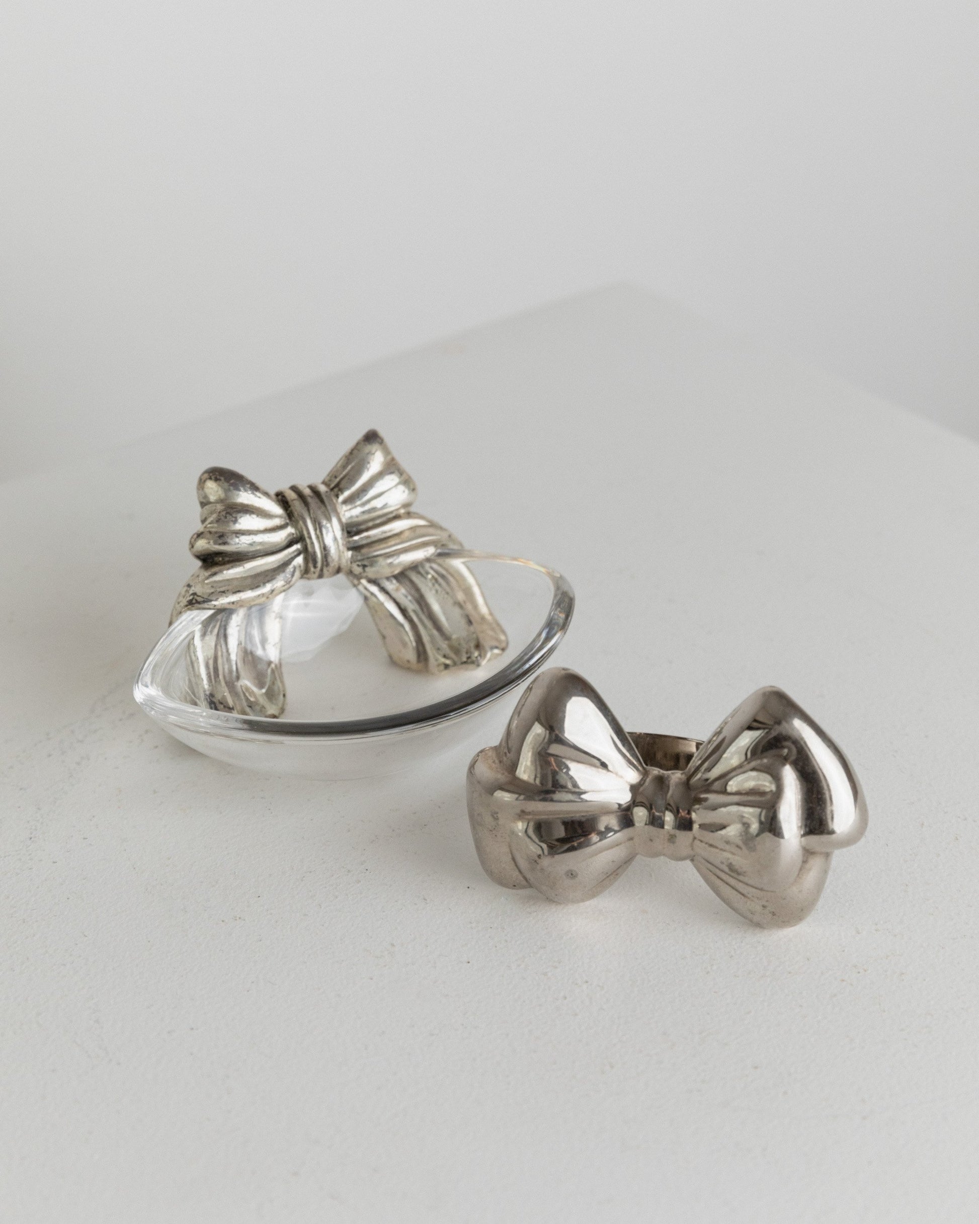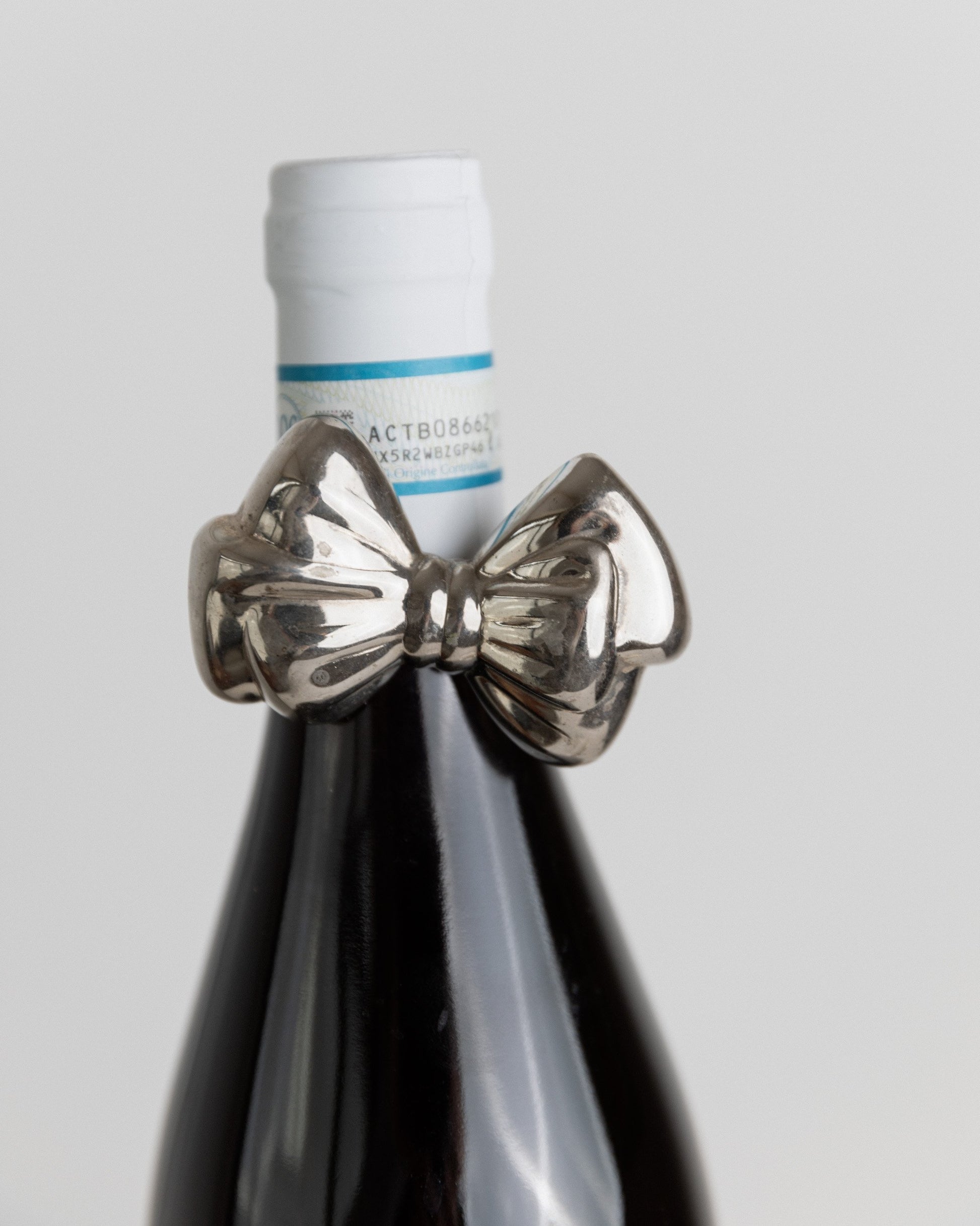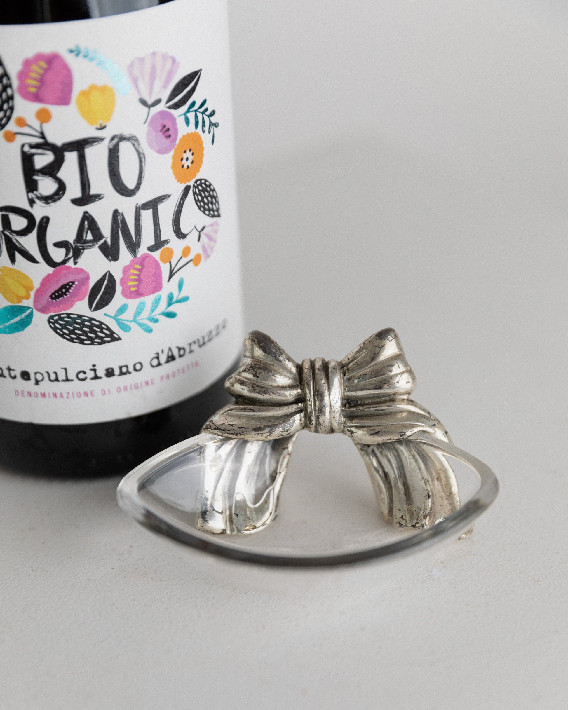 Entdecke die zeitlose Eleganz der 1960er Jahre mit diesem Set aus zwei Vintage-Flaschenzubehörteilen. Diese versilberten Accessoires aus Italien verleihen jeder Weinflasche einen Hauch von Raffinesse. Das Set besteht aus einer Glas-Schale mit einer versilberten Schleife und einem Ring, der perfekt auf den Flaschenhals passt. Ideal als Geschenk, besonders in Kombination mit hochwertigen Wein- oder Likörflaschen.