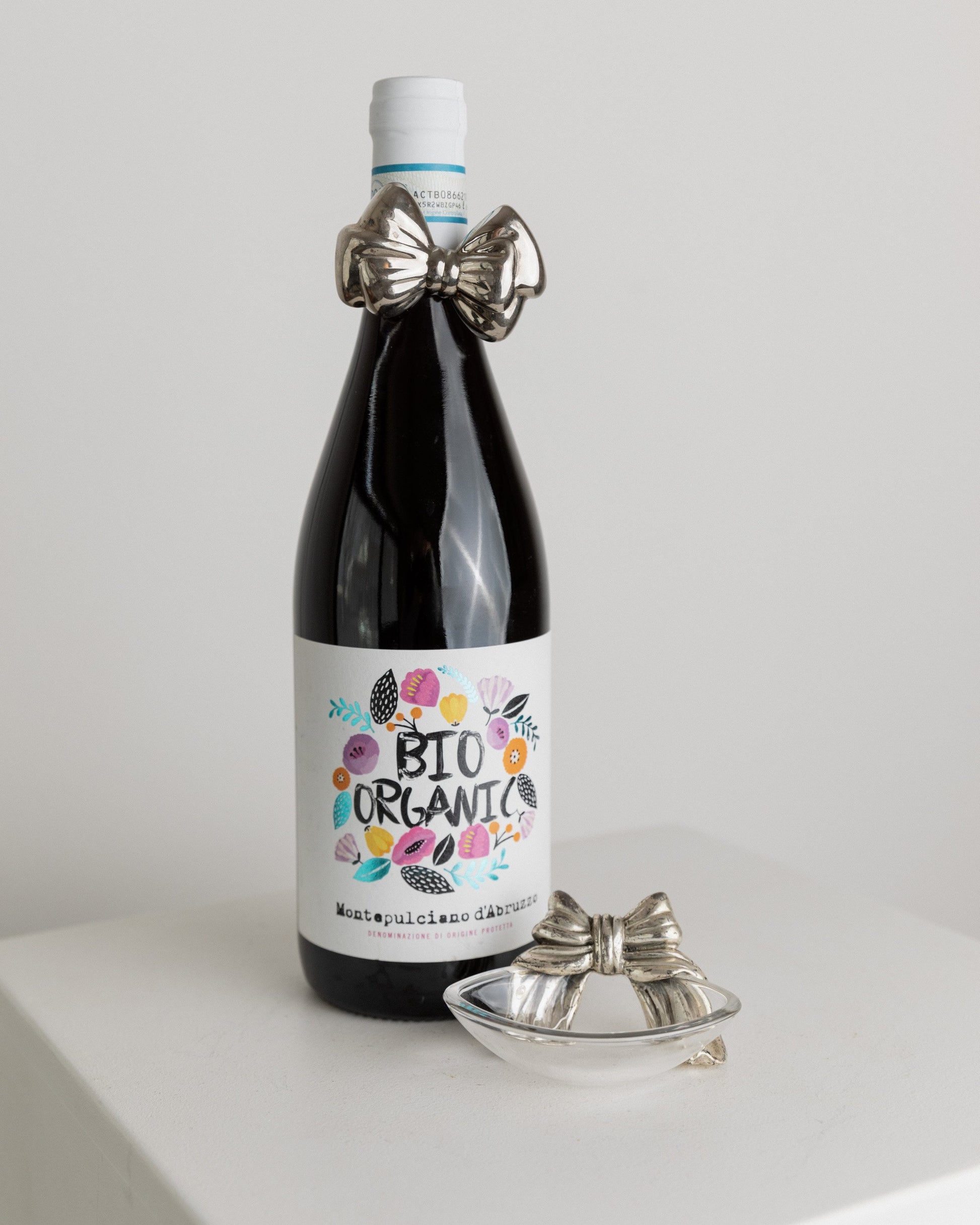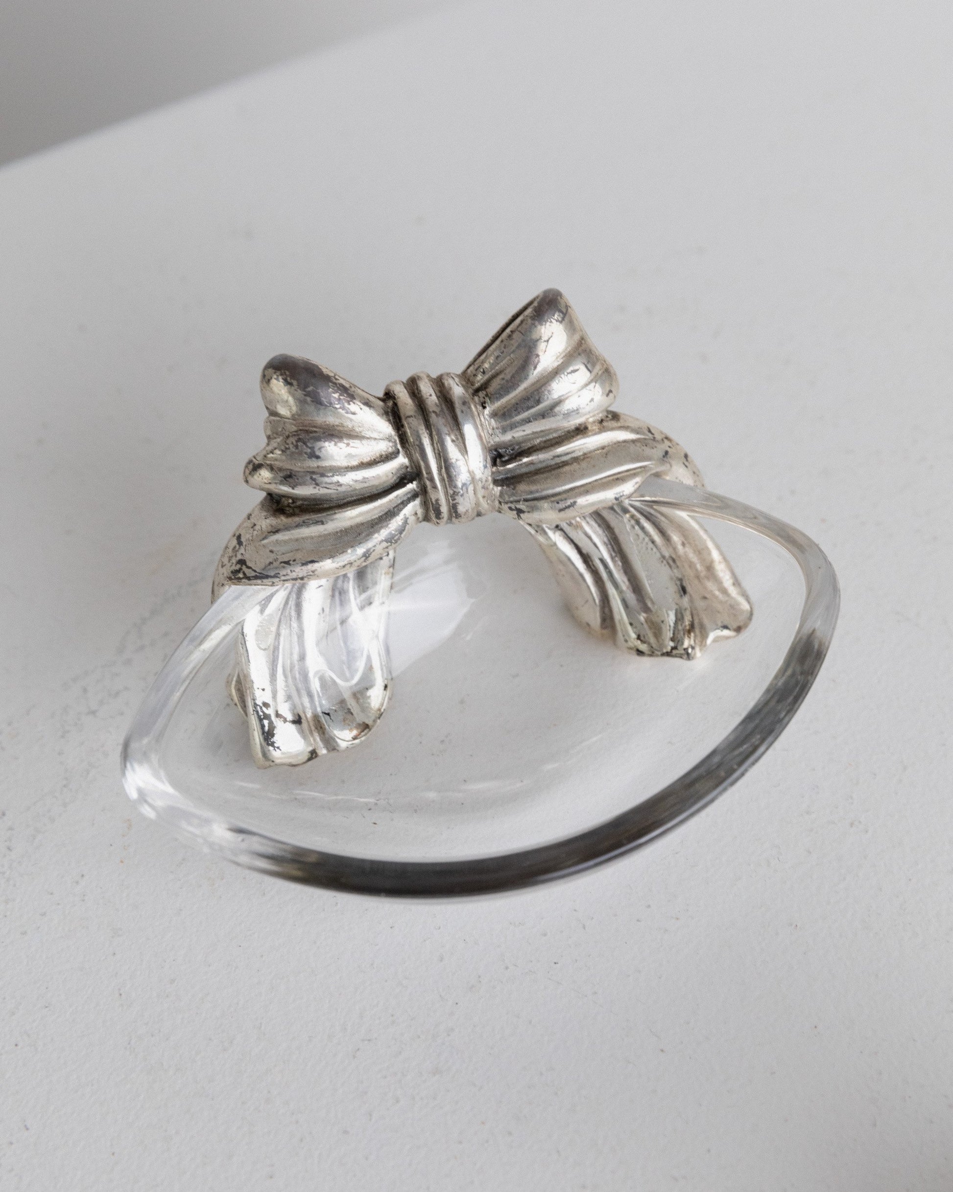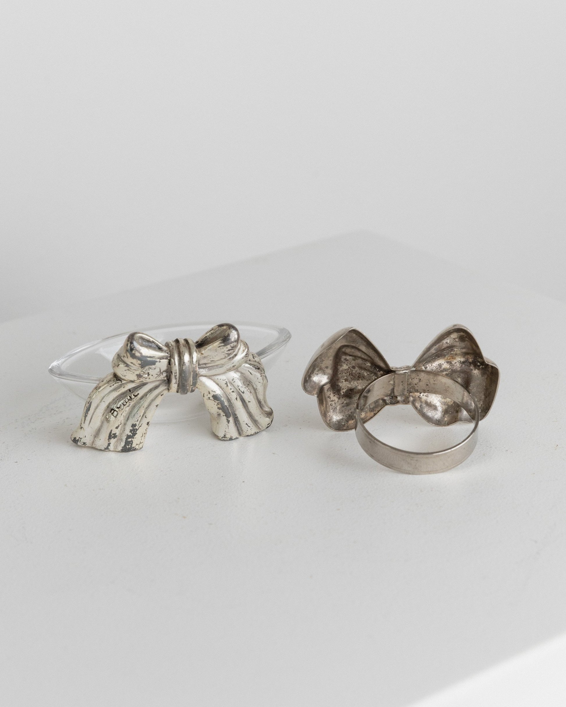 Entdecke die zeitlose Eleganz der 1960er Jahre mit diesem Set aus zwei Vintage-Flaschenzubehörteilen. Diese versilberten Accessoires aus Italien verleihen jeder Weinflasche einen Hauch von Raffinesse. Das Set besteht aus einer Glas-Schale mit einer versilberten Schleife und einem Ring, der perfekt auf den Flaschenhals passt. Ideal als Geschenk, besonders in Kombination mit hochwertigen Wein- oder Likörflaschen.