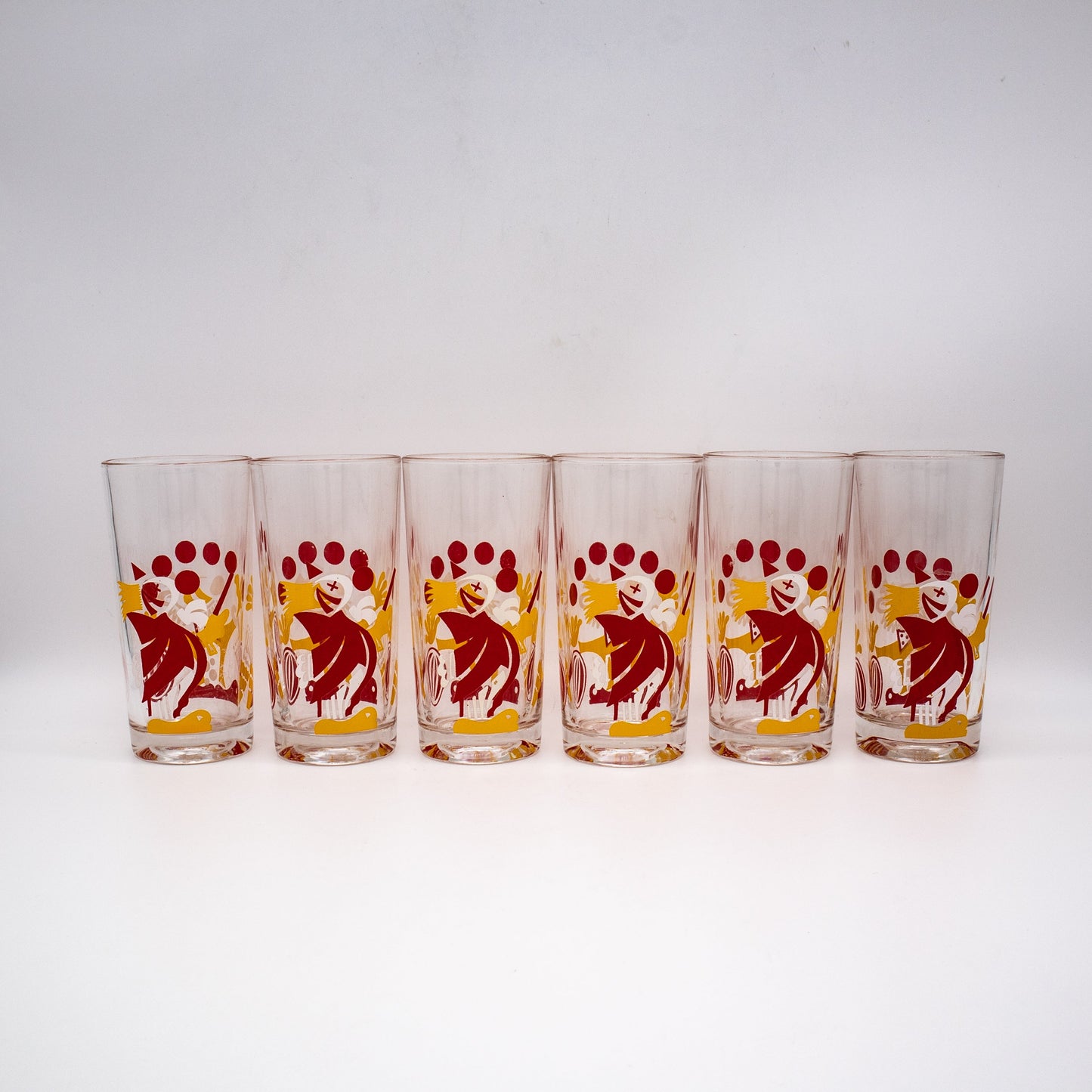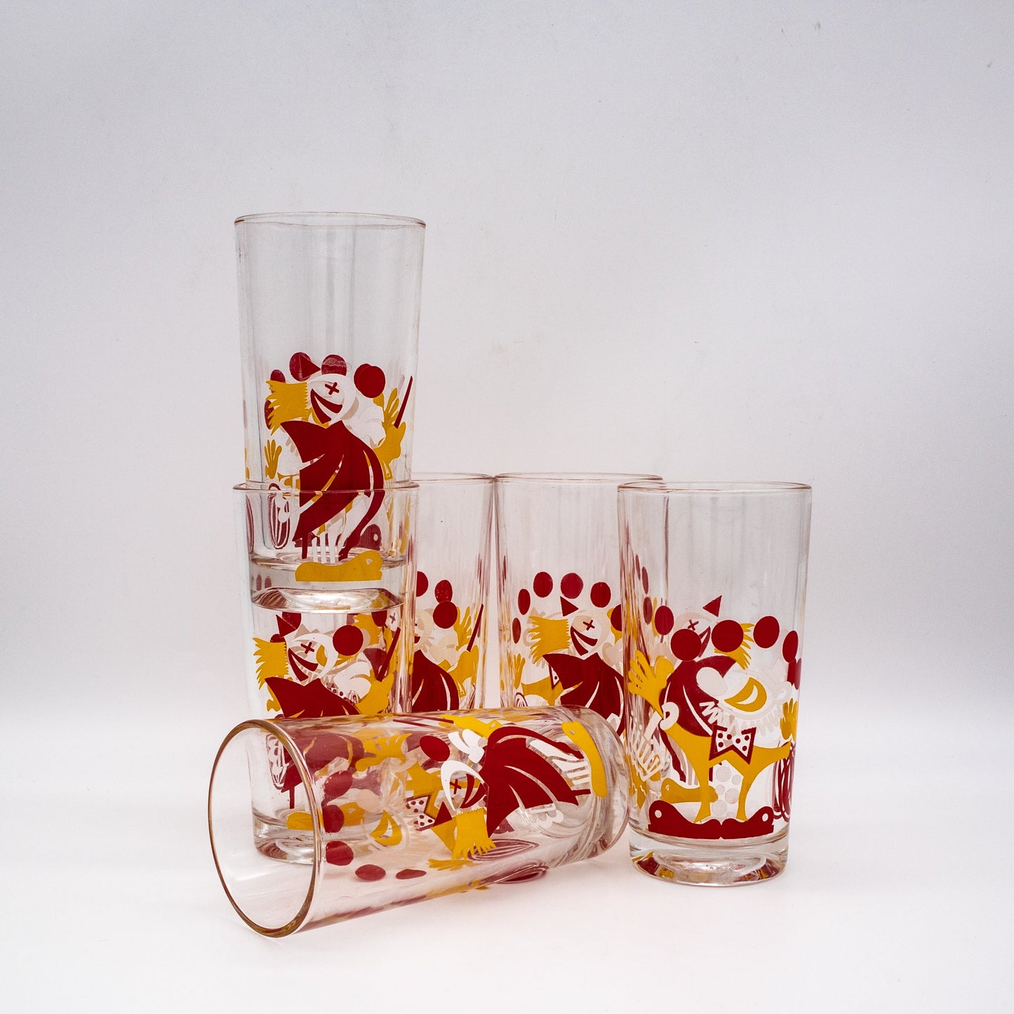 Entdecke das charmante Vintage Glas mit Clownmotiven Set von 2, das einen Hauch von Nostalgie in Dein Zuhause bringt. Diese einzigartigen Saftgläser stammen aus den späten 1950er Jahren und sind ein perfektes Beispiel für mid century modern Design. Die fröhlichen Clownmotive in Rot, Gelb und Weiß verleihen jedem Getränk eine spielerische Note und machen sie zu einem echten Hingucker auf jedem Tisch.