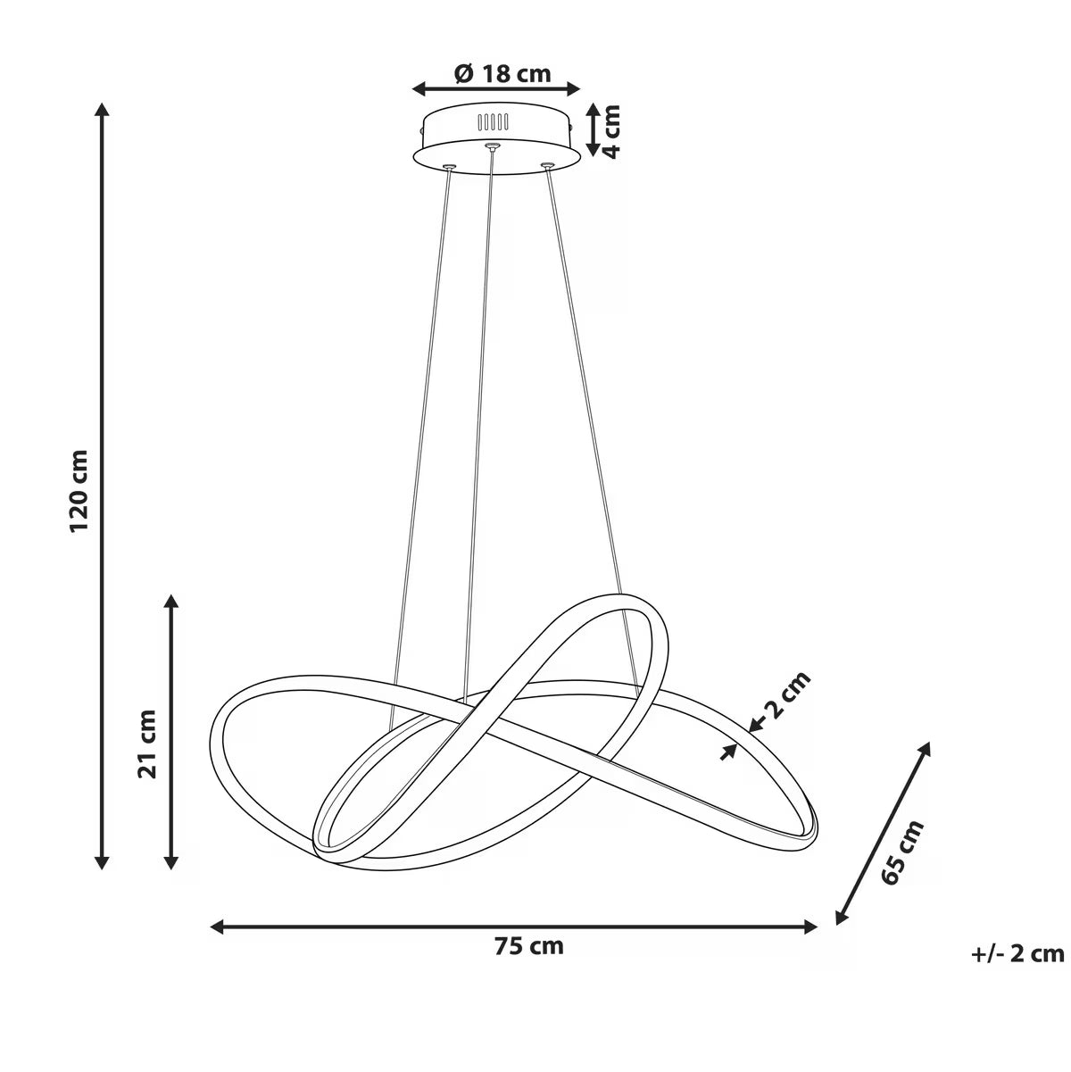 Die Hängeleuchte Tumen von Beliani zeichnet eine schlanke, in sich gedrehte Schlaufe aus Aluminium. Die glänzend goldfarbene Oberfläche reflektiert weich. Das integrierte LED-Band gibt warmweißes Licht ab und verteilt es gleichmäßig. Leicht im Gewicht, klar in der Linie. Über dem Esstisch oder im Entrée setzt sie einen ruhigen, skulpturalen Akzent. Die Kabellänge lässt sich anpassen. Transparentes Kabel und Deckenabdeckung sorgen für einen aufgeräumten Abschluss. Ein zeitgenössisches Stück mit dekorativer Präsenz und funktionaler Helligkeit. Mit 3519 Lumen erhellt sie den Raum ohne zu blenden.