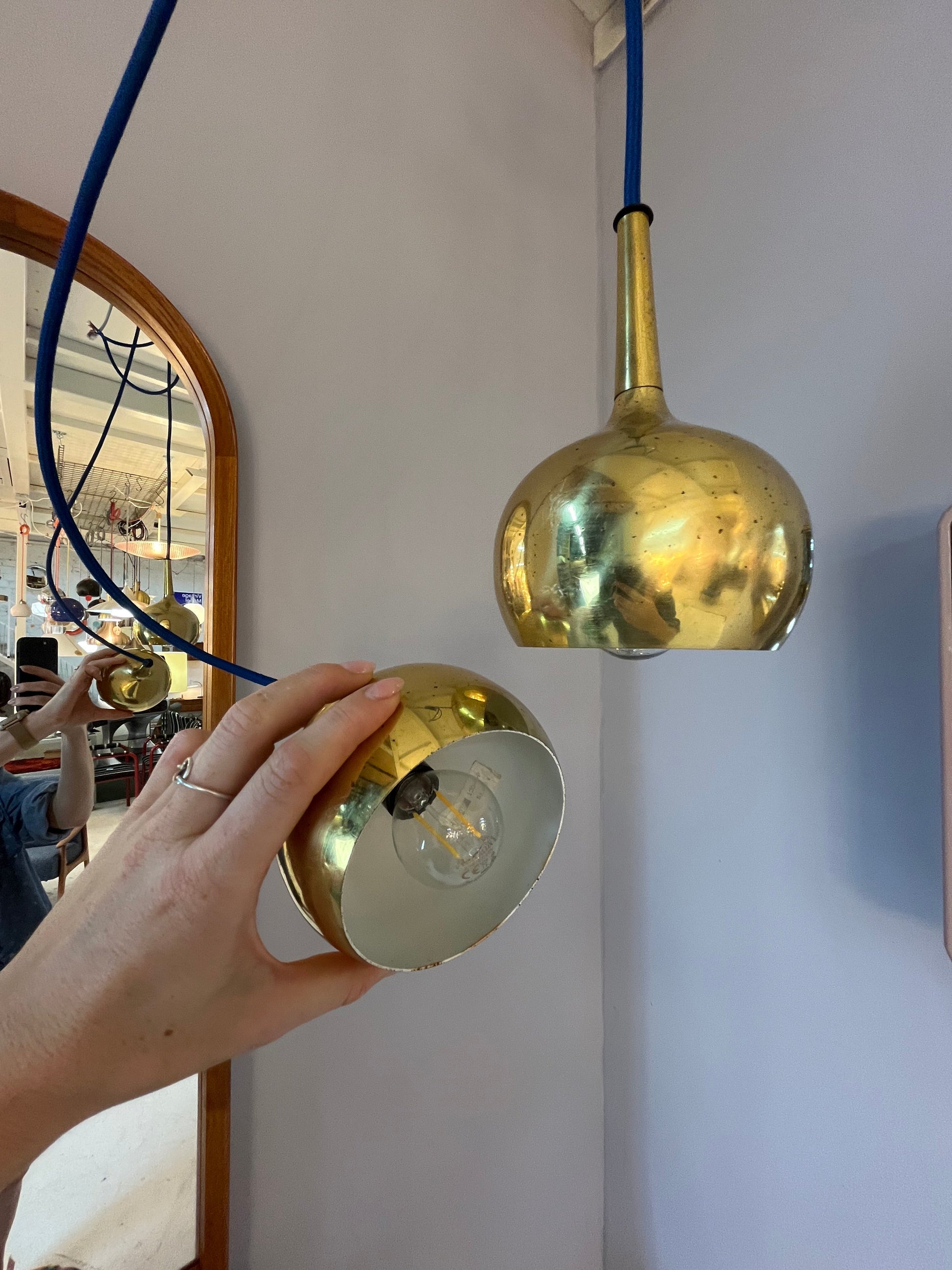 Die Vintage Hängelampe aus Messing von Hans-Agne Jokobsson vereint skandinavische Eleganz mit zeitlosem Design. Die tropfenförmige Form und die warme, goldene Oberfläche machen sie zu einem stilvollen Highlight in jedem Raum. Das hochwertige Messing sorgt für eine angenehme Lichtstimmung und entwickelt mit der Zeit eine charaktervolle Patina. Ideal als Blickfang über Sideboards, Tischen oder im Eingangsbereich.