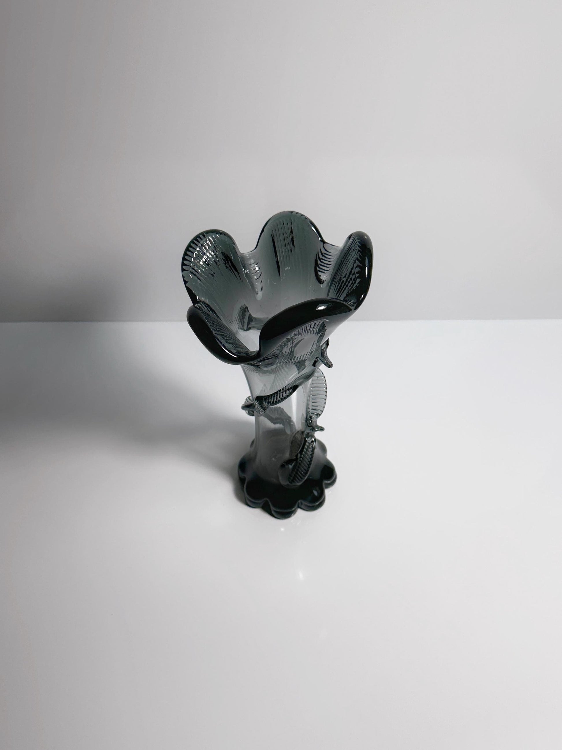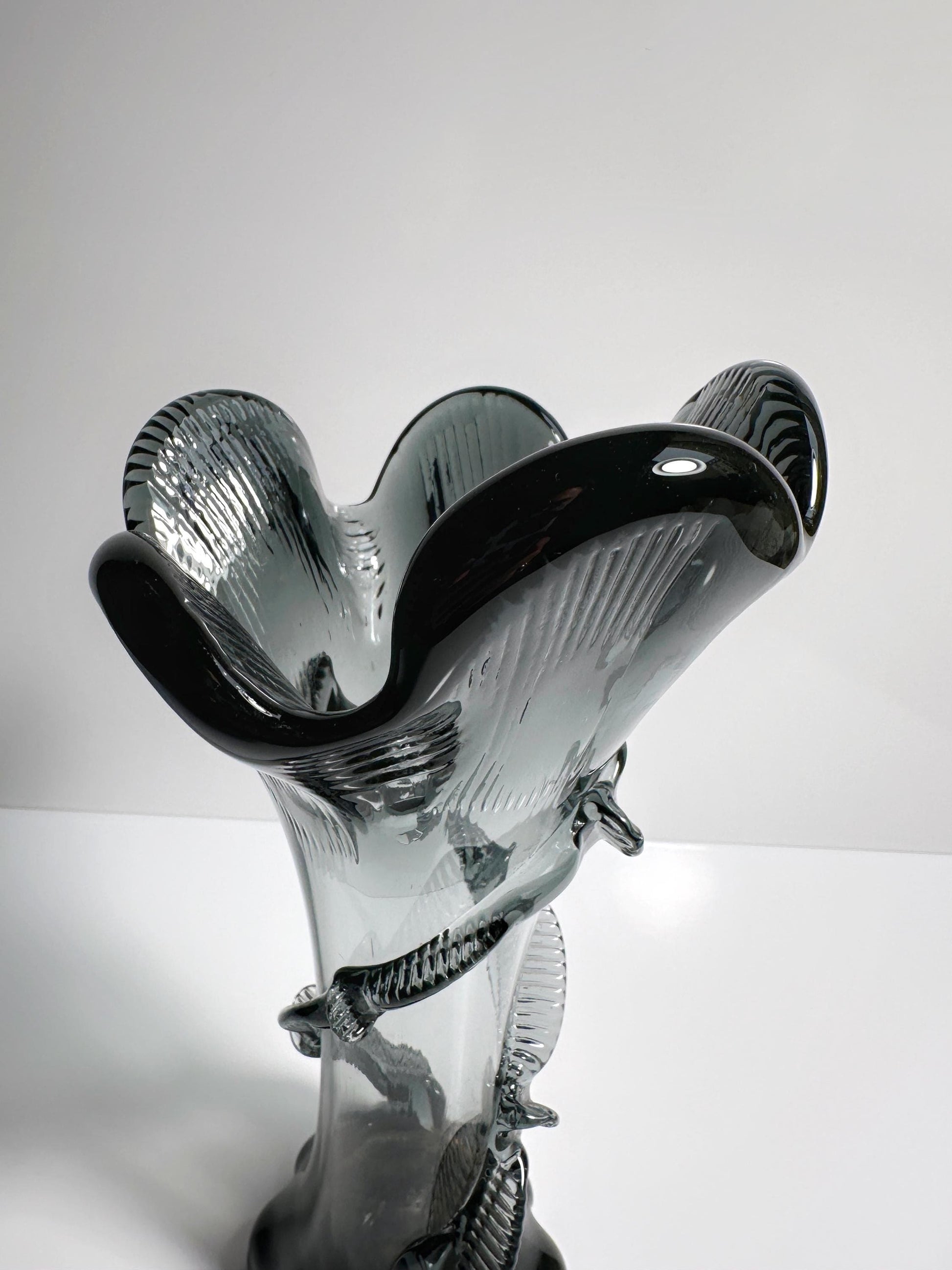 Entdecke eine außergewöhnliche Vintage Glasvase aus der Zeit des Jugendstils, gefertigt um 1900–1910 von Franz Welz in Böhmen. Diese seltene Rarität besticht durch ihr einzigartiges Design, das an die berühmten "Tango Vasen" von Loetz erinnert. Die Vase wurde in aufwendiger Handarbeit aus grauem Glas mit zartem Blaustich gefertigt und überzeugt durch ihre sehr gute Qualität und höchste Verarbeitungskunst. Ein echtes Highlight für Liebhaber von mid century modern und Space Age Dekor.